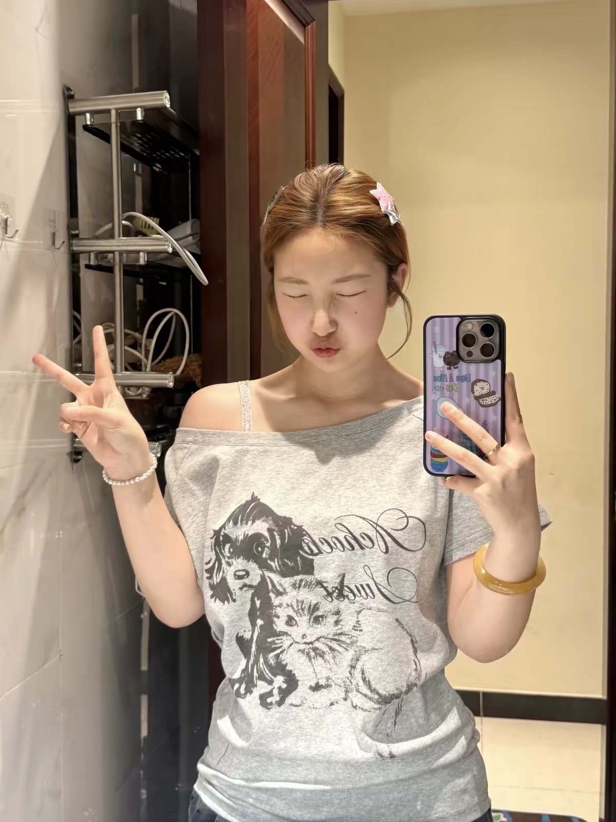 220 그램 92 면 8 암모니아 Lun 아메리칸 핫걸 비스듬한 어깨 알파벳 프린트 반팔 티셔츠 여성