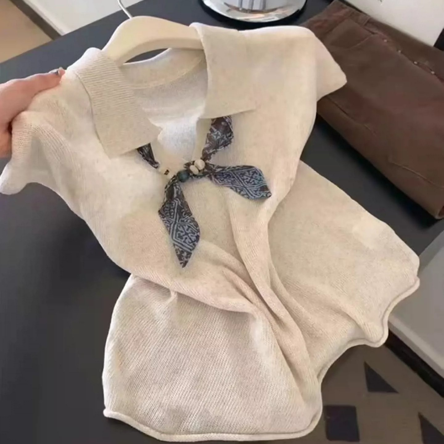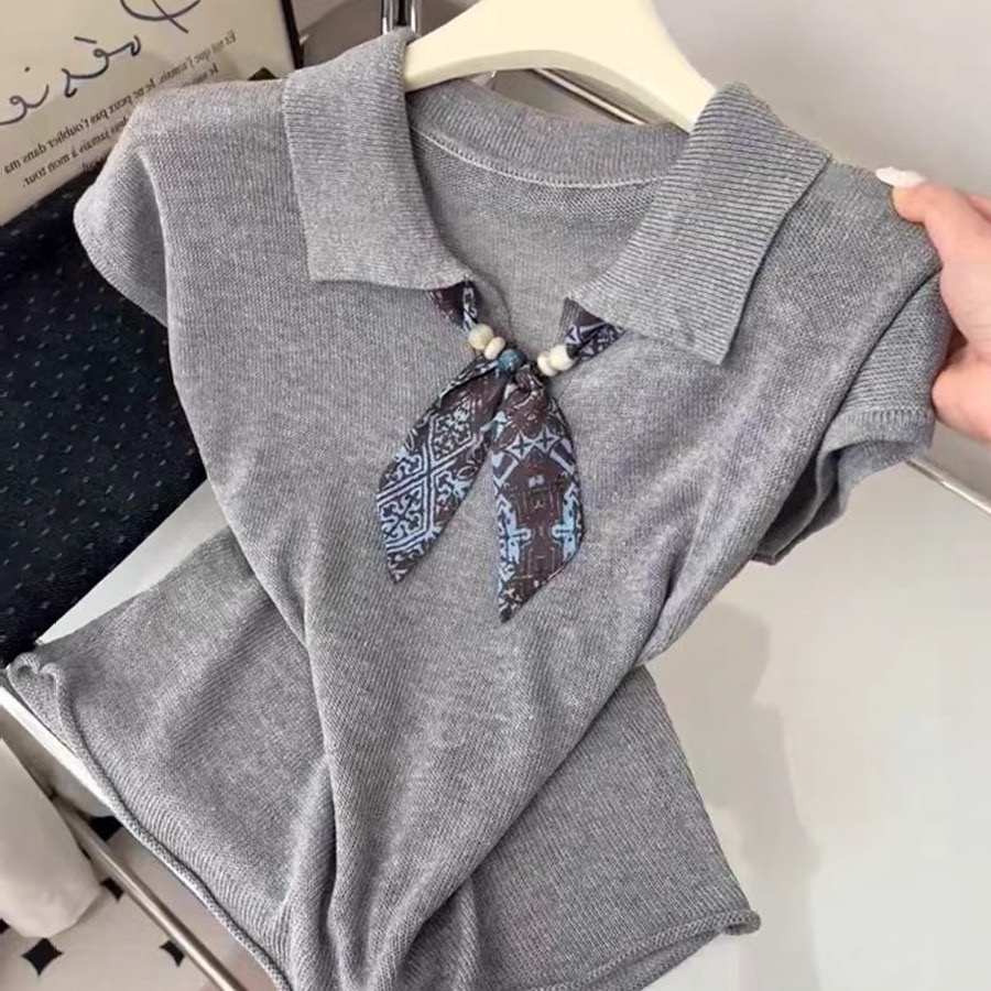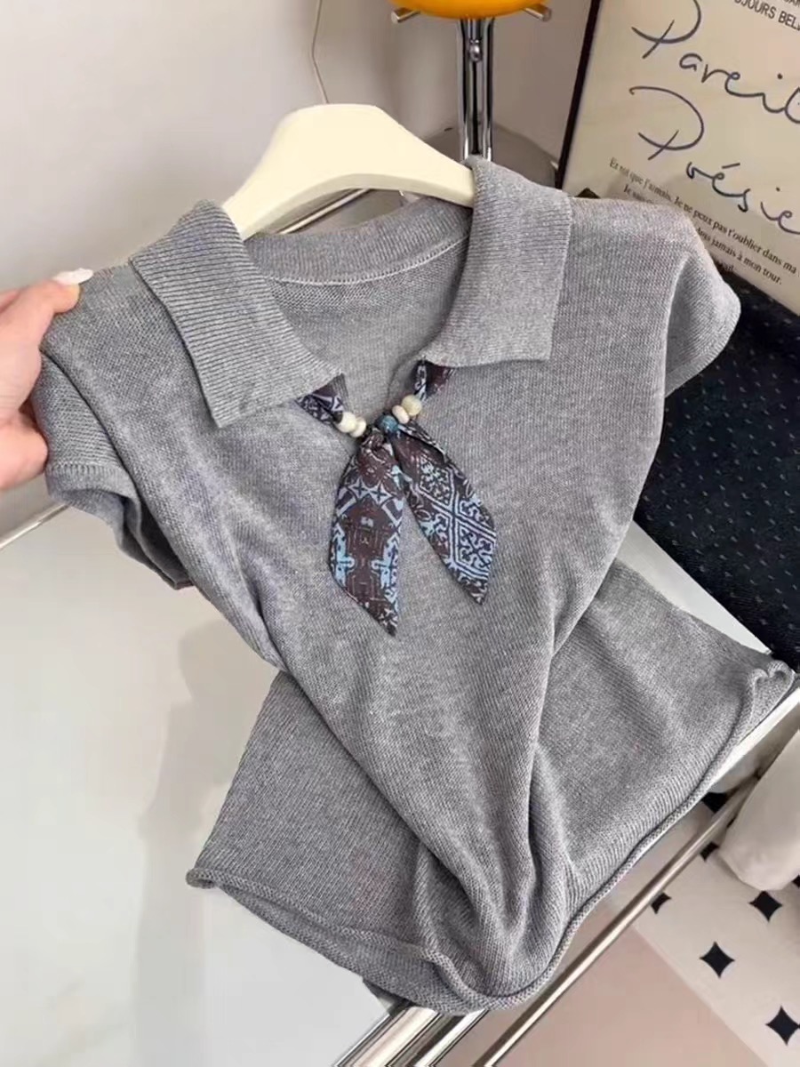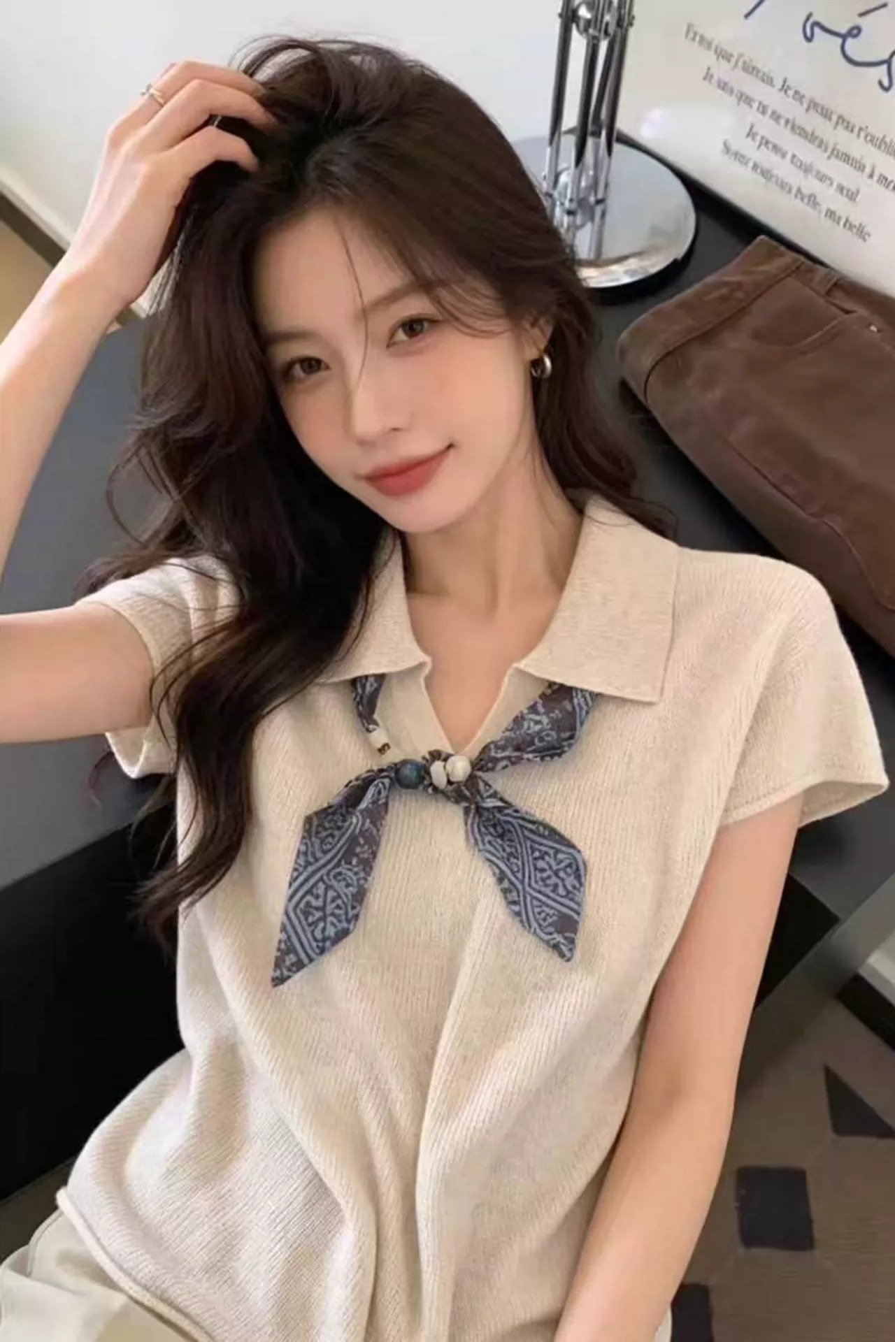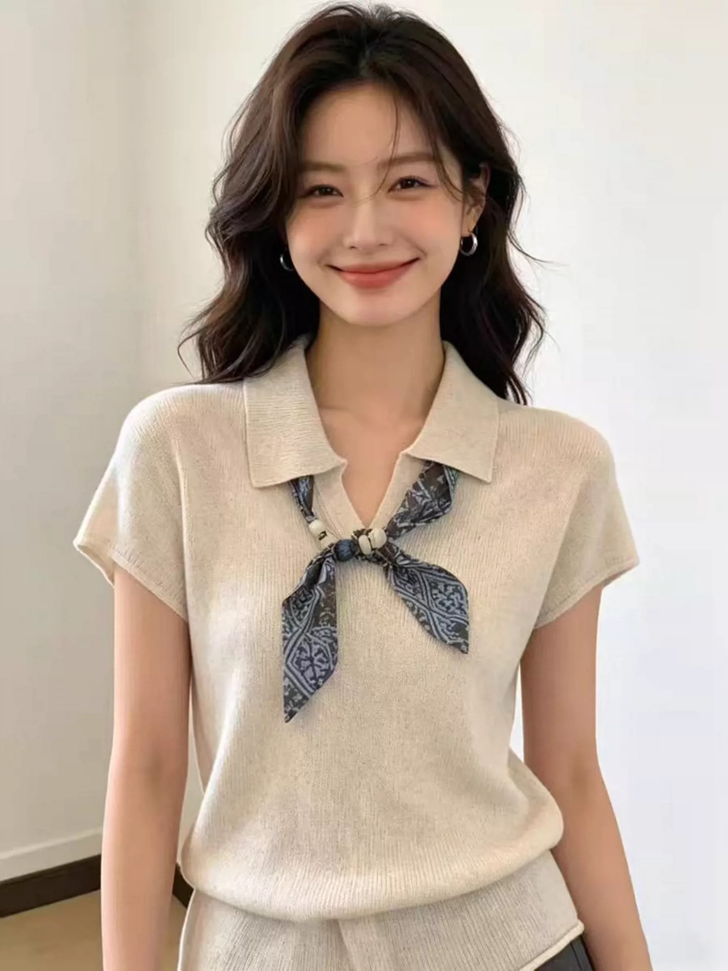 한 부서 디자인 센스 POLO 칼라 스카프 반팔 니트 스웨터 봄 여름 새로운 고급 센스 패션 품격 얇은 스타일 맨위