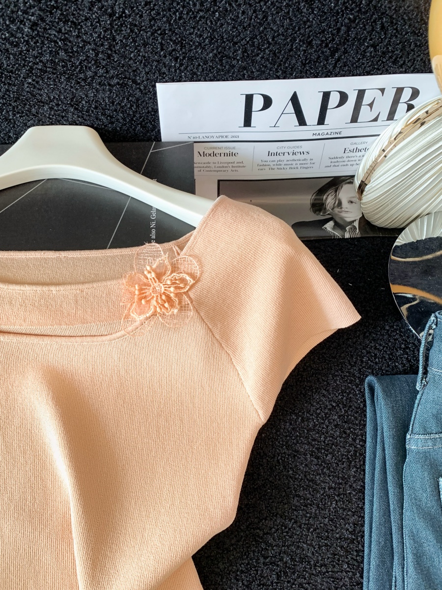 실사 2026 여름 새로운 니트 티셔츠 진주 3 차원 꽃잎 몸매 가꾸기 반팔 맨위 빛 럭셔리 고급 센스