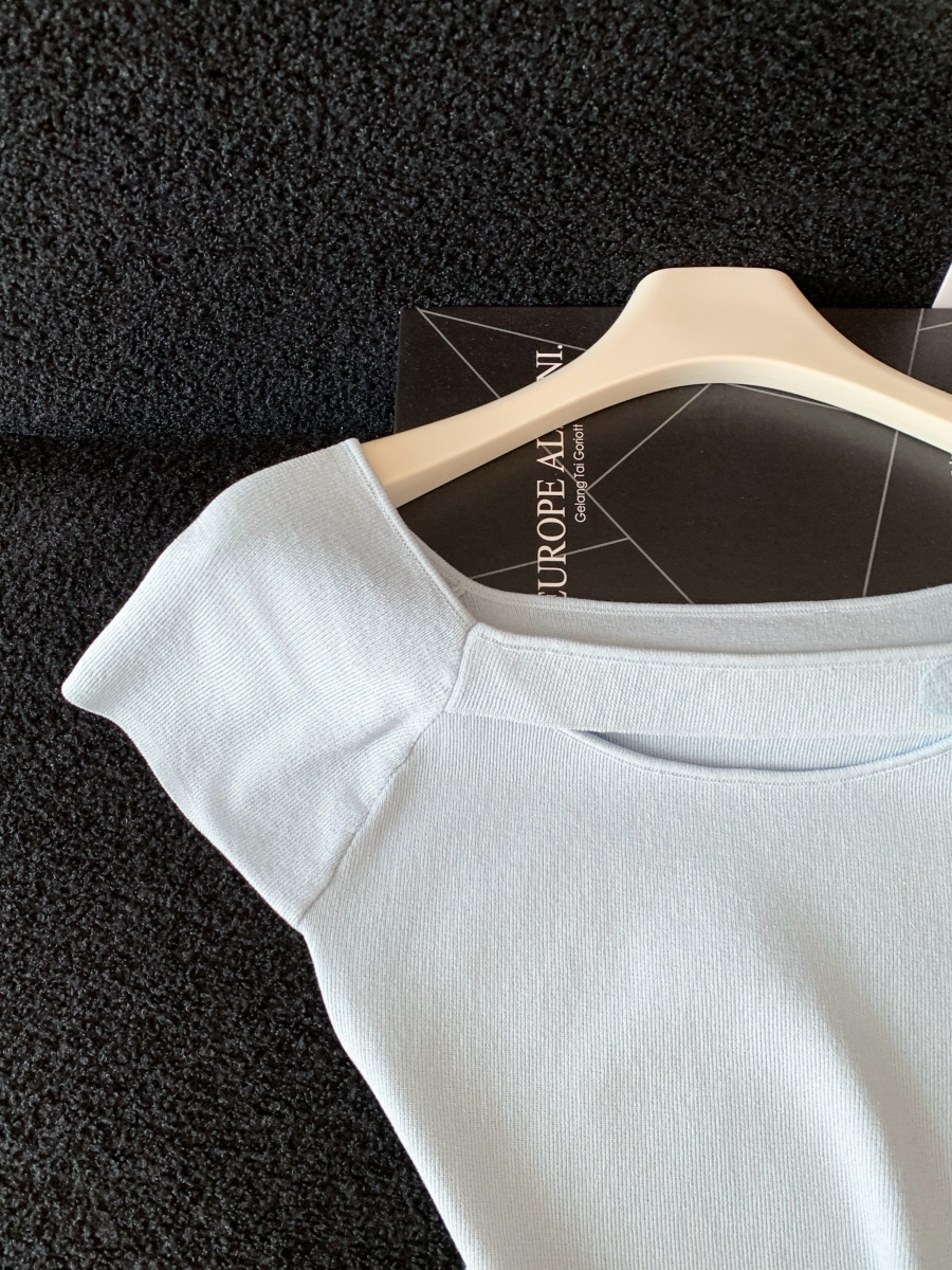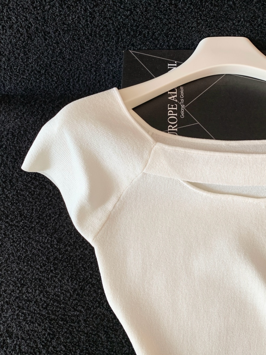 실사 비스듬한 어깨 디자인 센스 반팔 니트 여름 새로운 불규칙 허리 수축 슬림해 보이는 맨위