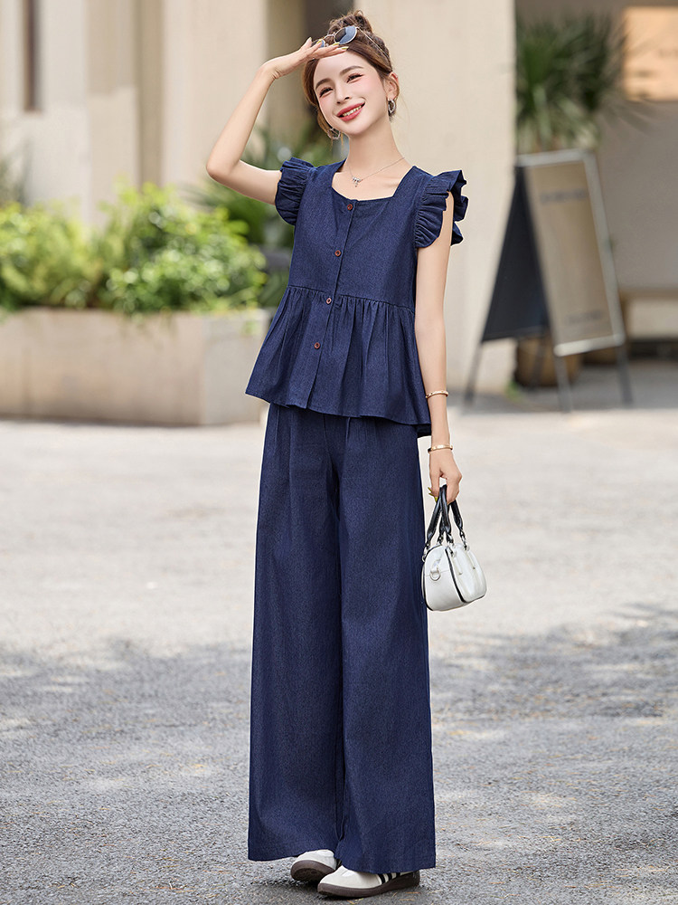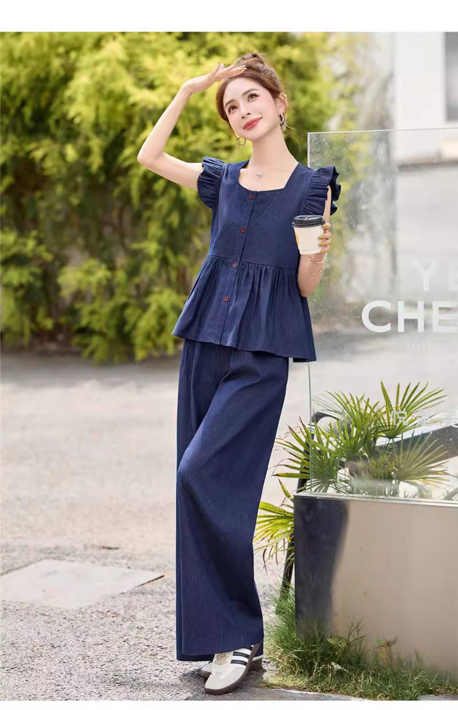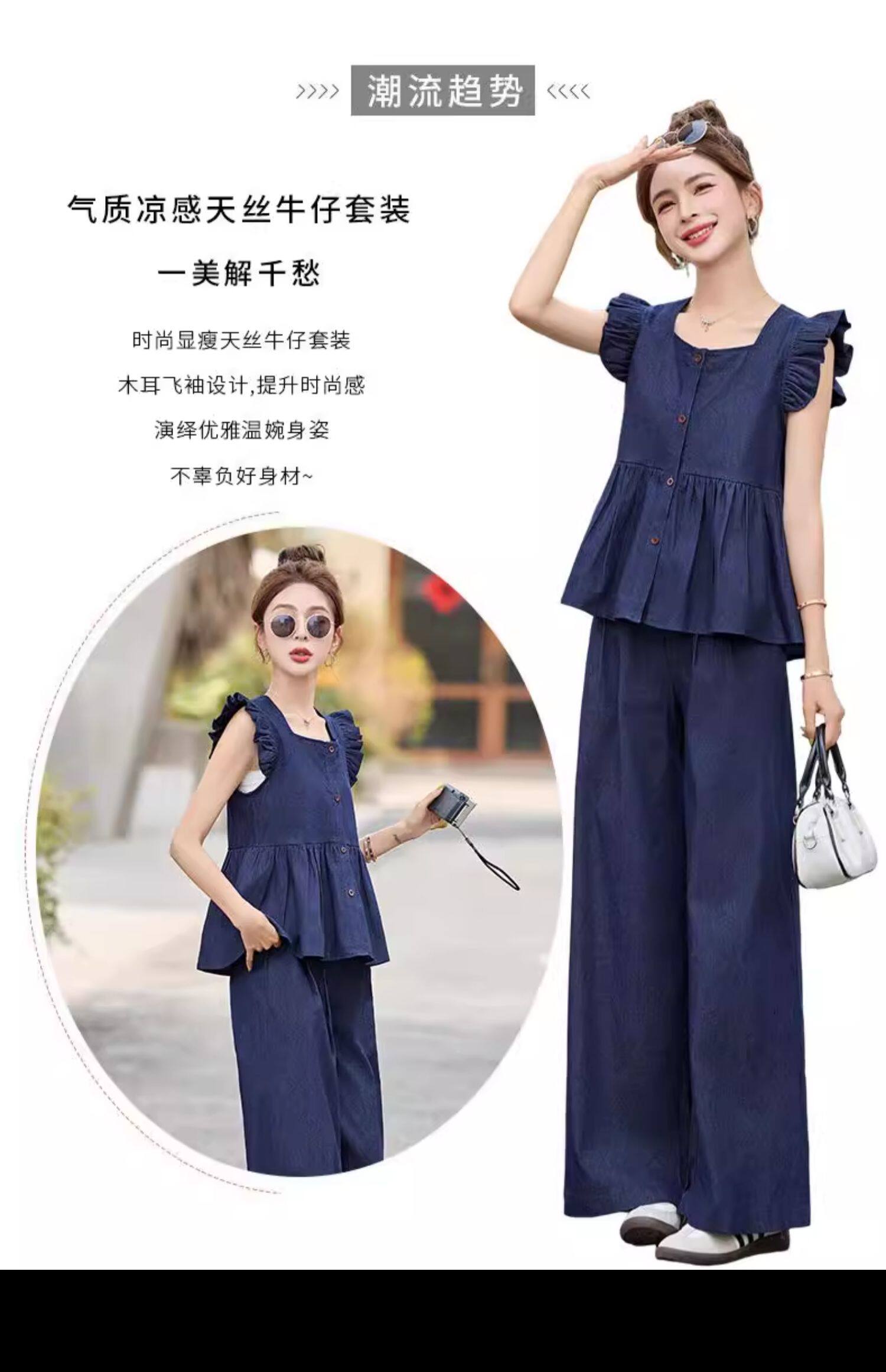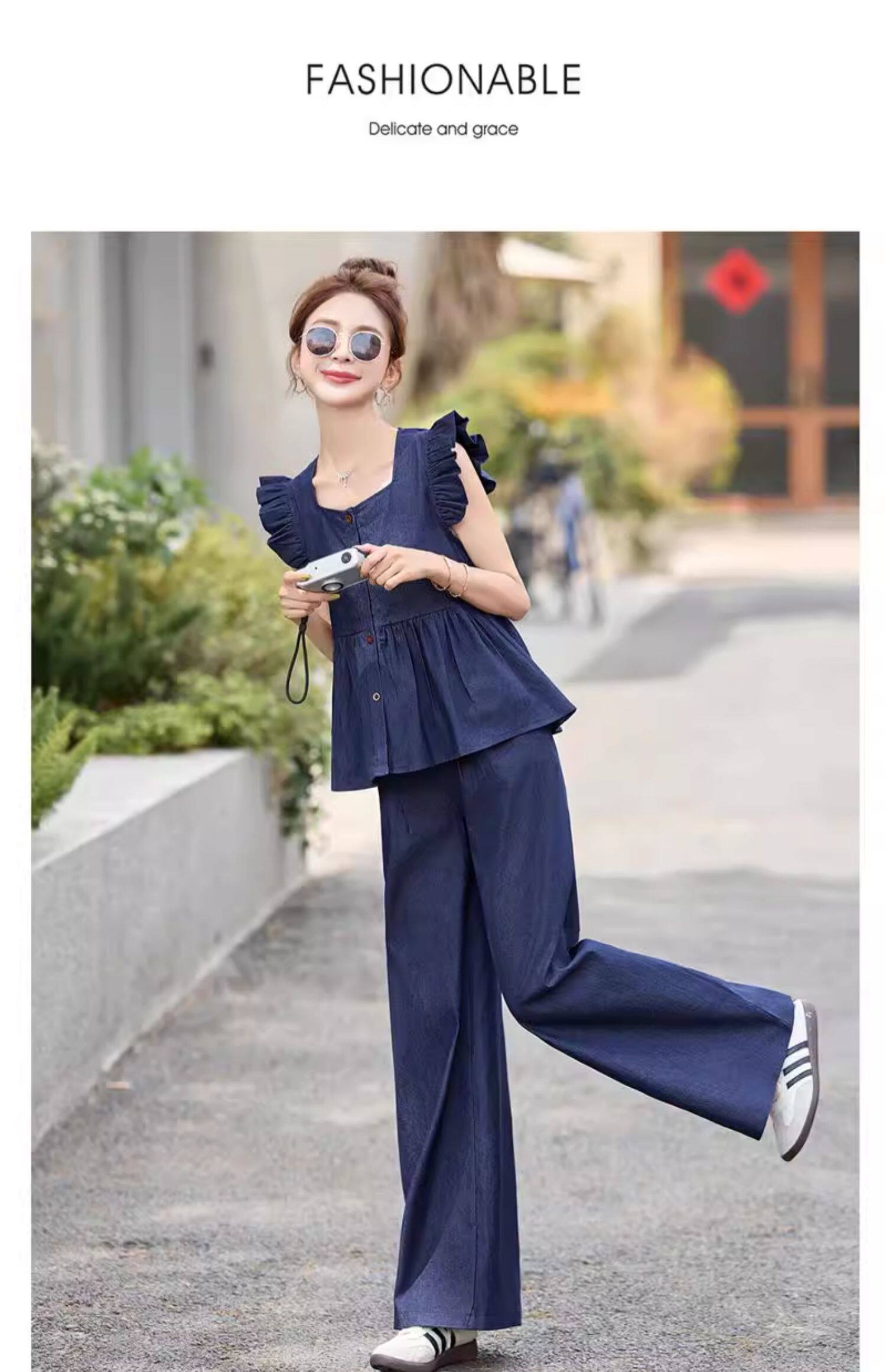 실사 2026 불규칙 디자인 센스 셔츠 여름 얼음 실크 얇은 스타일 느긋한 하이웨이스트 슬림해 보이는 와이드 레그 팬츠 세트