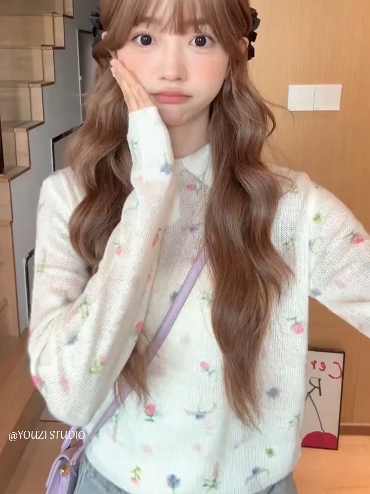 한 부서 새로운 꽃무늬 호흡 센스 착용 가져 가라. 소녀 달콤함 니트 스웨터 얕은 봄 다용도 슬림해 보이는 폴로 칼라 얇은 맨위