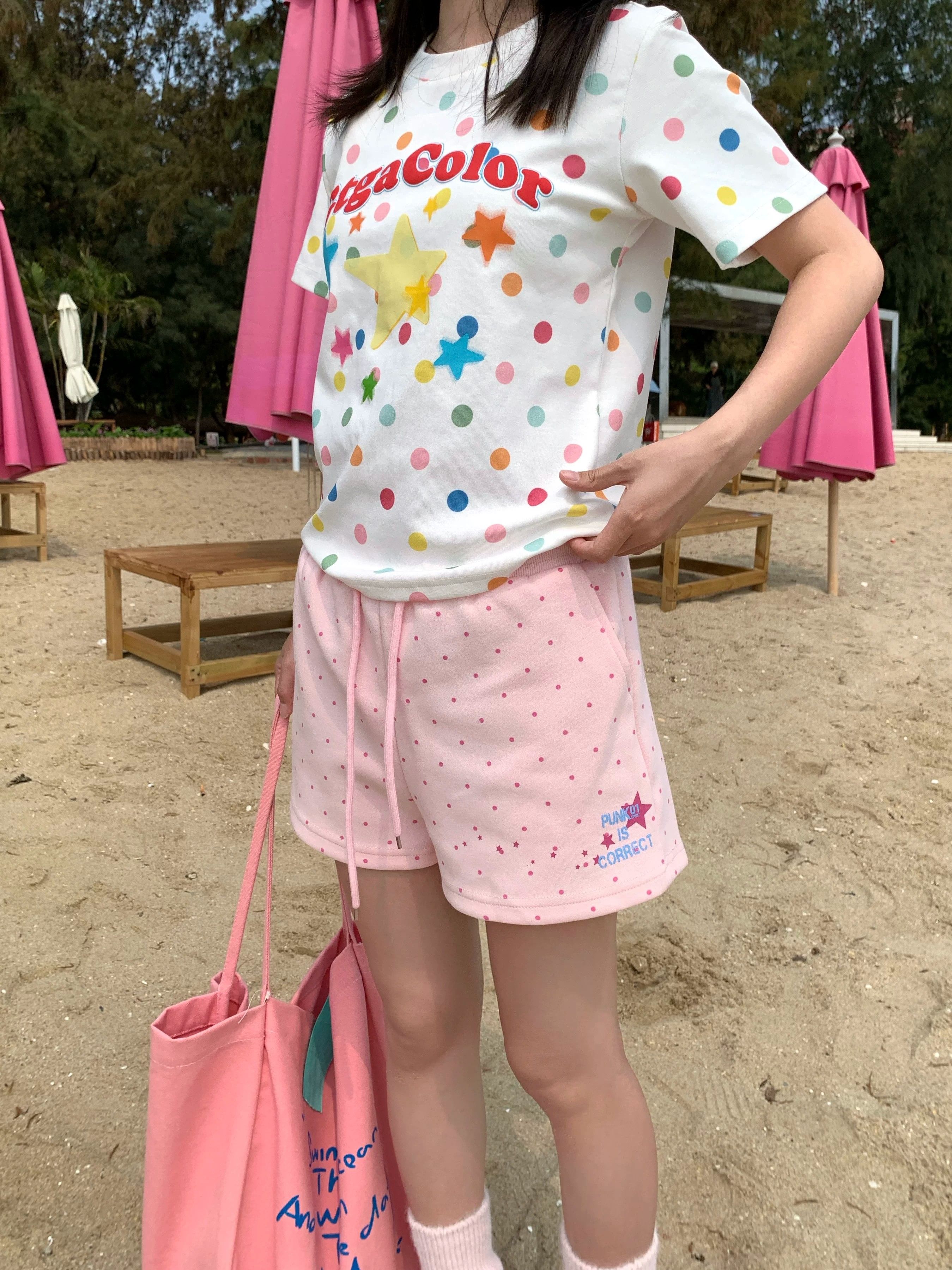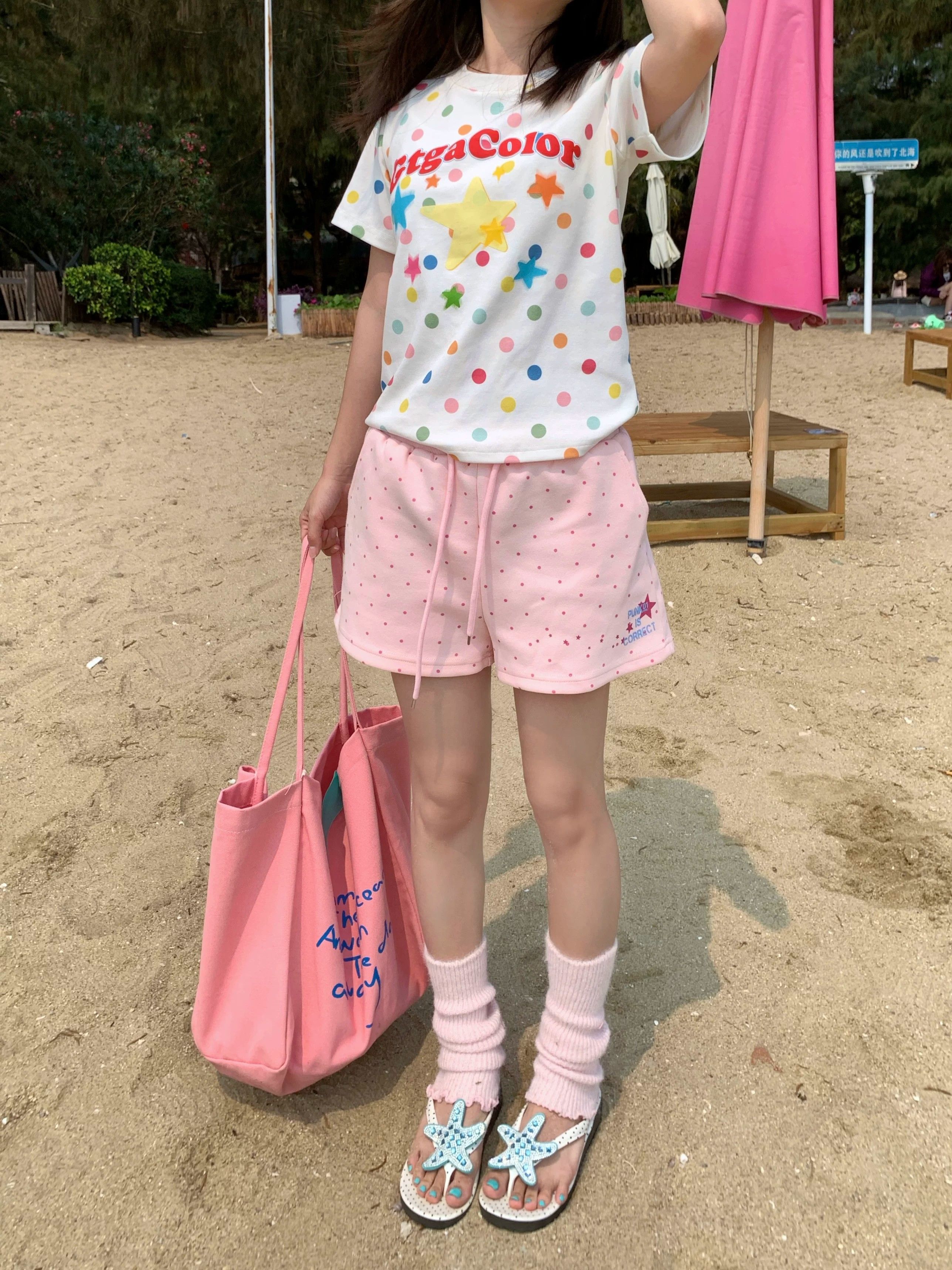 3 차원 허리 머리 조수 브랜드 도트 무늬 프린트 펌프 로프 3 점 바지 여성 2026 여름 핫걸 도파민 스트레이트 반바지