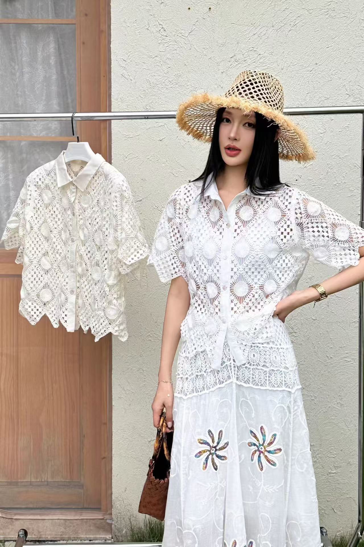 2026 여름 새로운 순면 무거운 작업 니트 큰 진자 롱 스커트 홀로우 아웃 자수 맨위 패션 우아함 투피스 세트