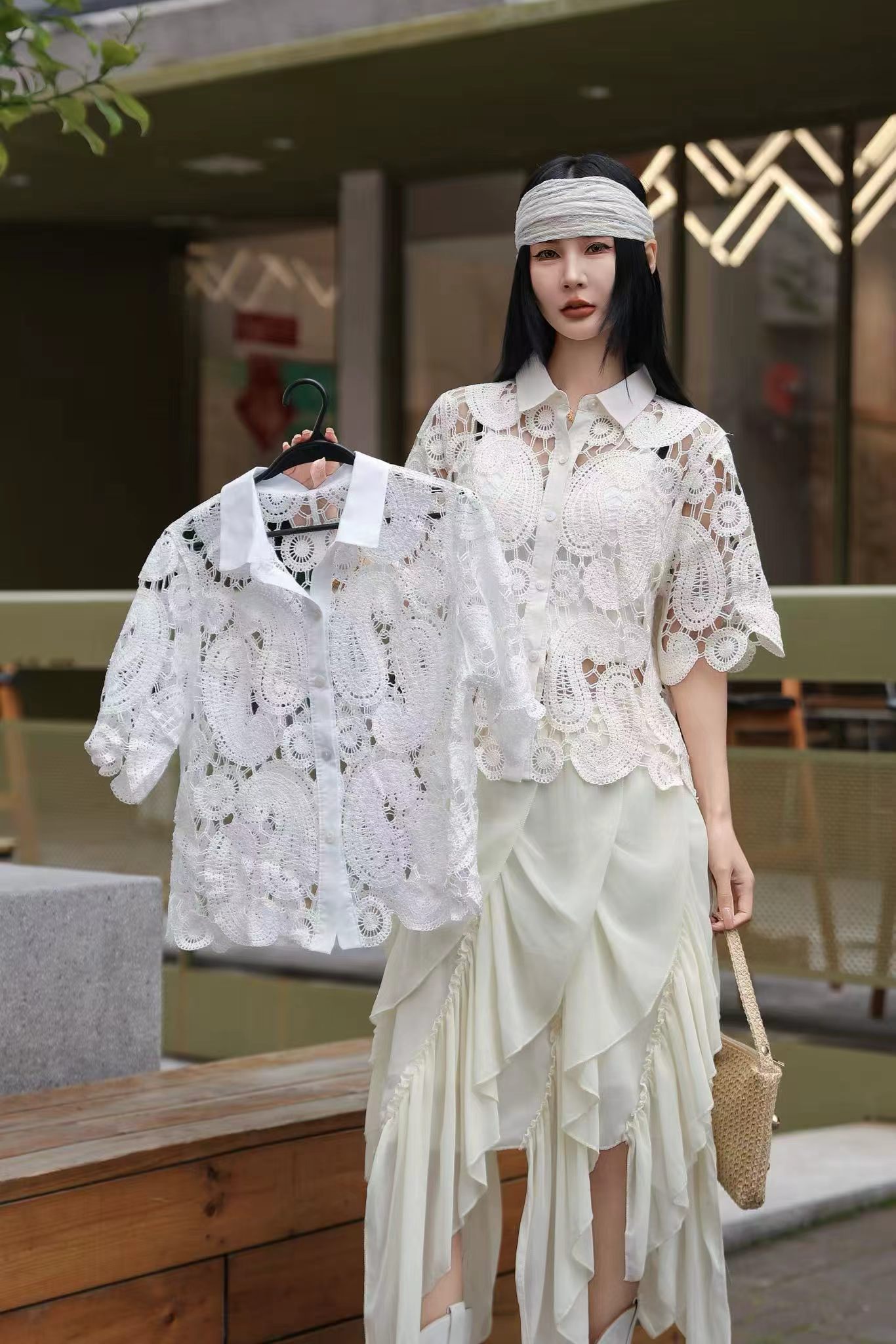 2026 여름 프랑스식 레트로 홀로우 아웃 자수 반팔 여성 셔츠 디자인 센스 작은 대중 고유 한 Chic 쇼트 스타일 맨위