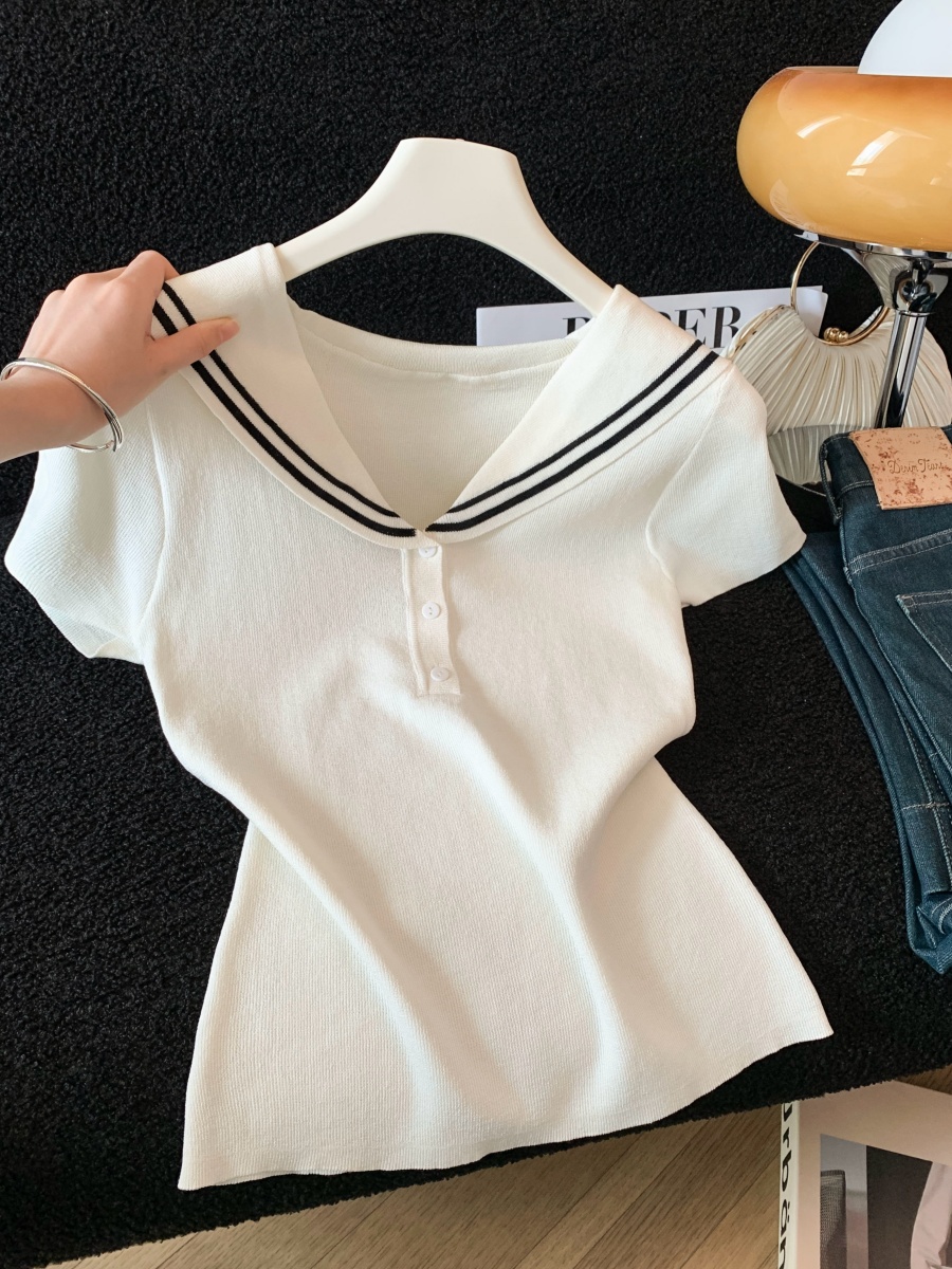 실사 프랑스식 해군 칼라 V넥 얼음 실크 니트 반팔 티셔츠 여성 여름 배색 민소매 조끼 몸매 가꾸기 숄 맨위
