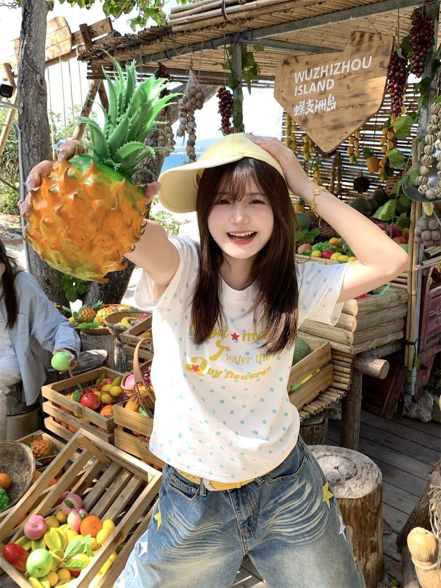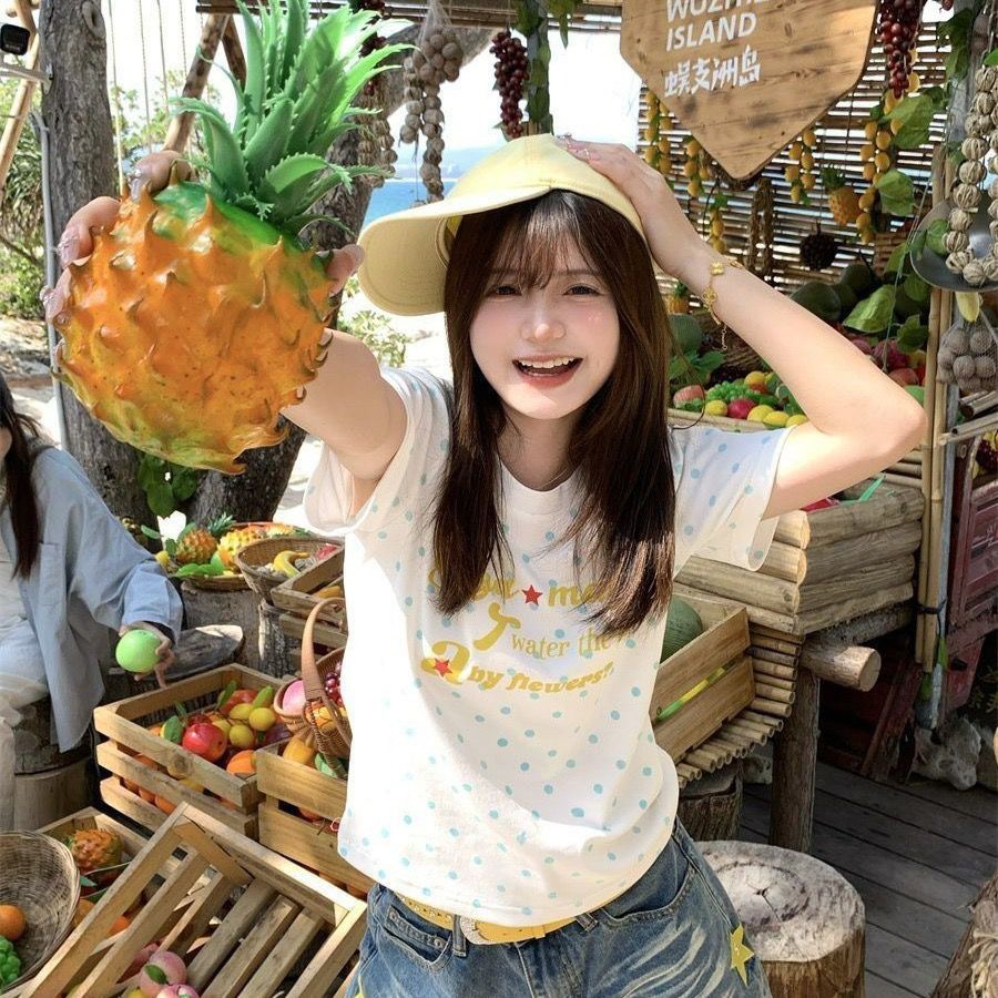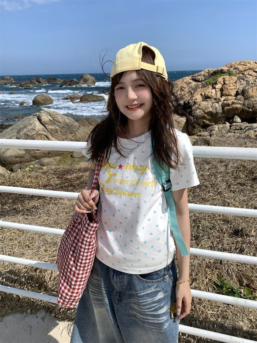 한 부서 달콤한 스타일 도트 무늬 프린트 긍정적 인 어깨 몸매 가꾸기 반팔 티셔츠 여름 새로운 작은 키 착용 가져 가라. 쇼트 스타일 맨위