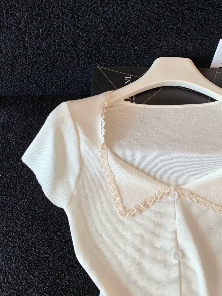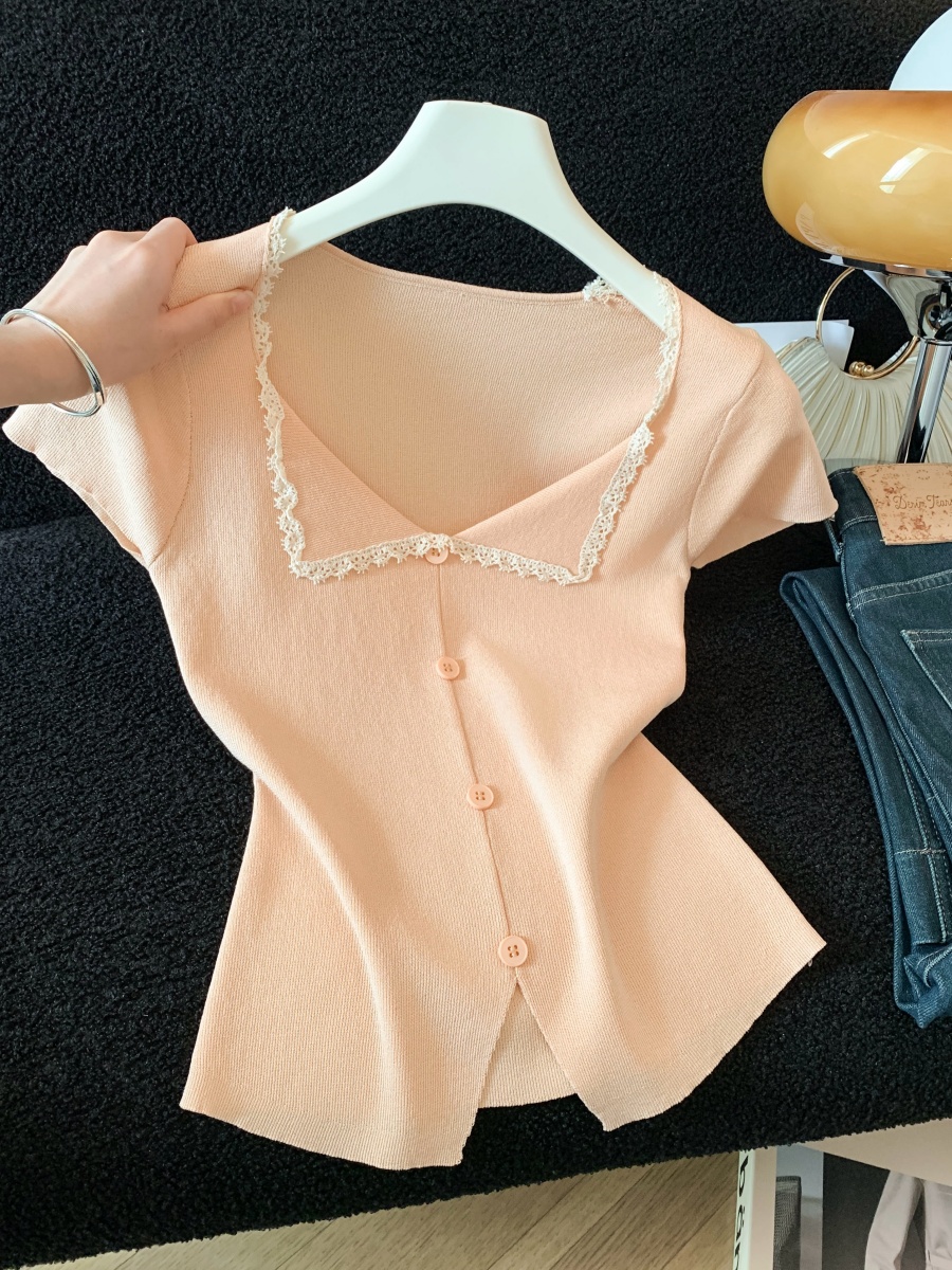 실사 여름 부드러운 레이스 반팔 스트랩 니트 스웨터 몸매 가꾸기 2026 슬림해 보이는 패치워크 새로운 패션 맨위