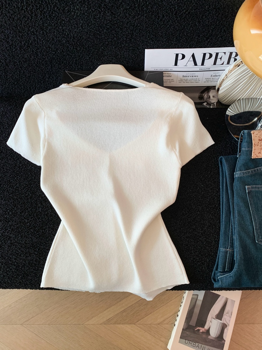 실사 프랑스식 해군 칼라 V넥 얼음 실크 니트 반팔 티셔츠 여성 여름 배색 민소매 조끼 몸매 가꾸기 숄 맨위