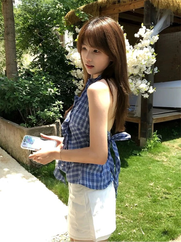 2025 여름 새로운 프랑스식 프릴 파란색 체크무늬 레트로 캐미솔 디자인 센스 민소매 맨위