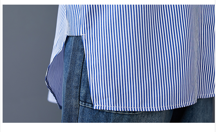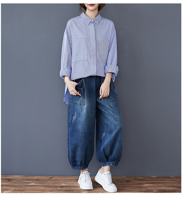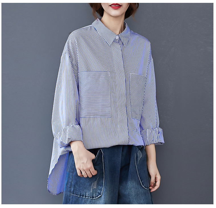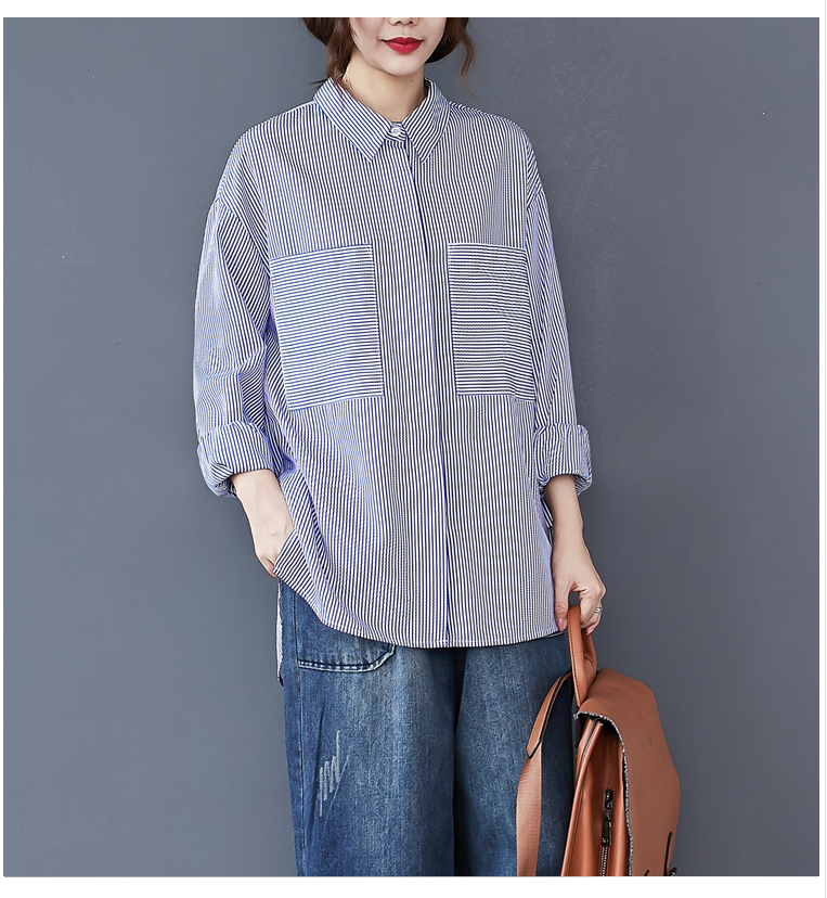 2026 봄 새로운 한국 스타일 문예 빅 사이즈 루즈핏 패치워크 패치 스트라이프 주머니 데님 셔츠 여성 셔츠