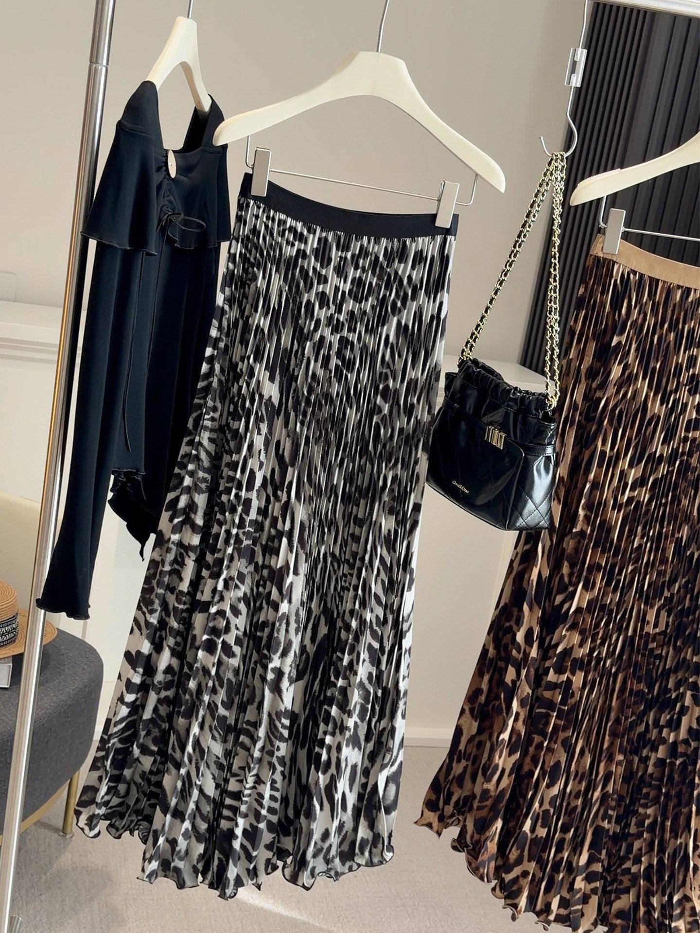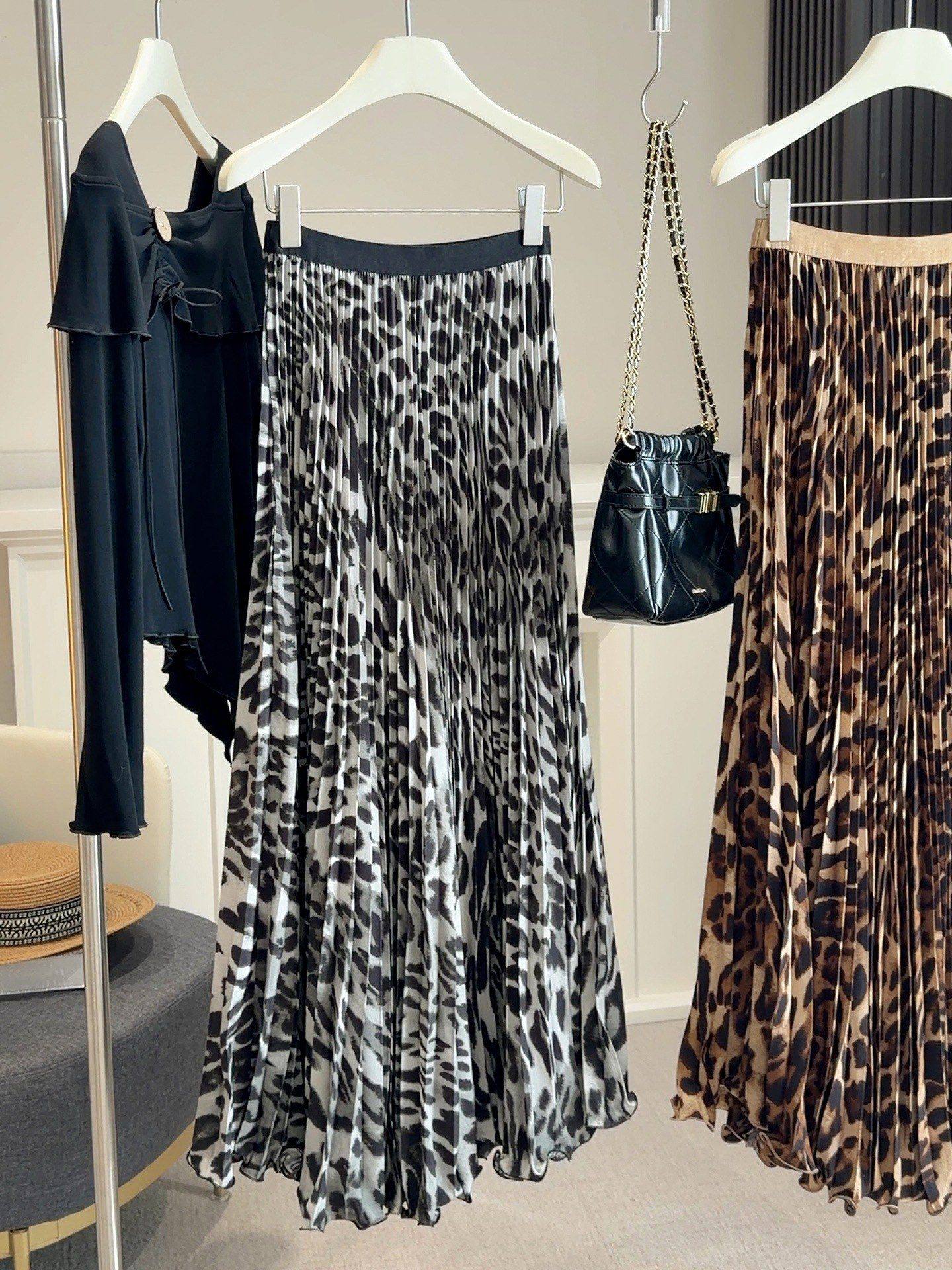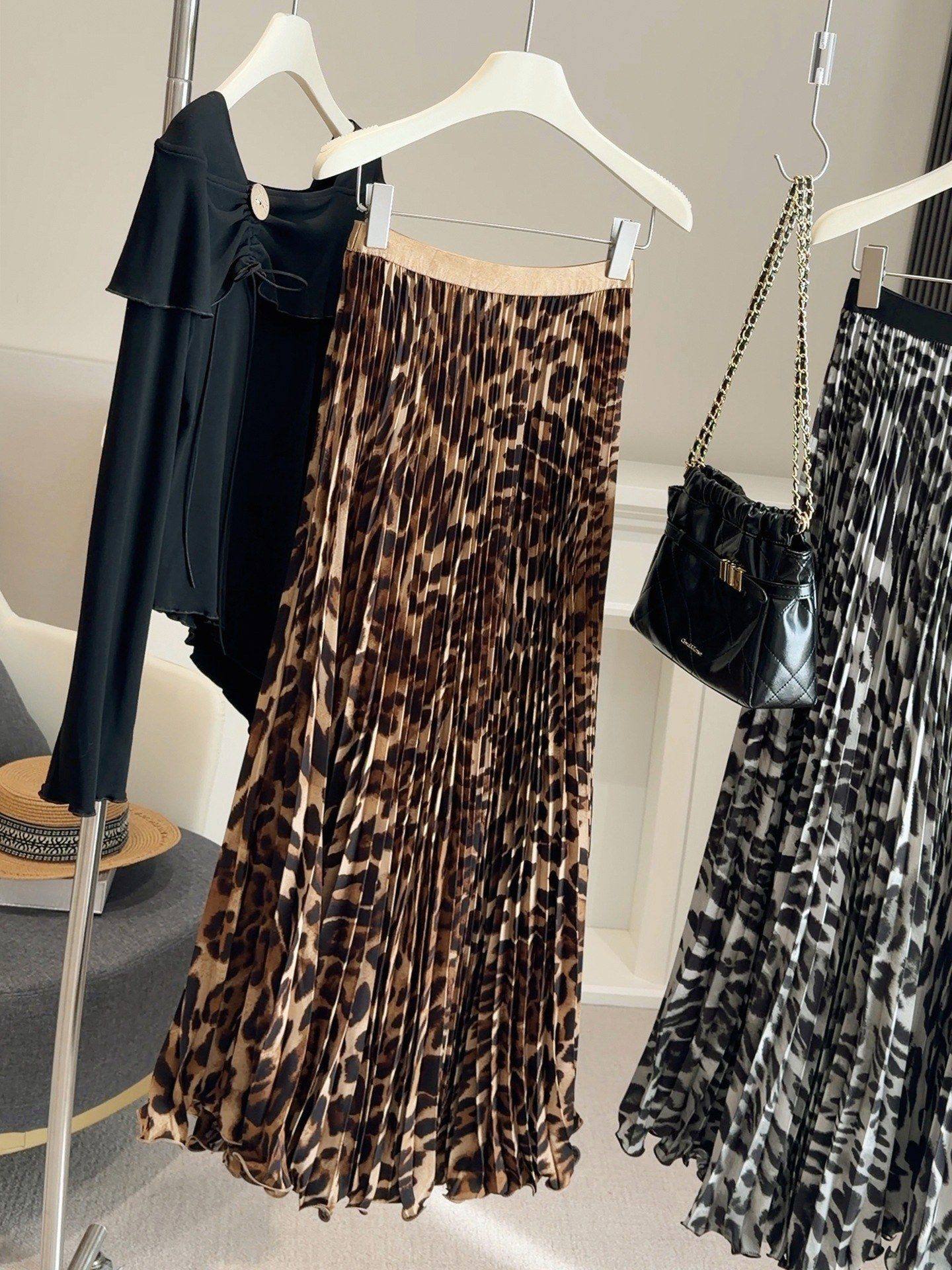 봄 여름 새로운 패션 품격 레오파드 무늬 프린트 플리츠 롱 스커트 여성 도루 가을 센스 플리츠 특대 사이즈 진자 한 마디 반신 스커트