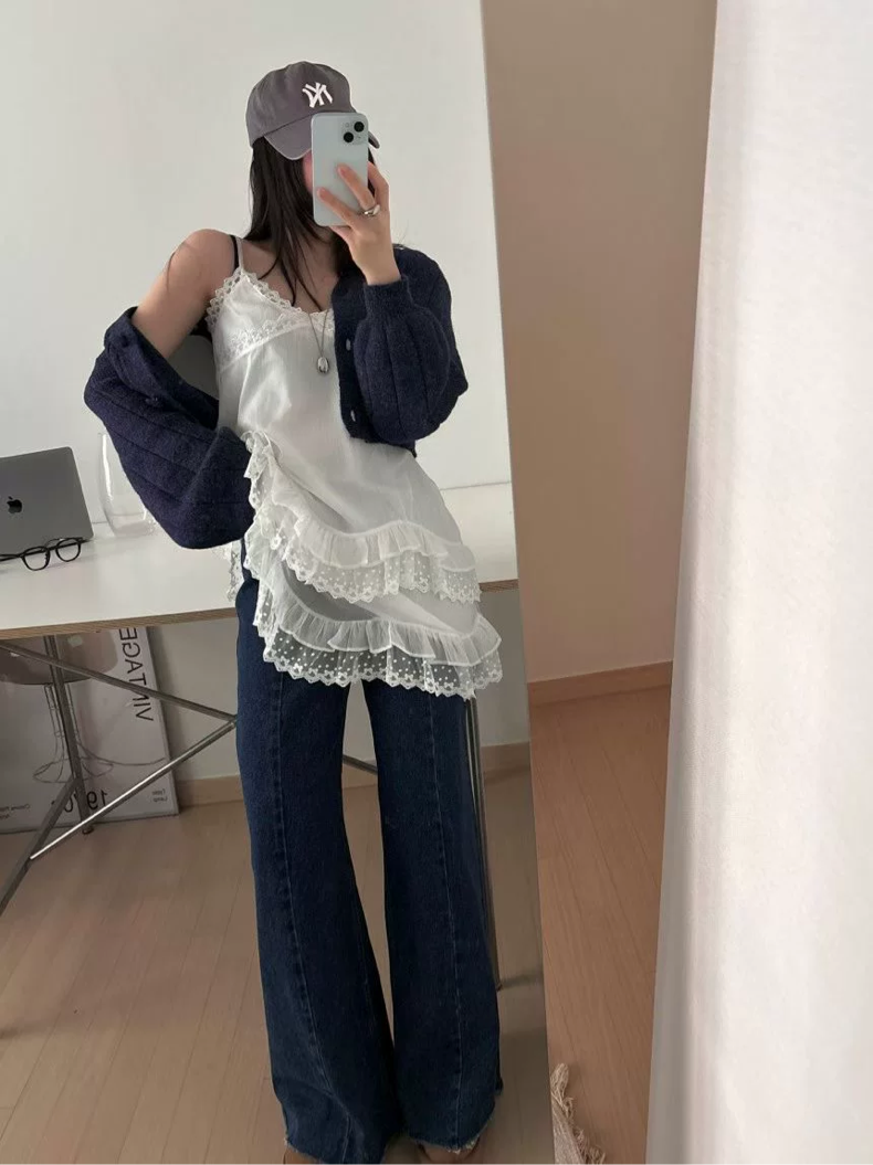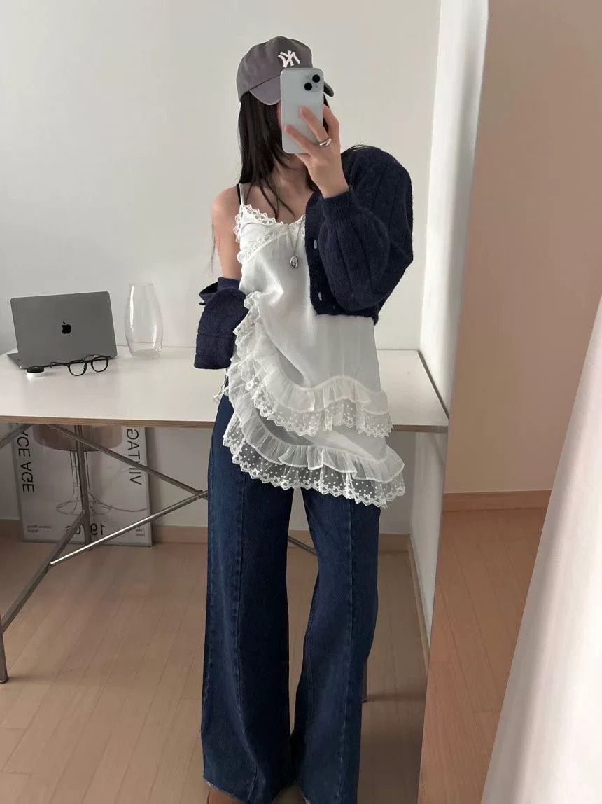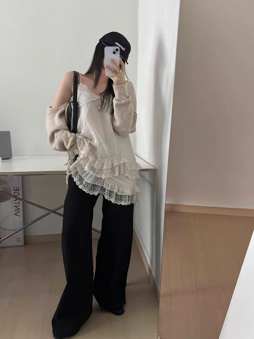 품격 V넥 레이스업 싱글 줄 버튼 캐미솔 작은 셔츠 하이웨이스트 루즈핏 스트레이트 와이드 레그 팬츠 세트 투피스 세트
