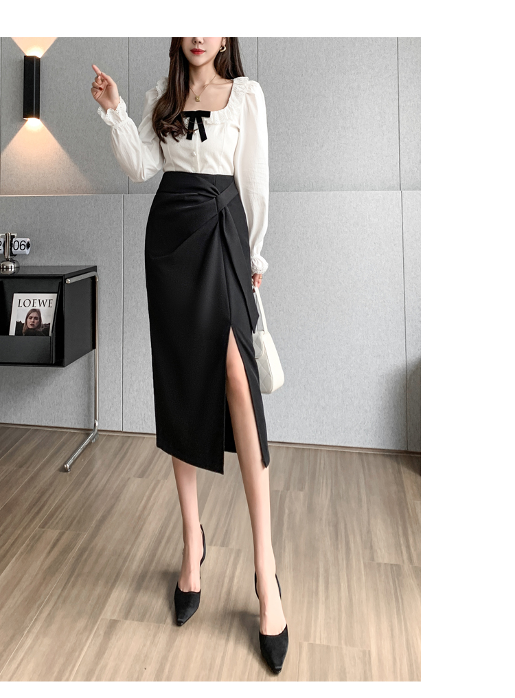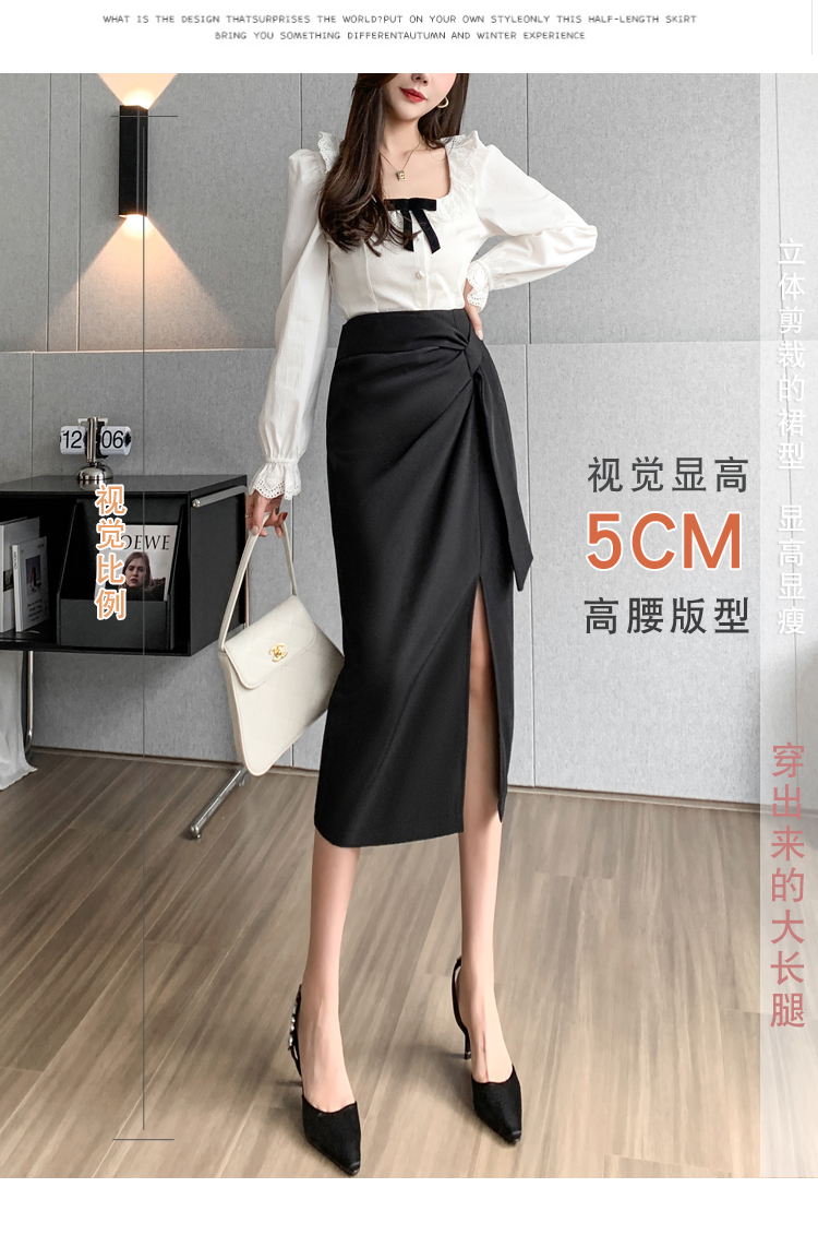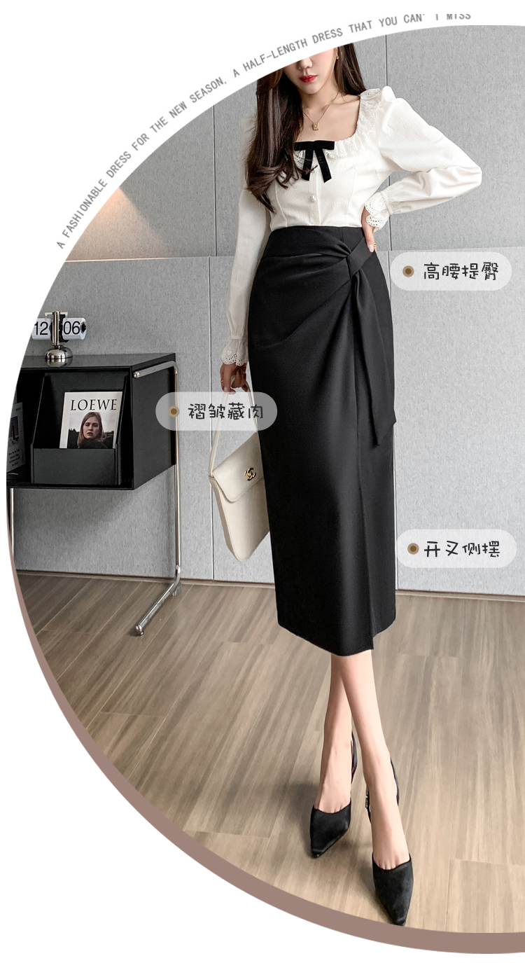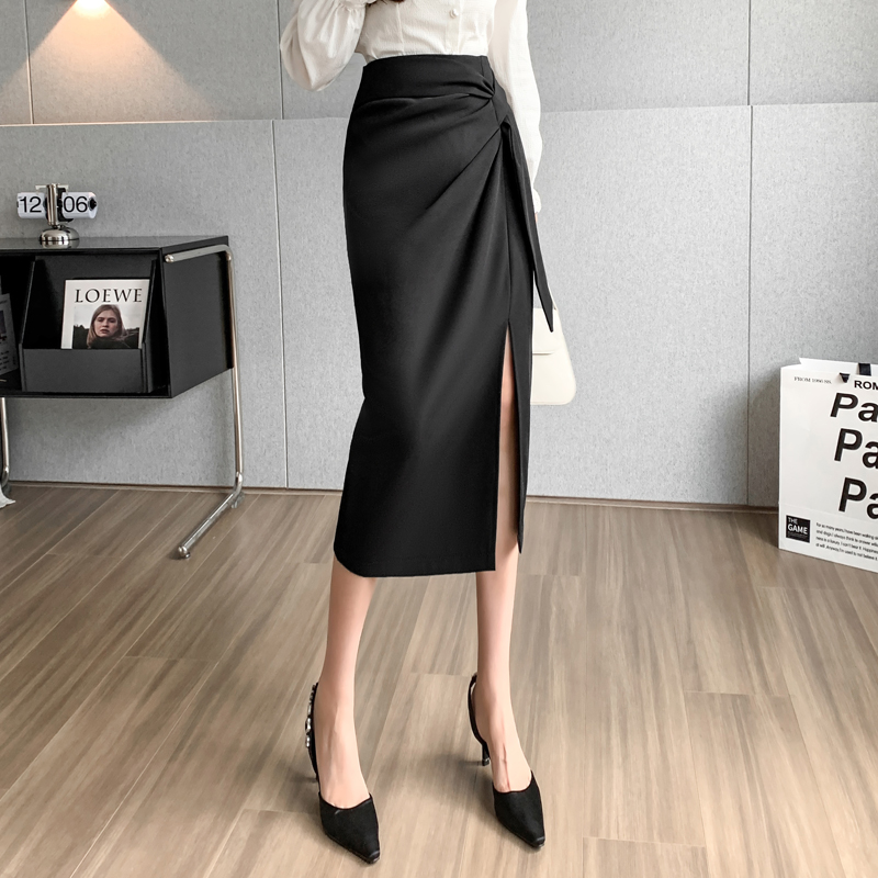 실사 비디오 불규칙 트임 정장 반신 스커트 경력 검정색 출퇴근 하이웨이스트 타이트 스커트 레이스업 한 마디 롱 스커트