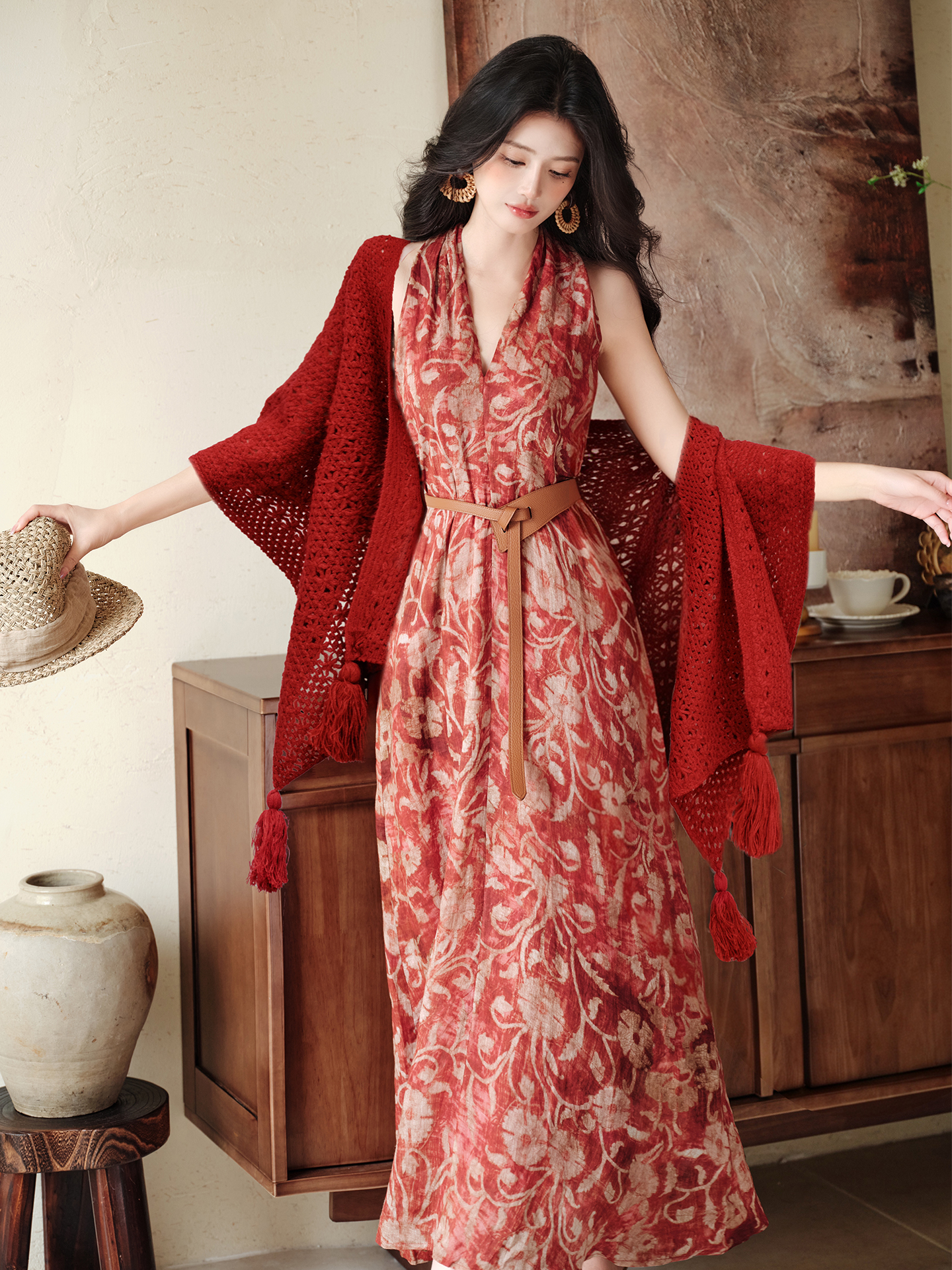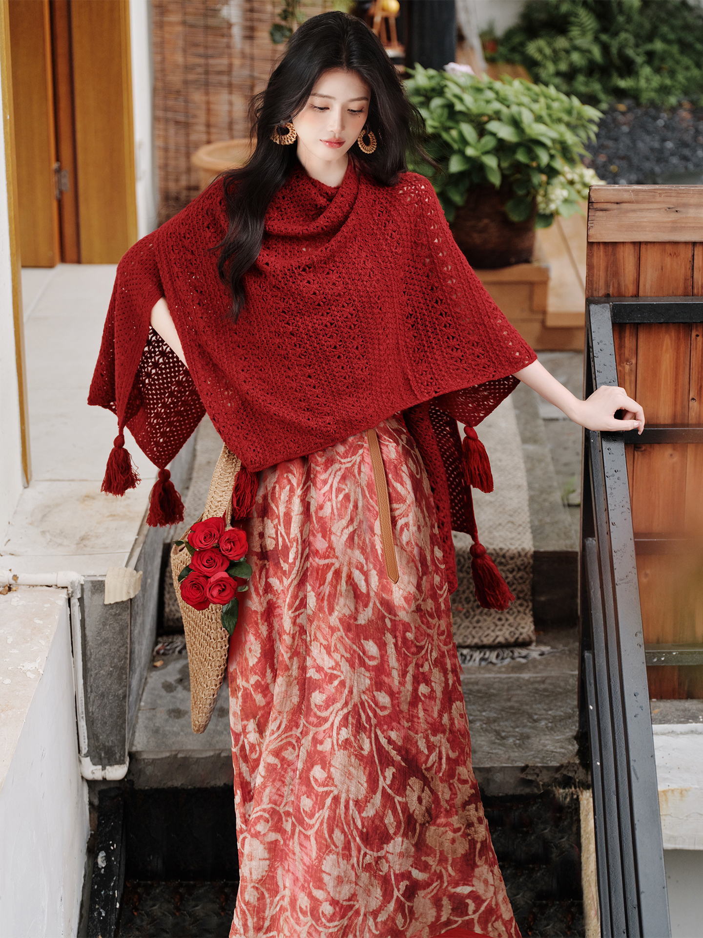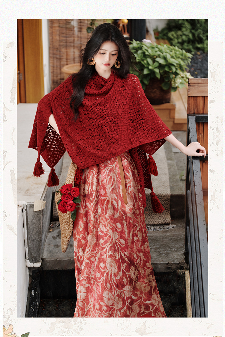 언어 그리스어 진짜 사진 찍기 새로운 빨간색 불규칙 케이크 트임 슬립 드레스 코디 후드 숄 투피스 세트 휴가 치마