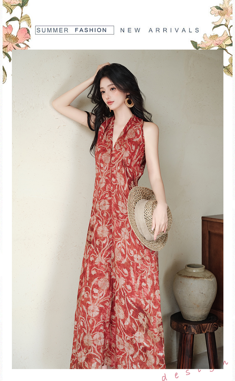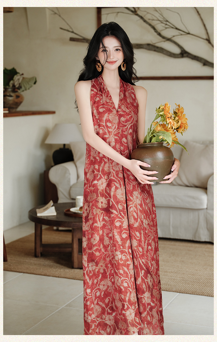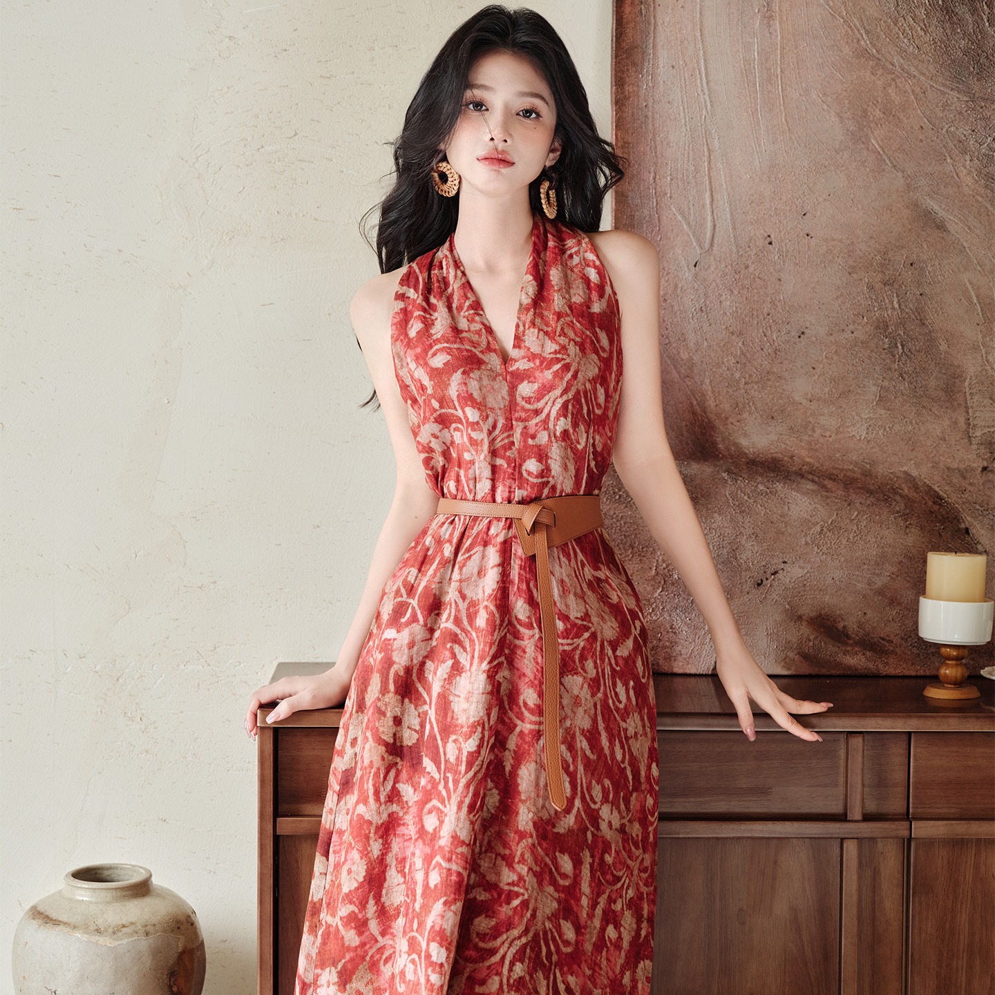 9024 재고 있음 2026 여름 새로운 면 린넨 국풍 보라색 뒤 푸 프린트 라운드 넥 롱 코트 단추 차 서비스