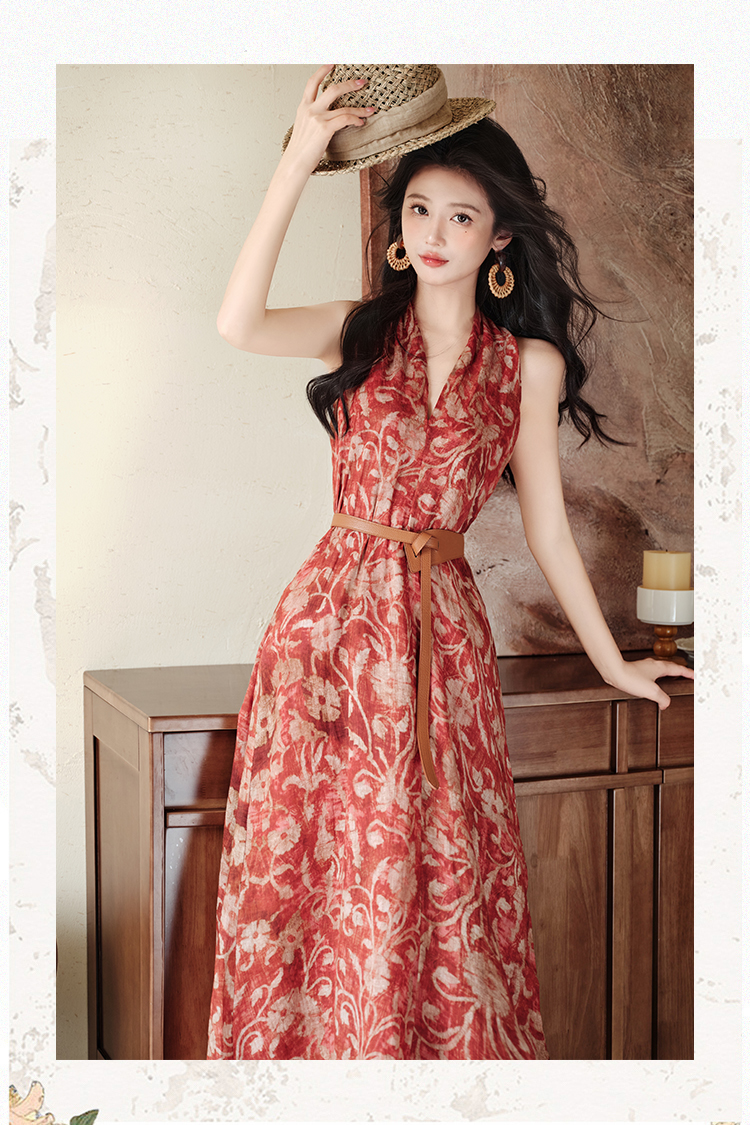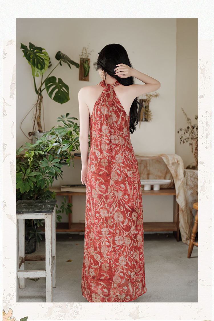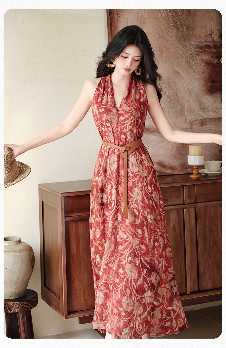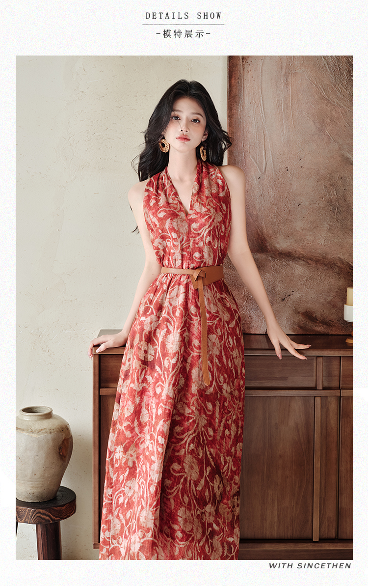 9024 재고 있음 2026 여름 새로운 면 린넨 국풍 보라색 뒤 푸 프린트 라운드 넥 롱 코트 단추 차 서비스