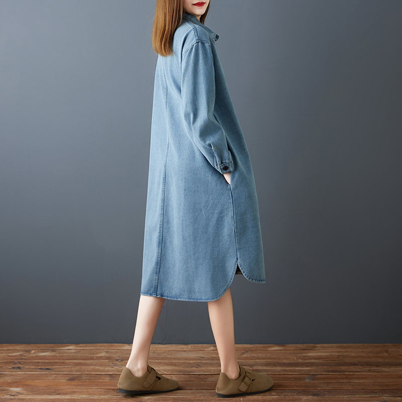 2026 봄 새로운 고급 센스 루즈핏 연령 감소 롱 코트 폴로 칼라 레트로 긴팔 셔츠 드레스 데님 드레스