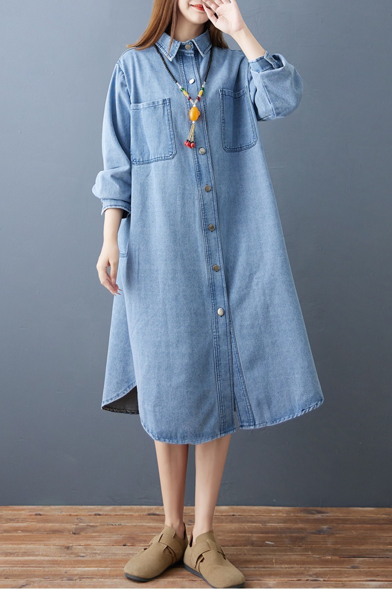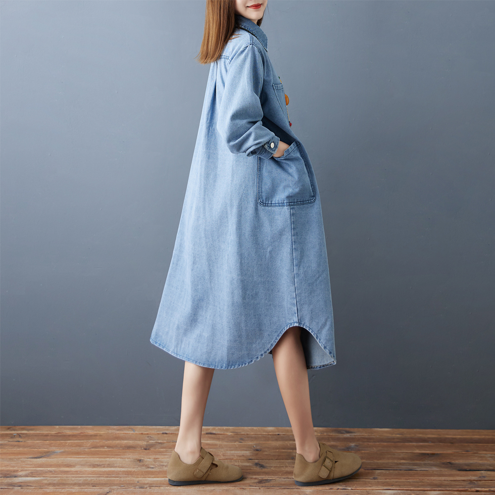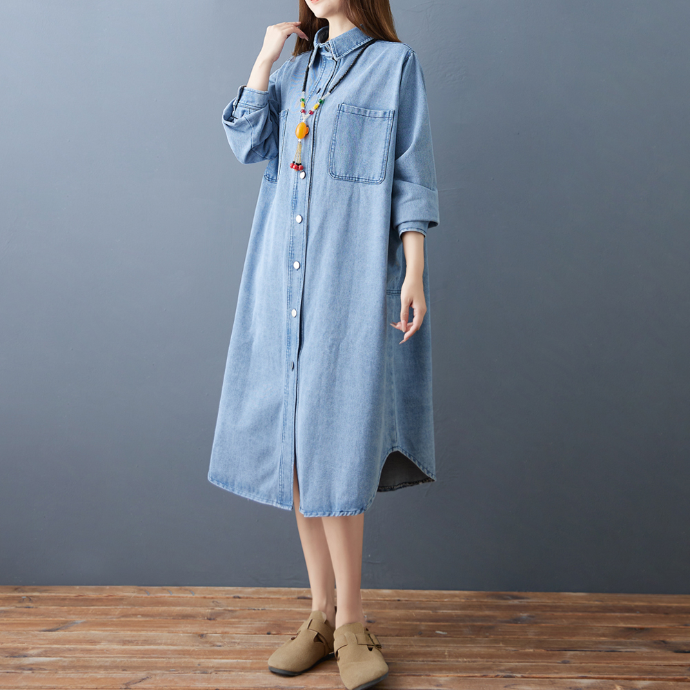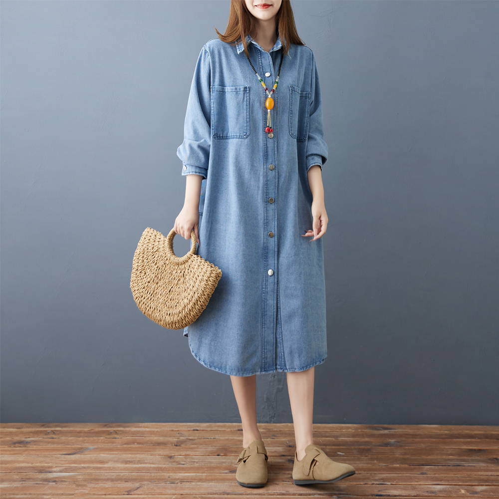 2026 봄 새로운 고급 센스 루즈핏 연령 감소 롱 코트 폴로 칼라 레트로 긴팔 셔츠 드레스 데님 드레스
