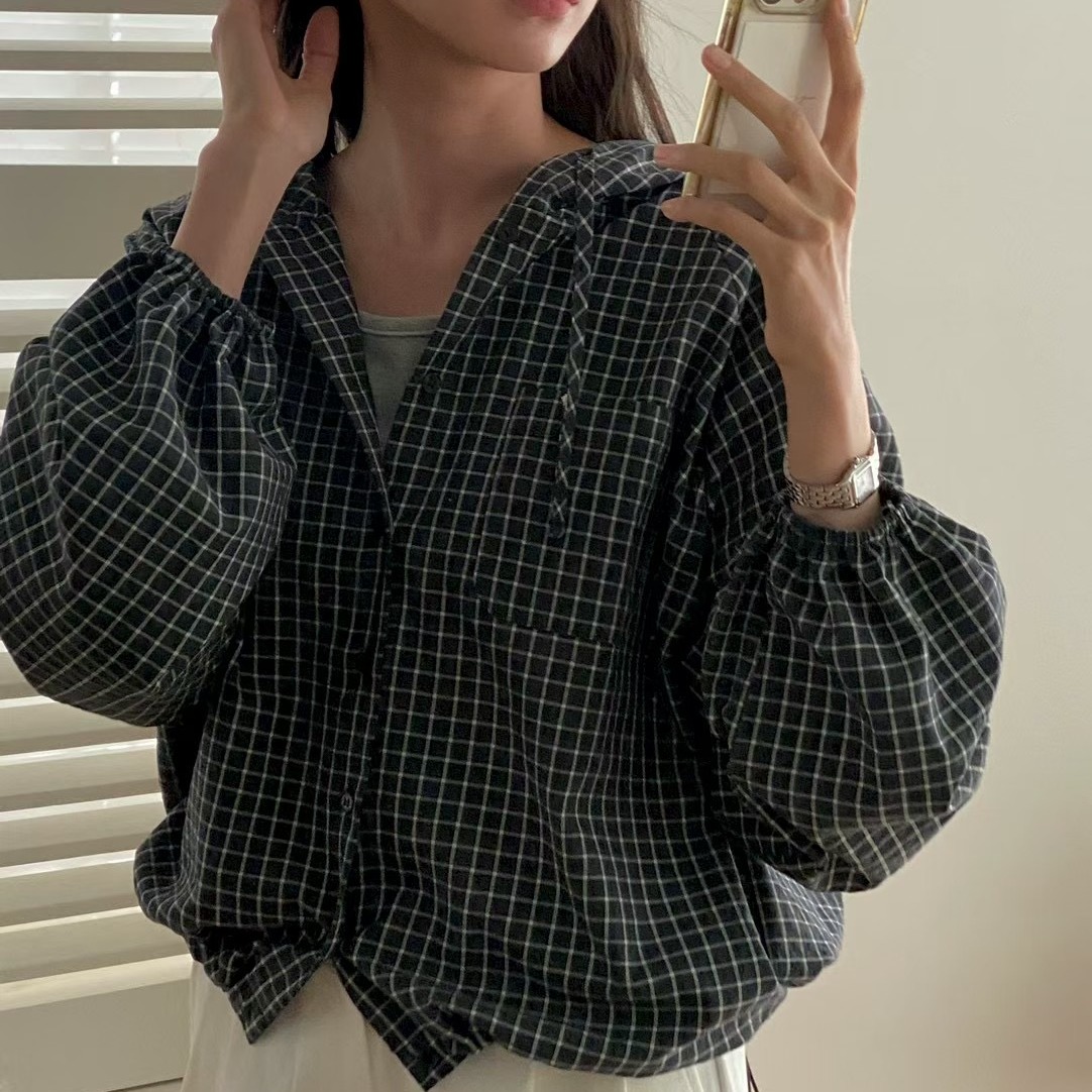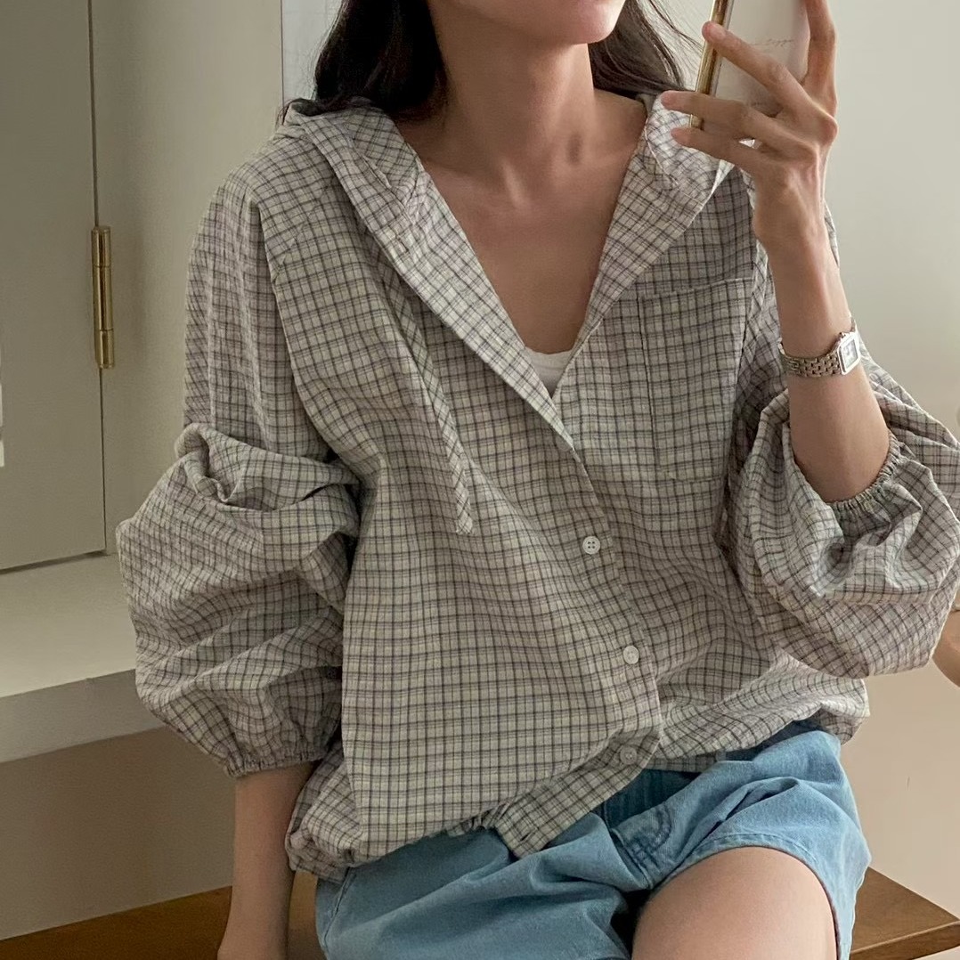 한국 스타일 레트로 체크무늬 연꽃 잎 레이스 루즈핏 V넥 레이스 업 셔츠 달콤함 외국 가스 긴팔 자외선 차단 셔츠 맨위