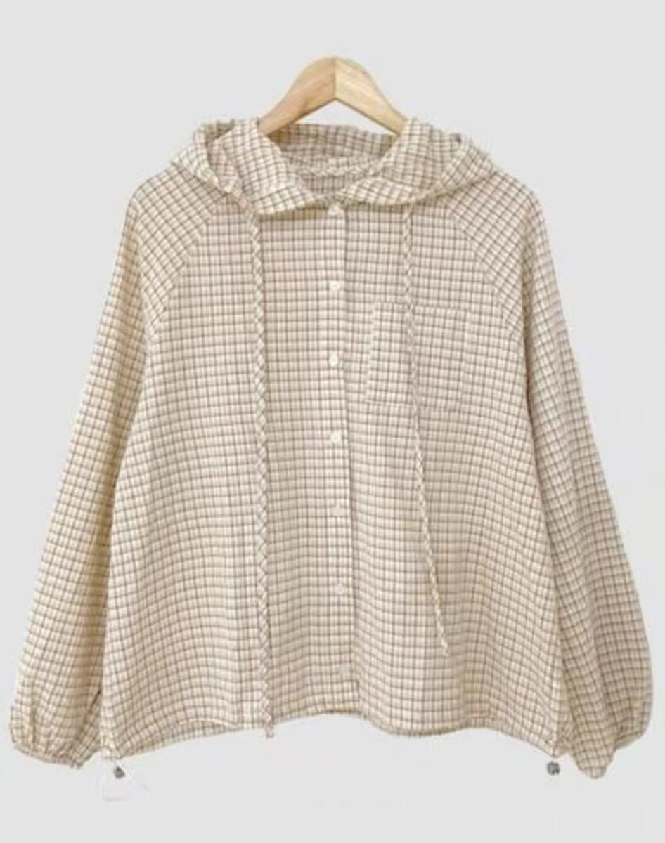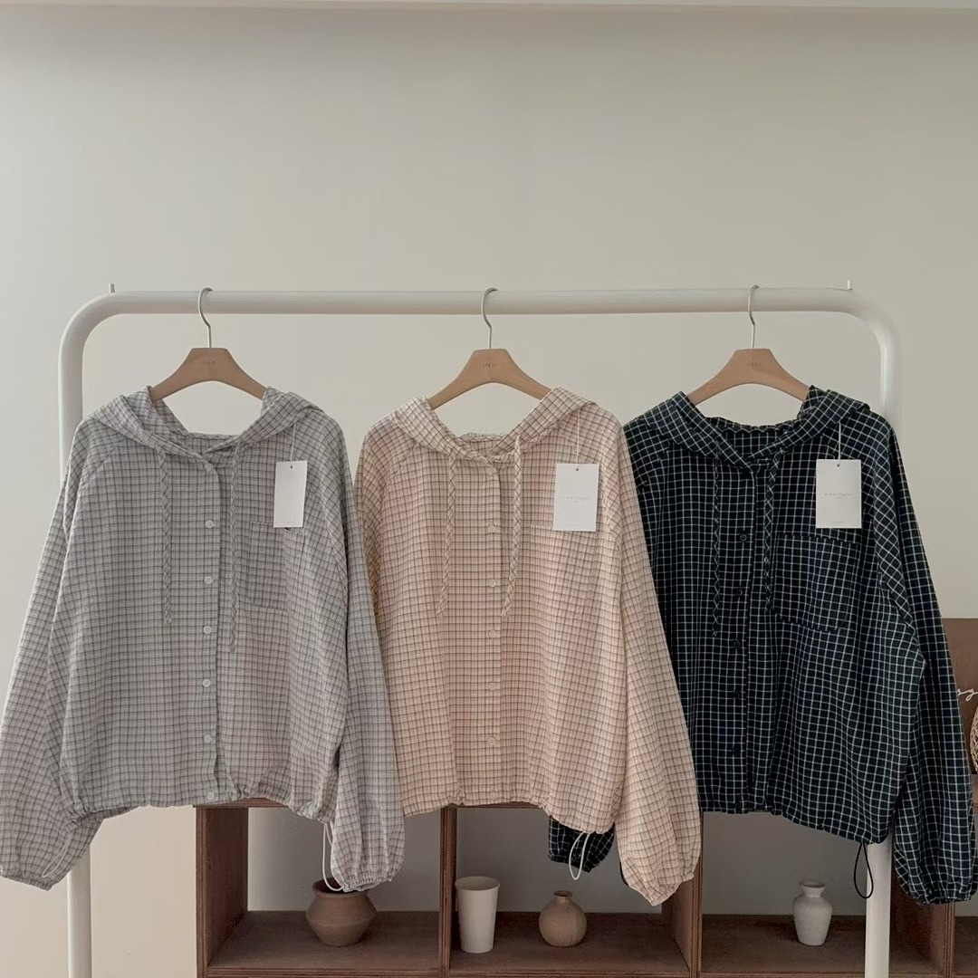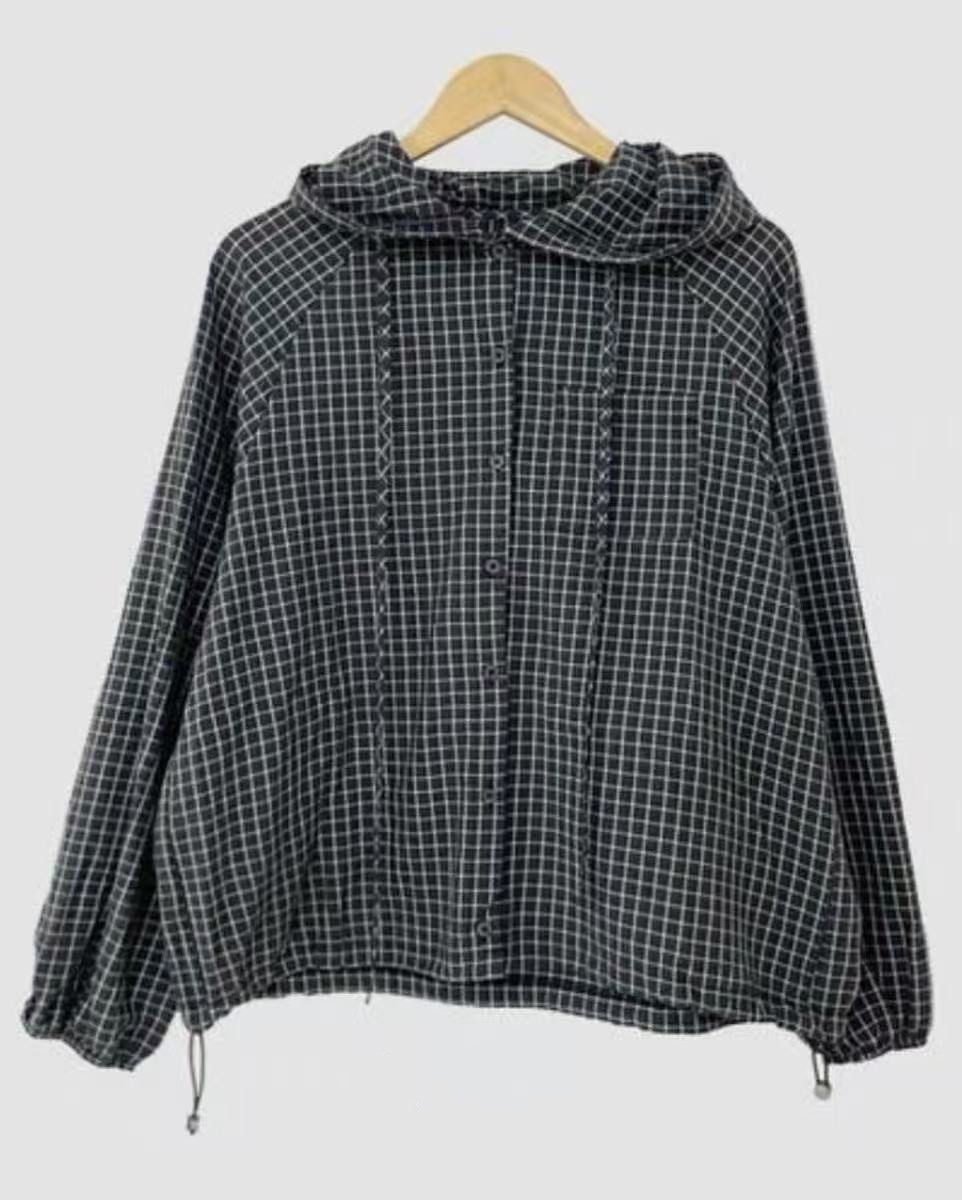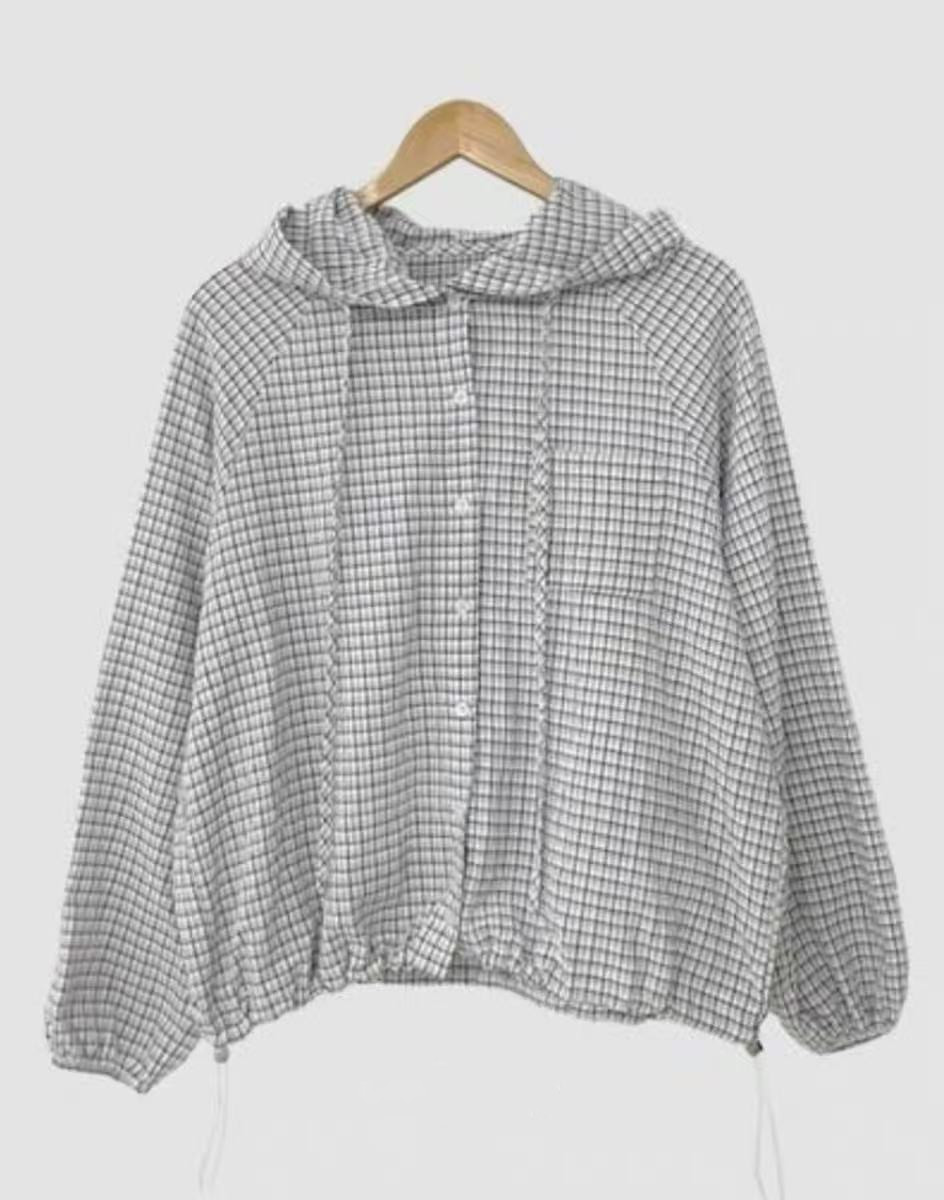 레트로 체크무늬 후드 레이스업 자외선 차단 셔츠 재킷 미니멀리즘 캐주얼 루즈핏 밑단 펌프 로프 긴팔 체크무늬 셔츠