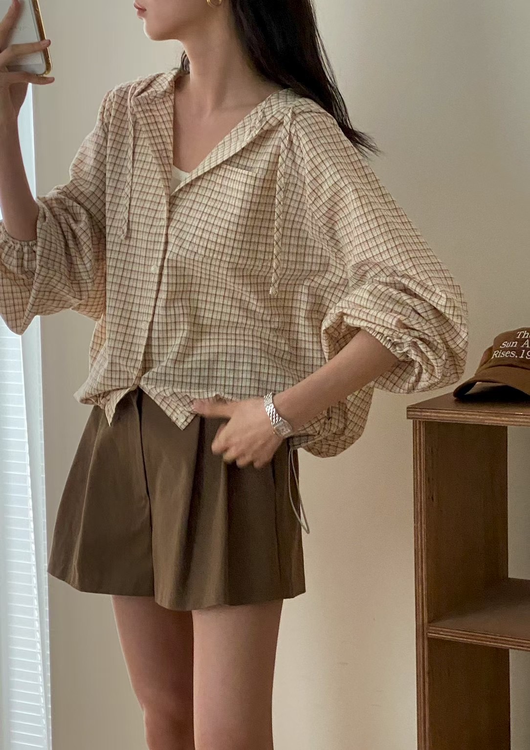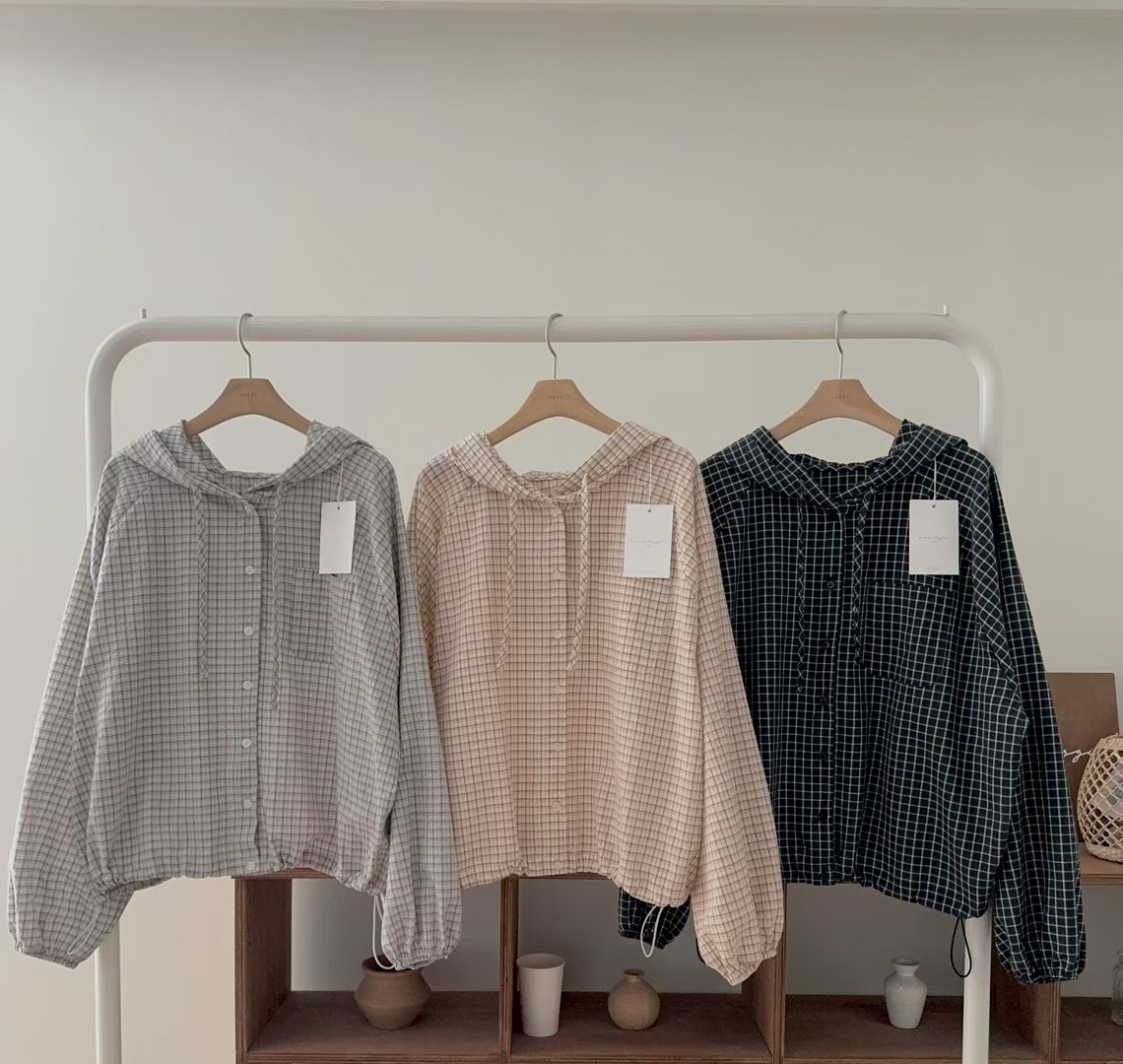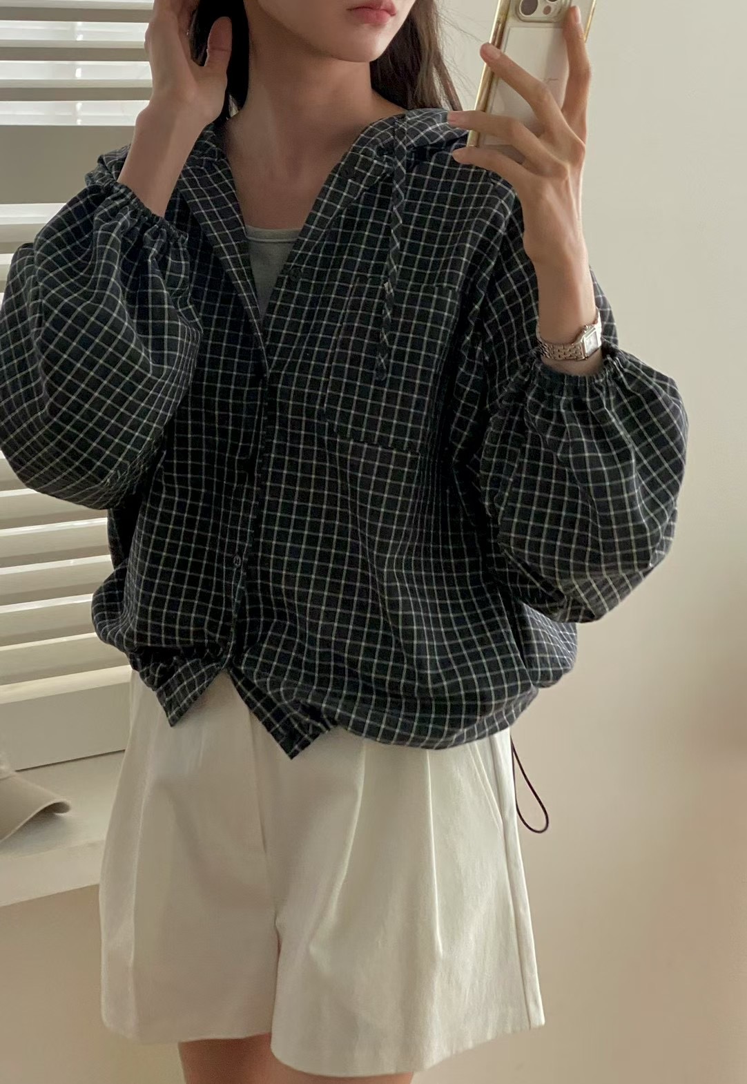 레트로 체크무늬 후드 레이스업 자외선 차단 셔츠 재킷 미니멀리즘 캐주얼 루즈핏 밑단 펌프 로프 긴팔 체크무늬 셔츠