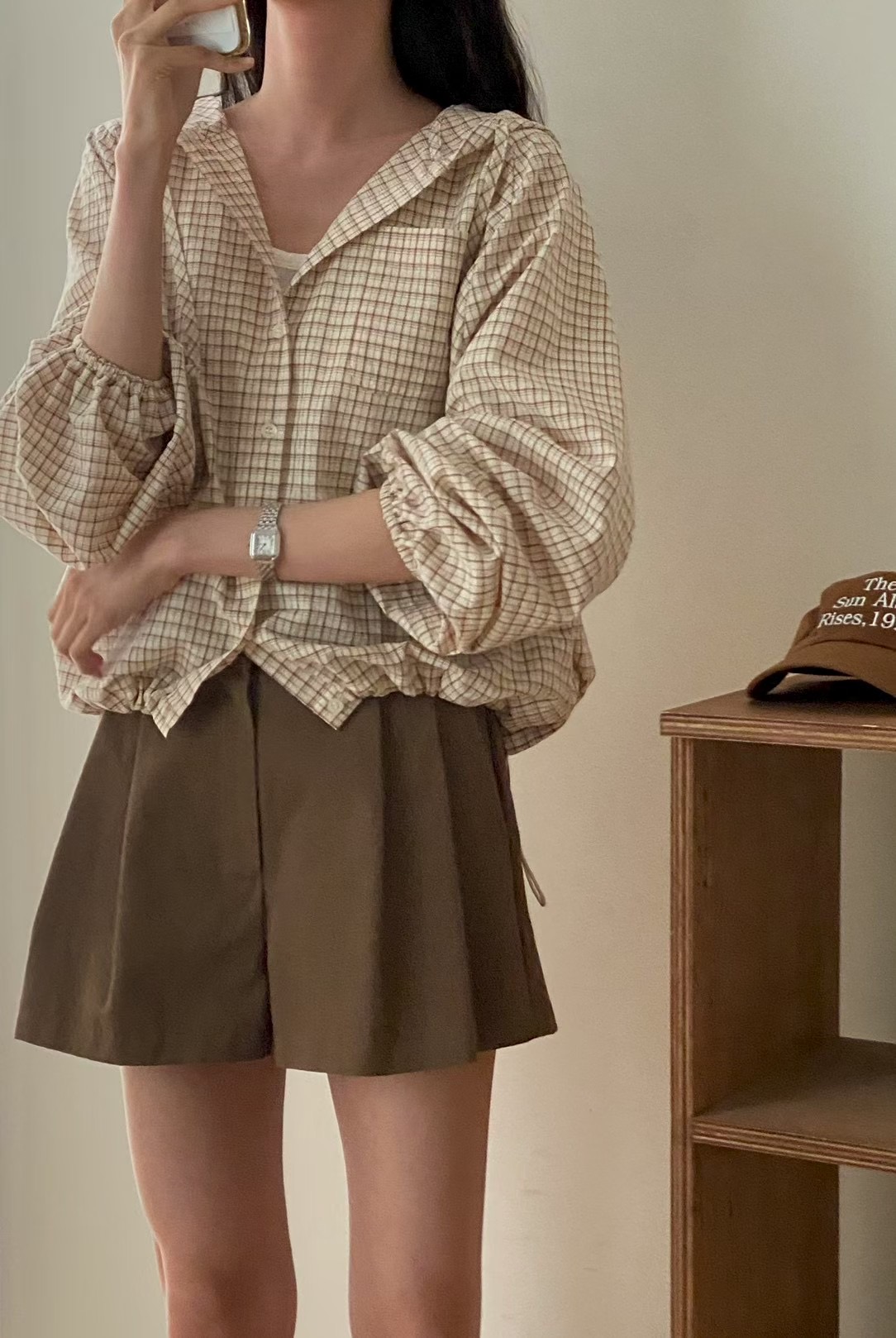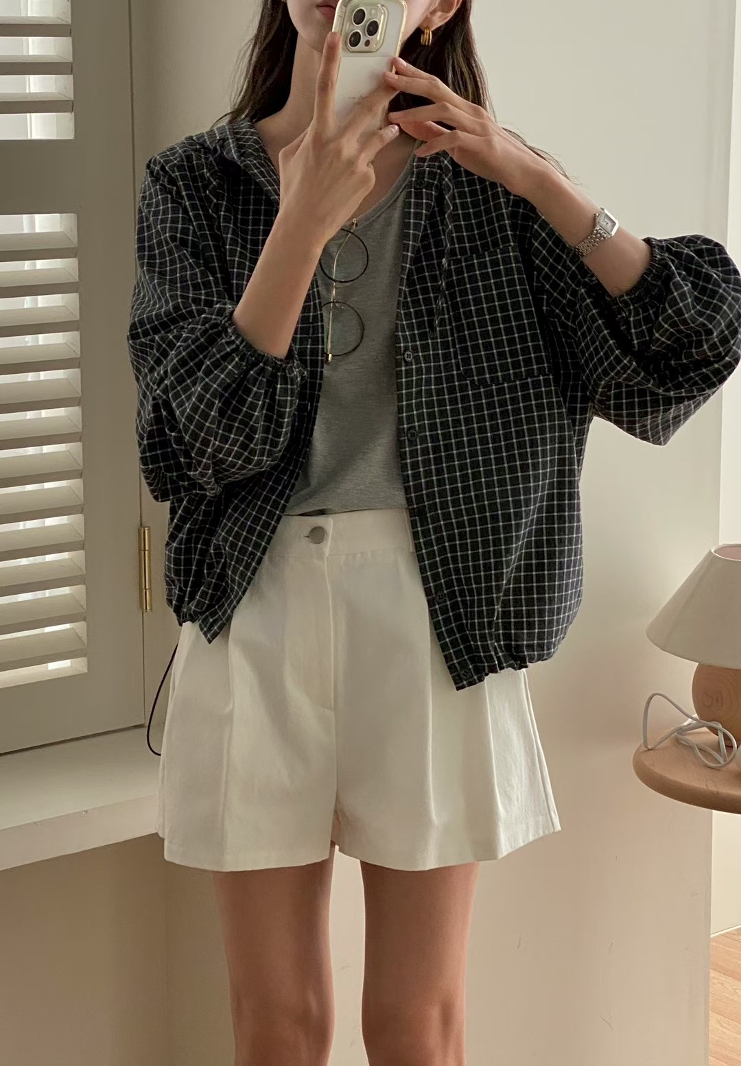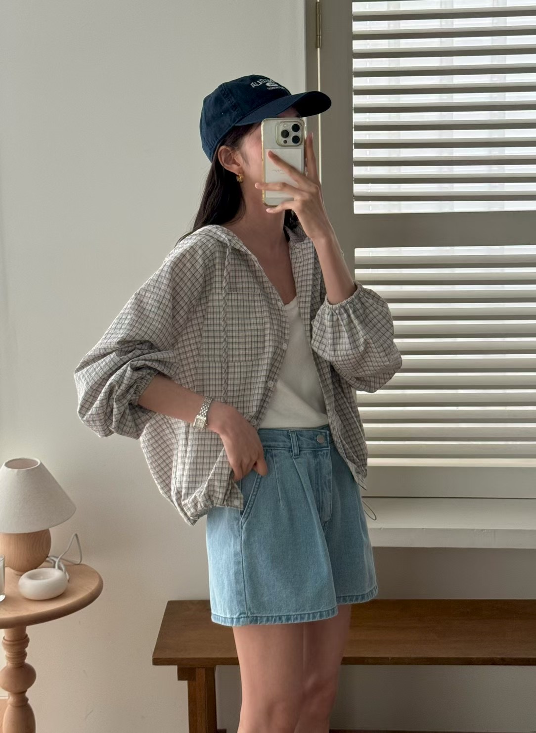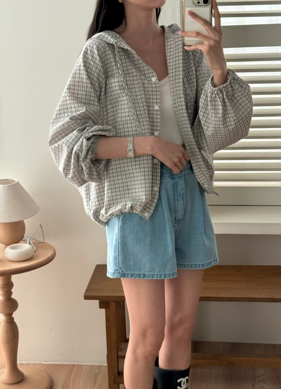 레트로 체크무늬 후드 레이스업 자외선 차단 셔츠 재킷 미니멀리즘 캐주얼 루즈핏 밑단 펌프 로프 긴팔 체크무늬 셔츠