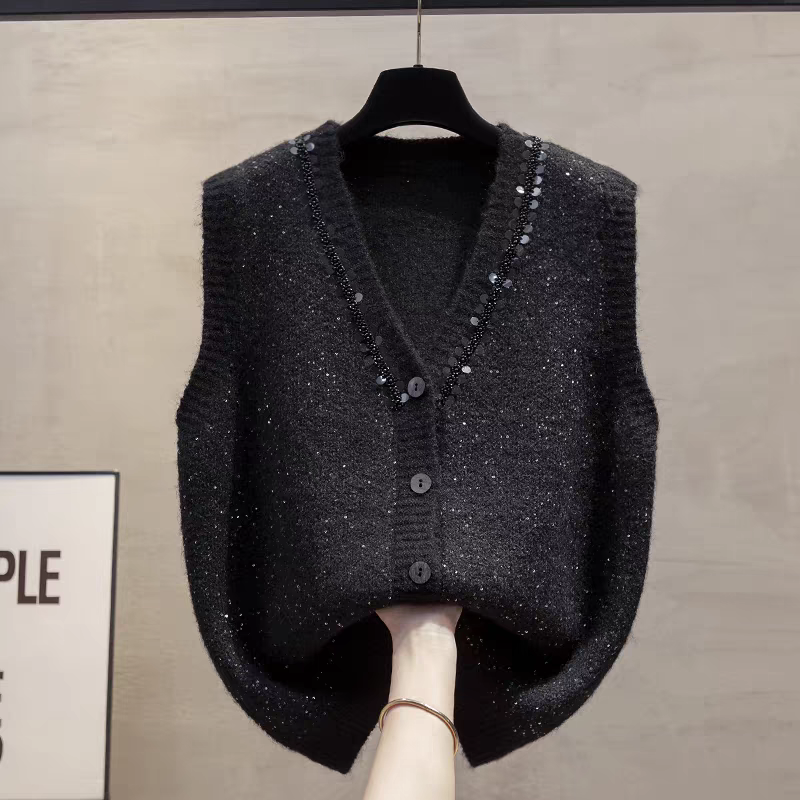 V넥 무거운 작업 비즈 박기 빛나는 니트 조끼 여자 가을과 겨울 품격 스택 착용 민소매 조끼