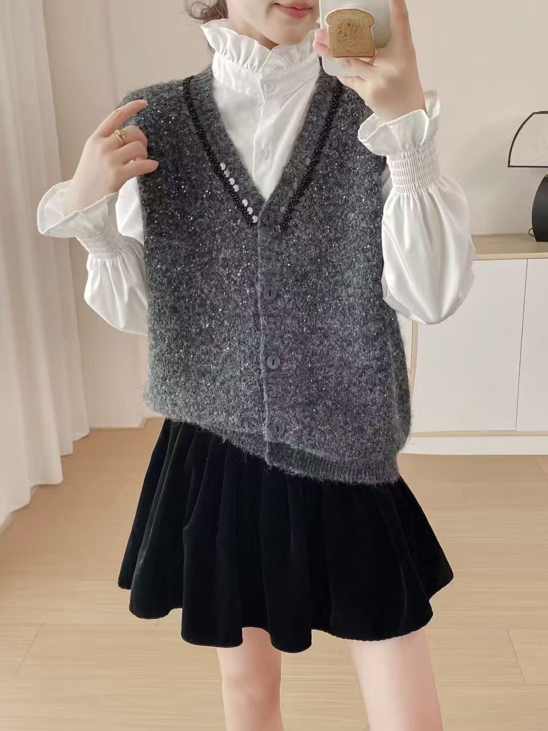 V넥 회색 스팽글 민소매 니트 조끼 여자 가을 겨울 루즈핏 스택 착용 고급 센스 레트로 품격 맨위