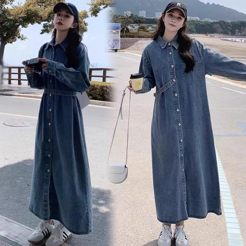 실사 2026 봄 한국 스타일 새로운 빅 사이즈 셔츠 드레스 루즈핏 레트로 긴팔 폴로 칼라 슬림해 보이는 데님 드레스