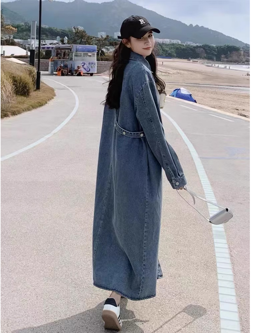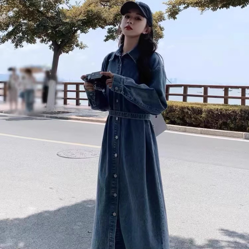 2026 봄 새로운 고급 센스 루즈핏 연령 감소 롱 코트 폴로 칼라 레트로 긴팔 셔츠 드레스 데님 드레스