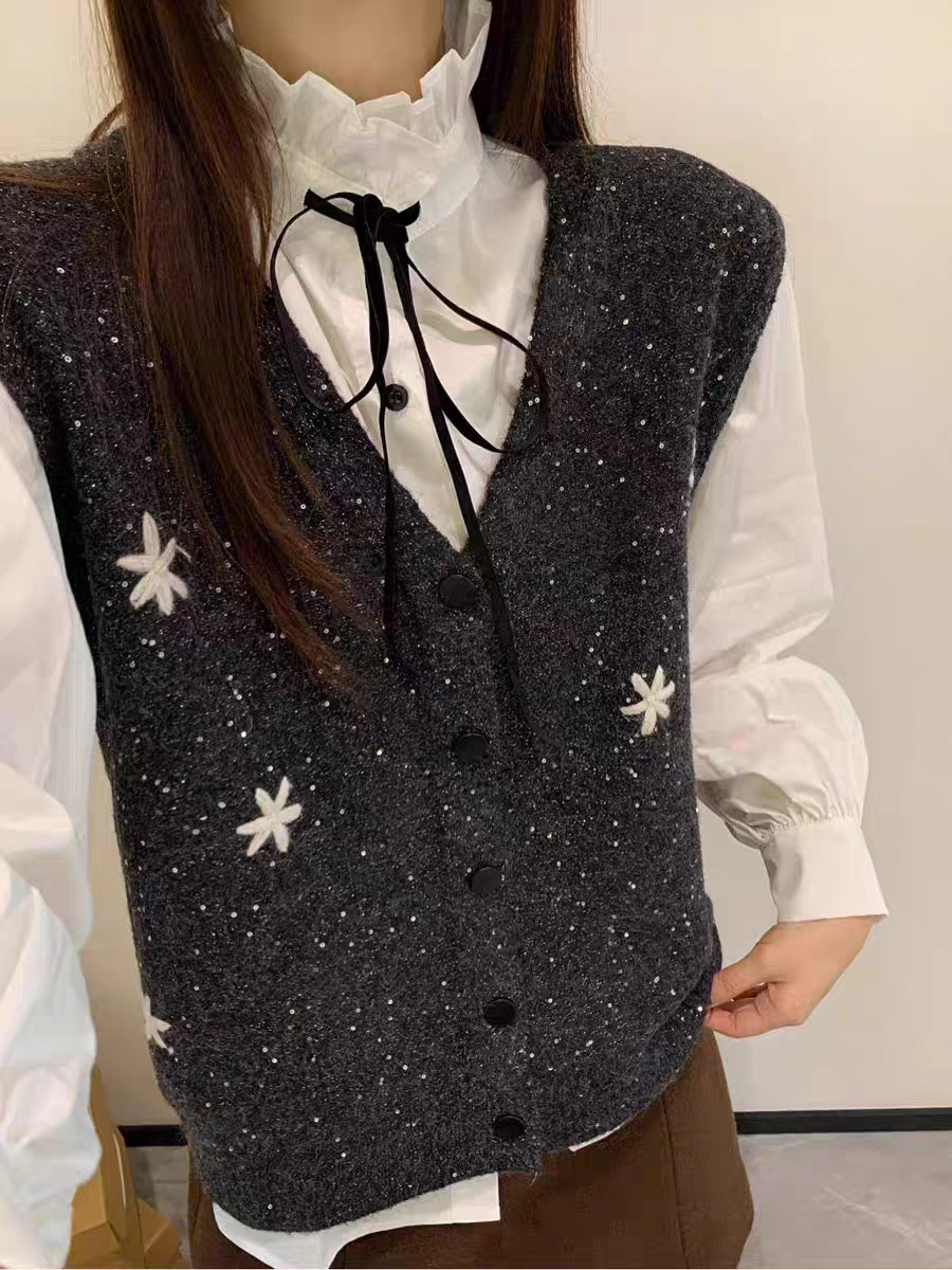 V넥 회색 스팽글 민소매 니트 조끼 여자 가을 겨울 루즈핏 스택 착용 고급 센스 레트로 품격 맨위