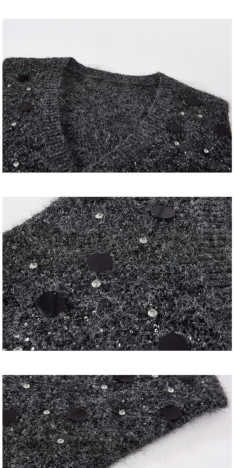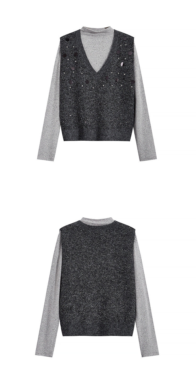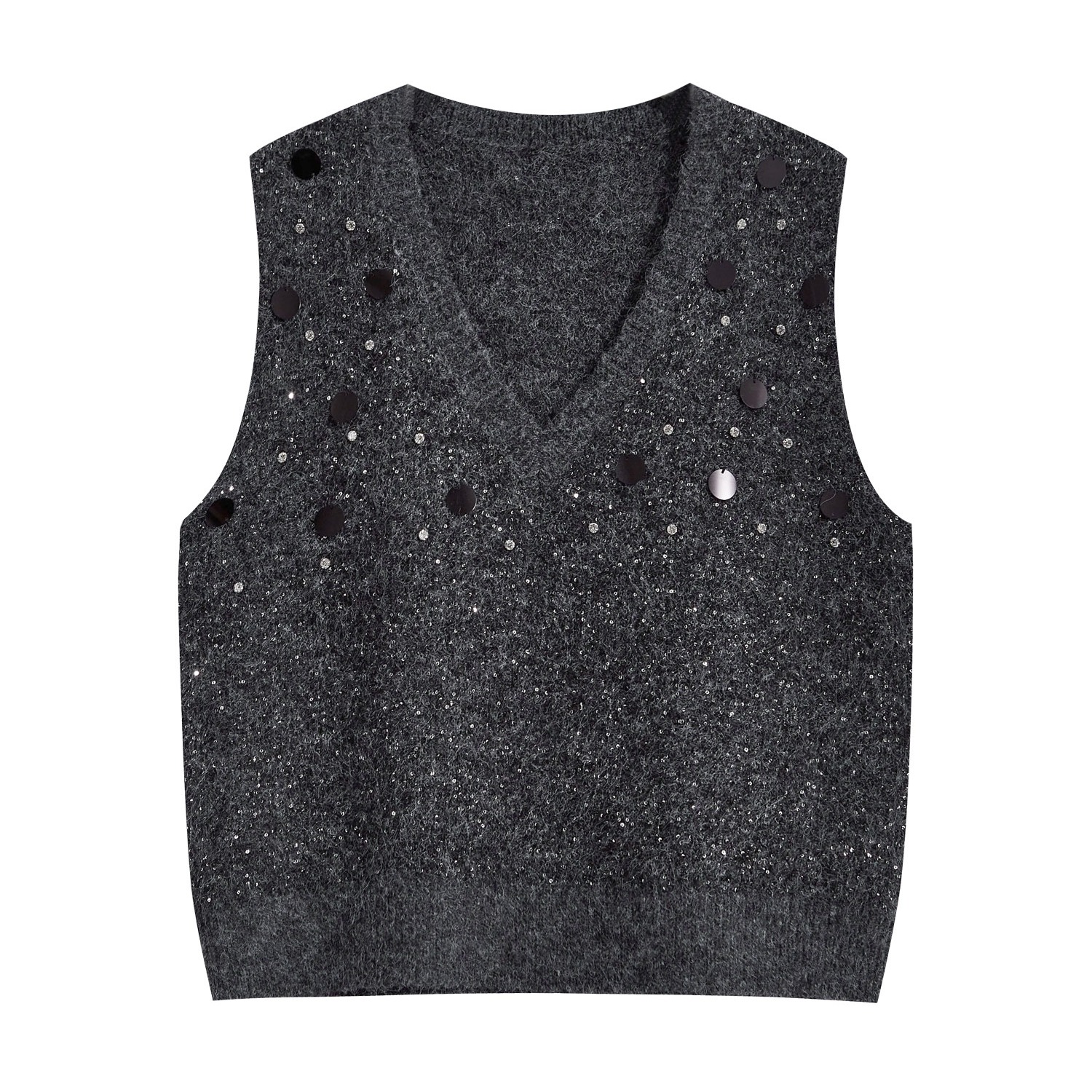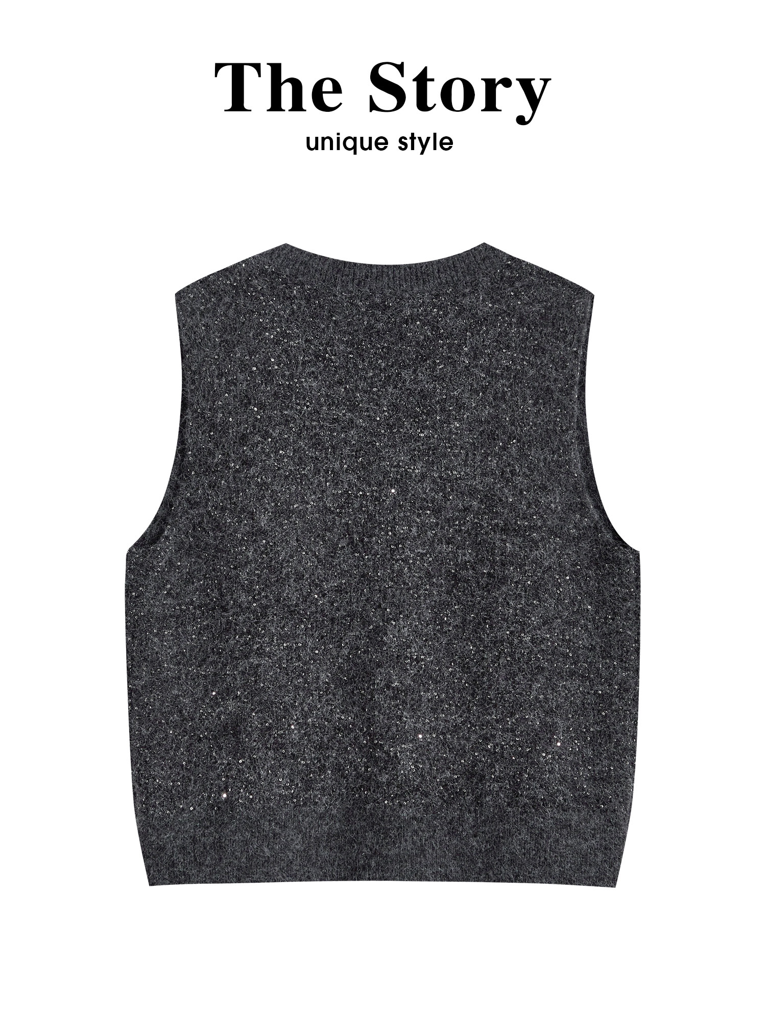 V넥 회색 스팽글 민소매 니트 조끼 여자 가을 겨울 루즈핏 스택 착용 고급 센스 레트로 품격 맨위