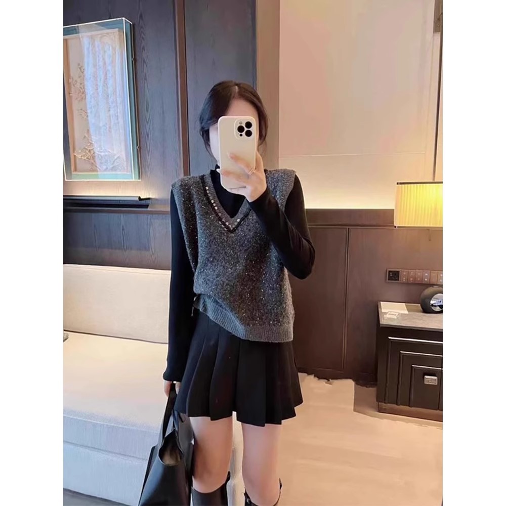 V넥 회색 스팽글 민소매 니트 조끼 여자 가을 겨울 루즈핏 스택 착용 고급 센스 레트로 품격 맨위