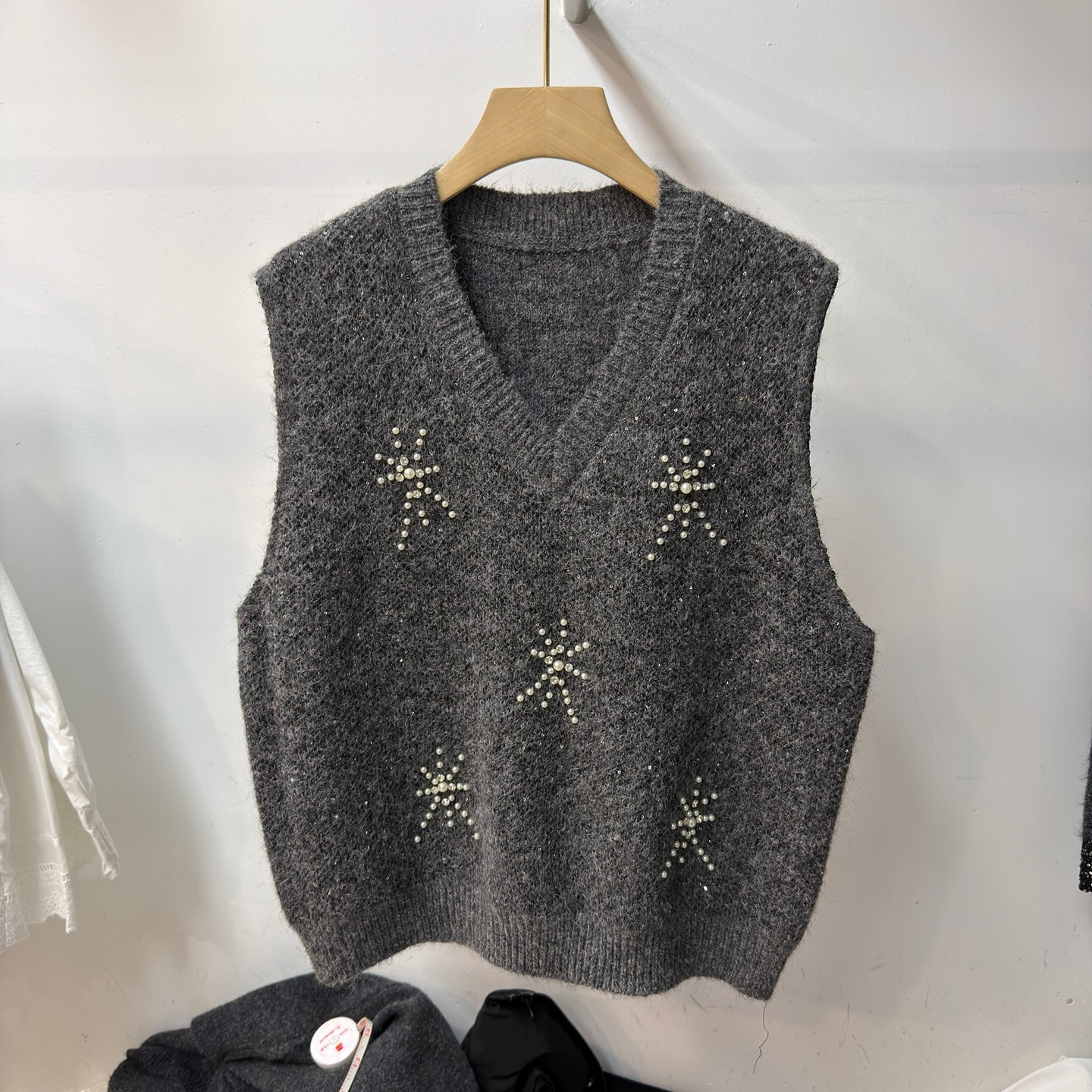 V넥 회색 스팽글 민소매 니트 조끼 여자 가을 겨울 루즈핏 스택 착용 고급 센스 레트로 품격 맨위