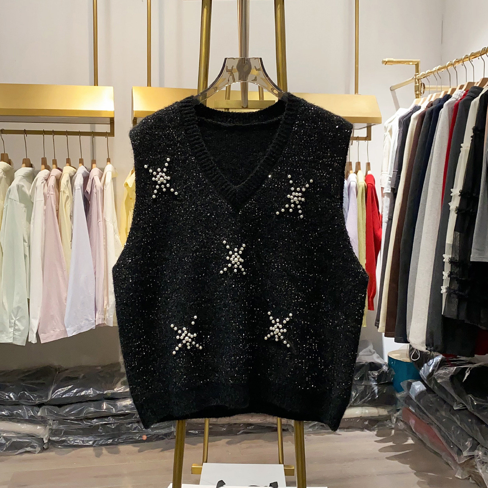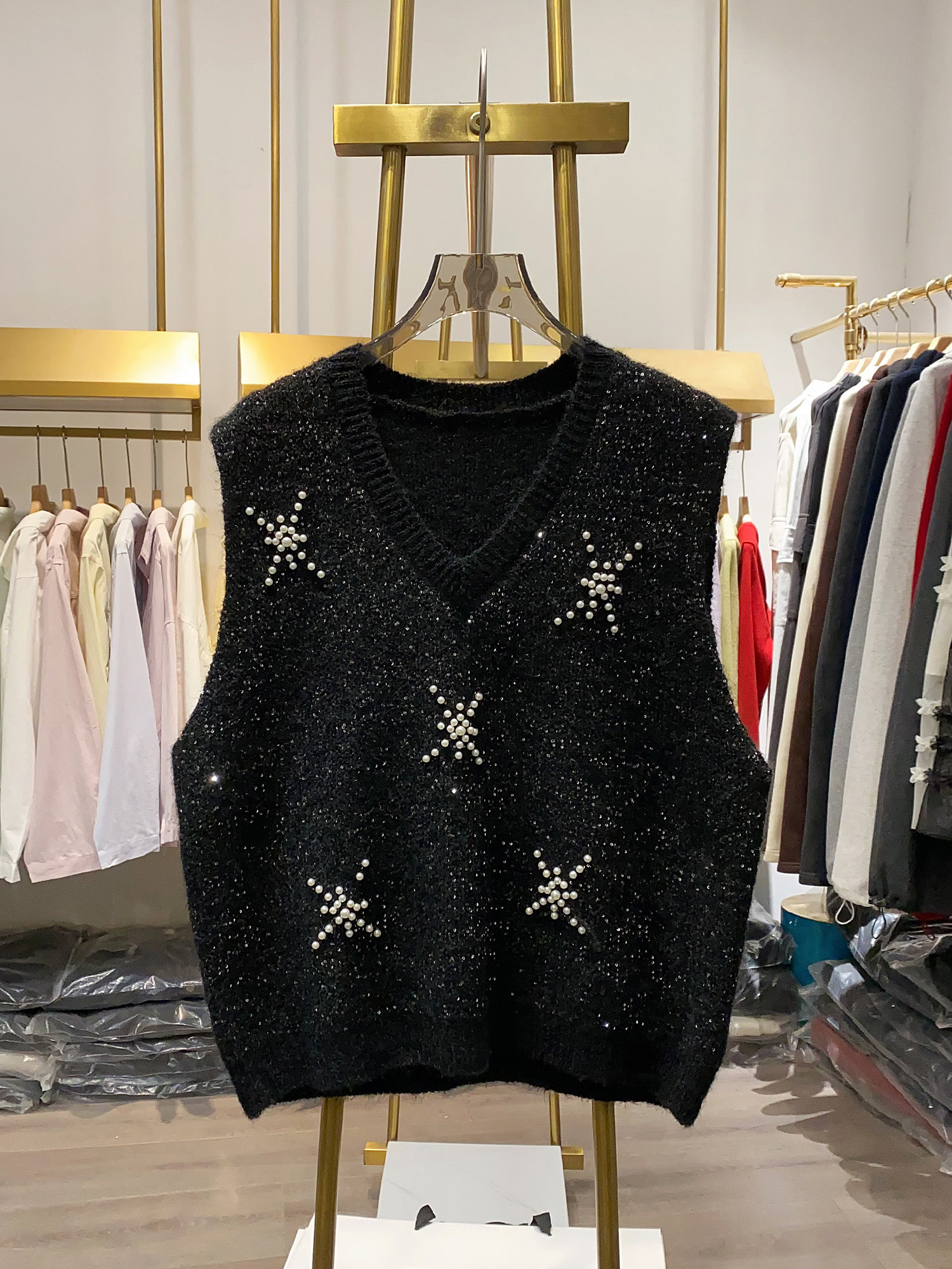 V넥 무거운 작업 비즈 박기 빛나는 니트 조끼 여자 가을과 겨울 품격 스택 착용 민소매 조끼