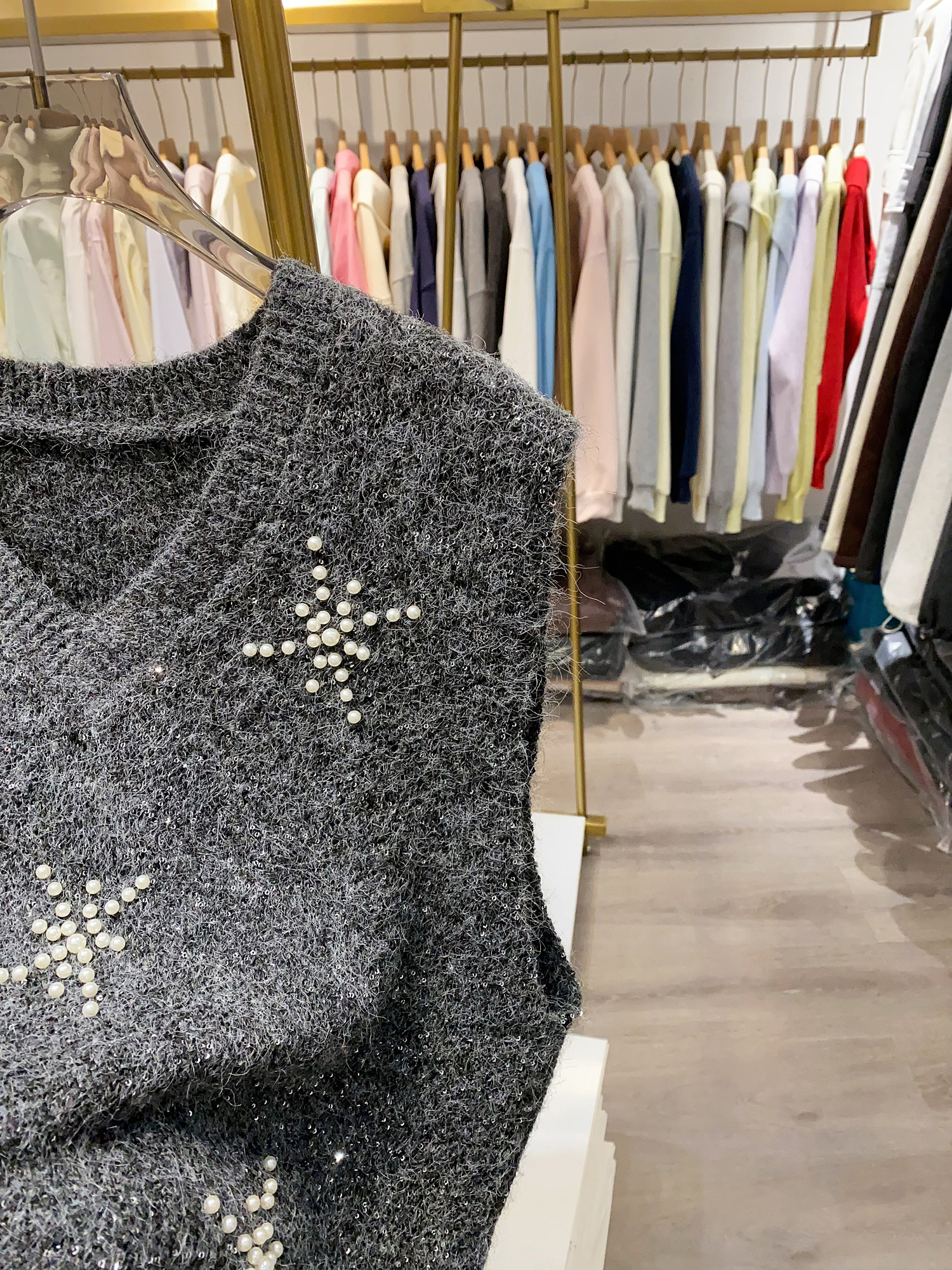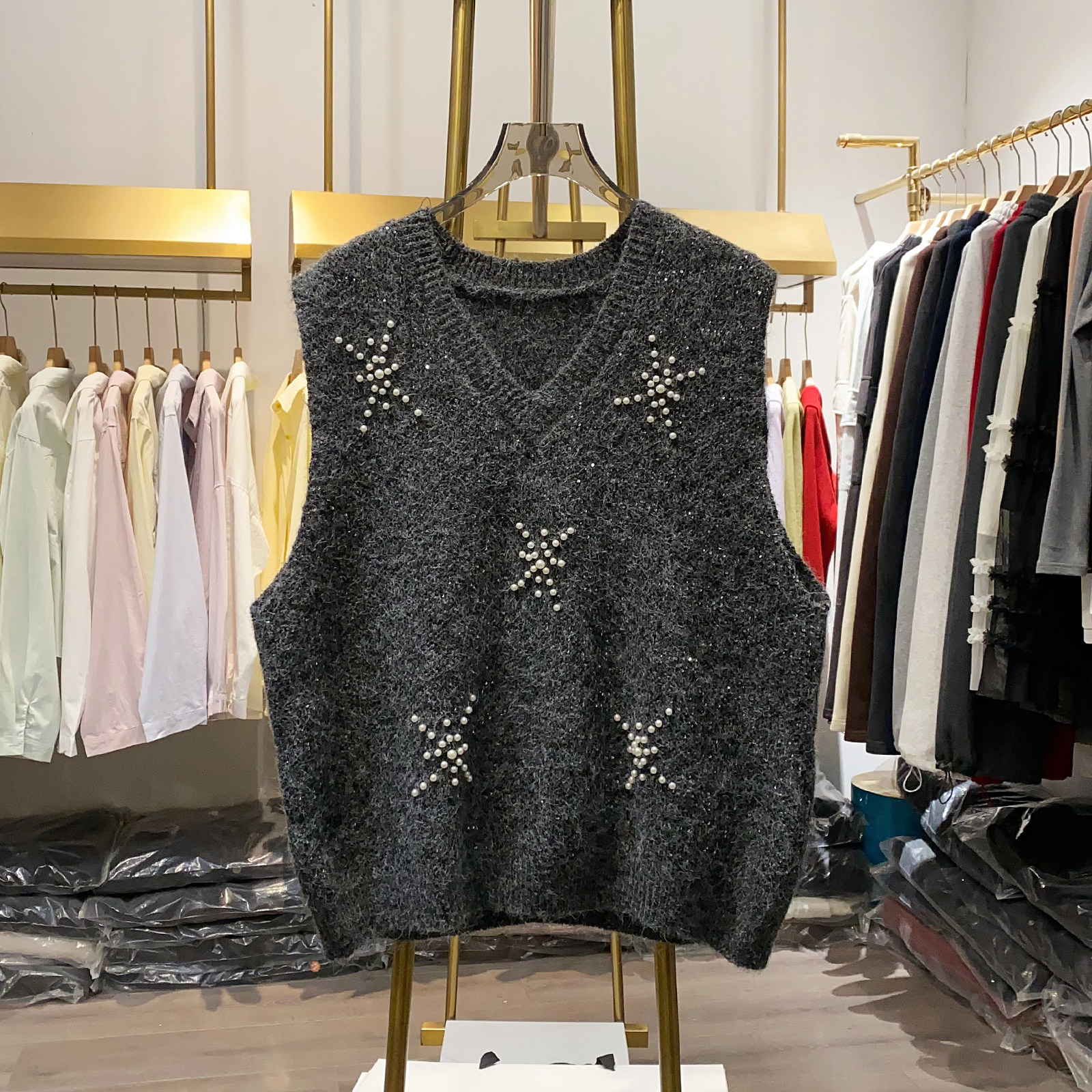 V넥 회색 스팽글 민소매 니트 조끼 여자 가을 겨울 루즈핏 스택 착용 고급 센스 레트로 품격 맨위