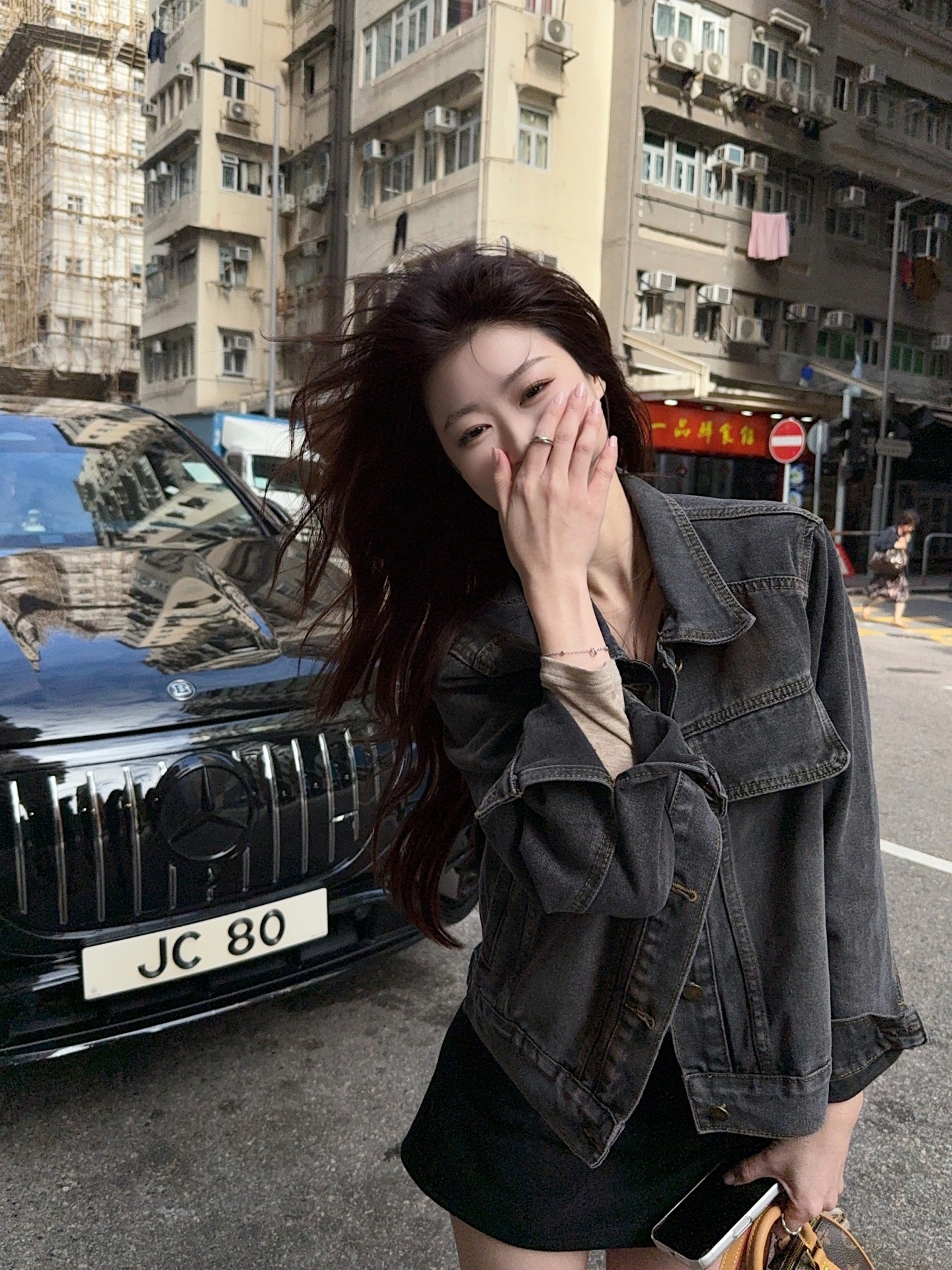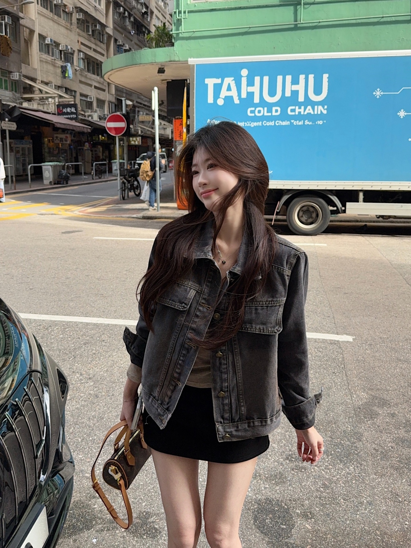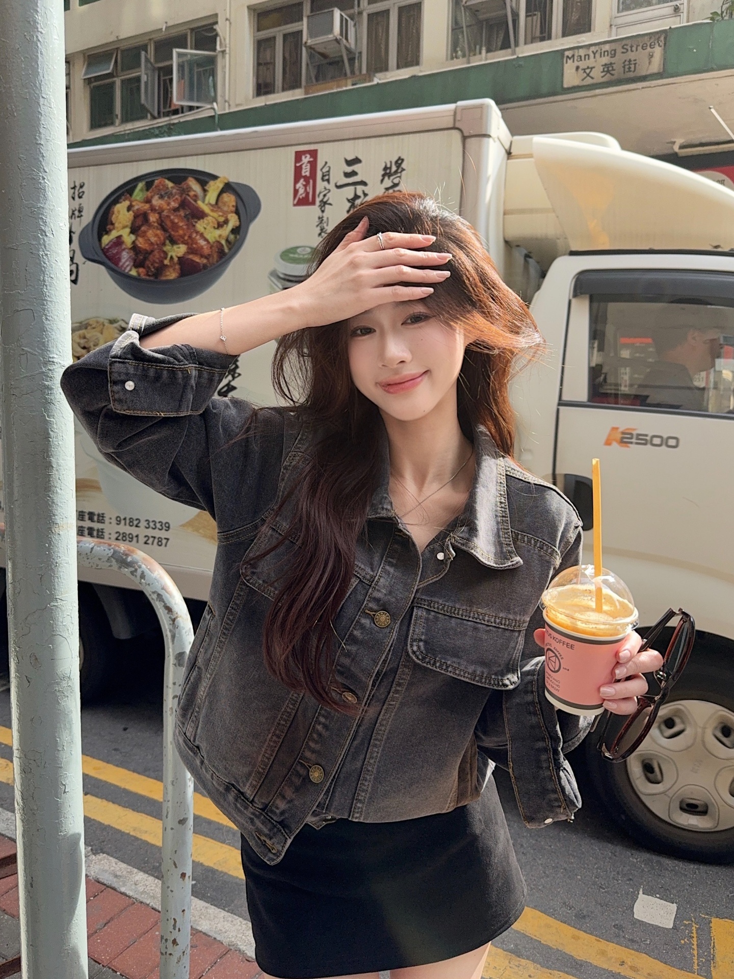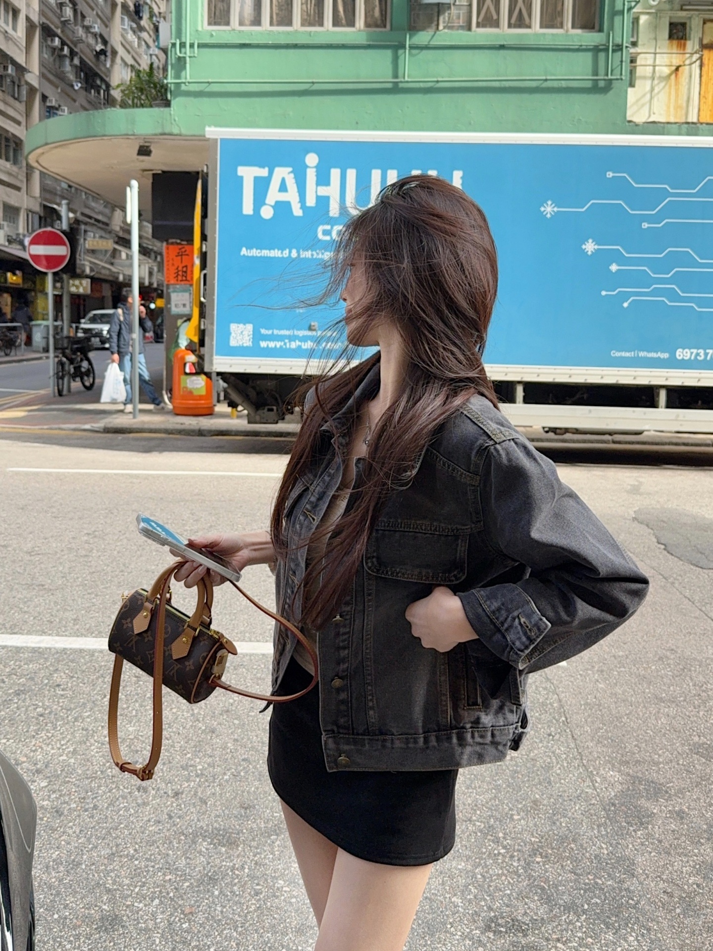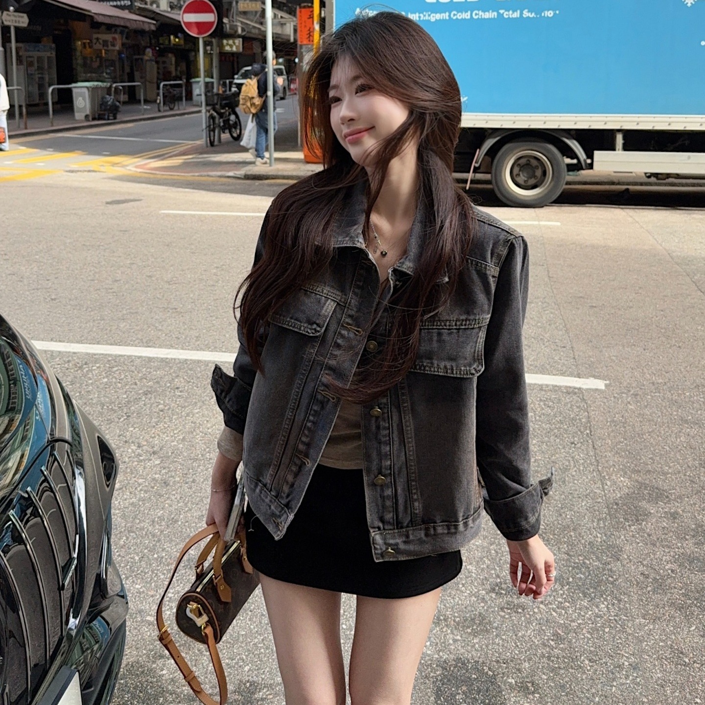 실사 검정색 데님 작은 대중 디자인 섹션 쇼트 스타일 루즈핏 데님 재킷