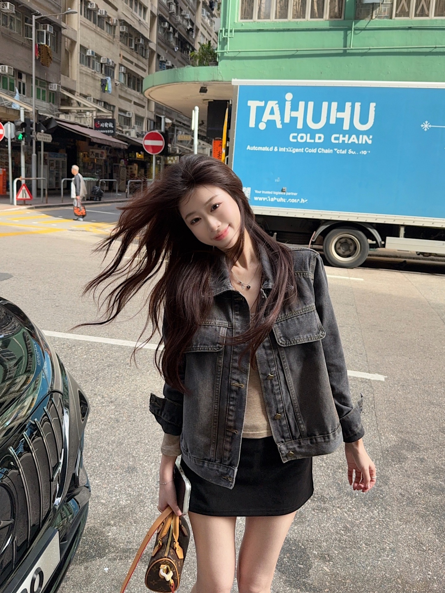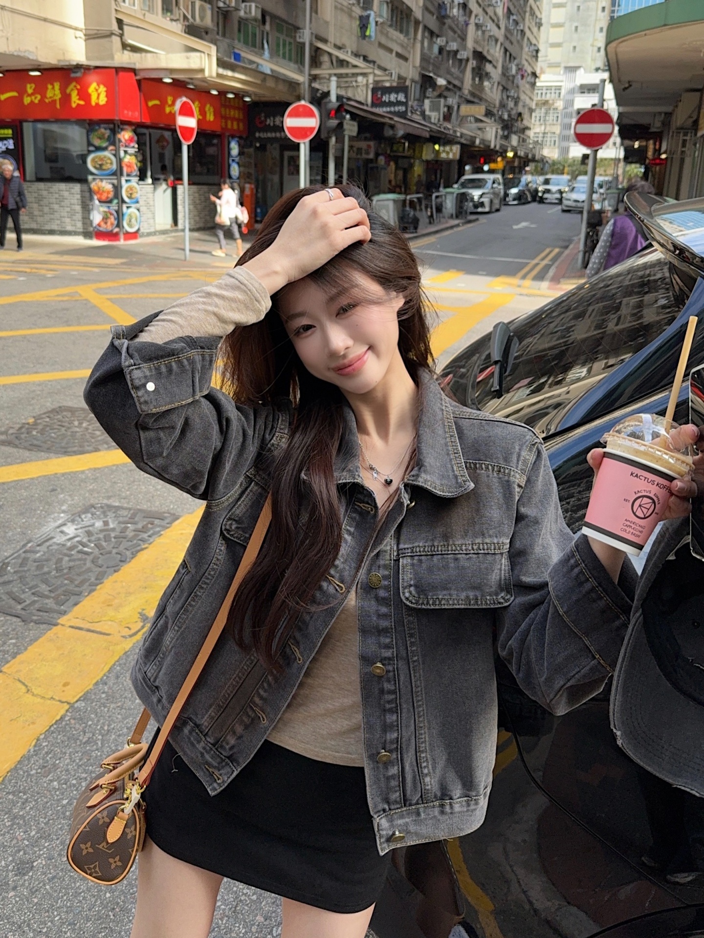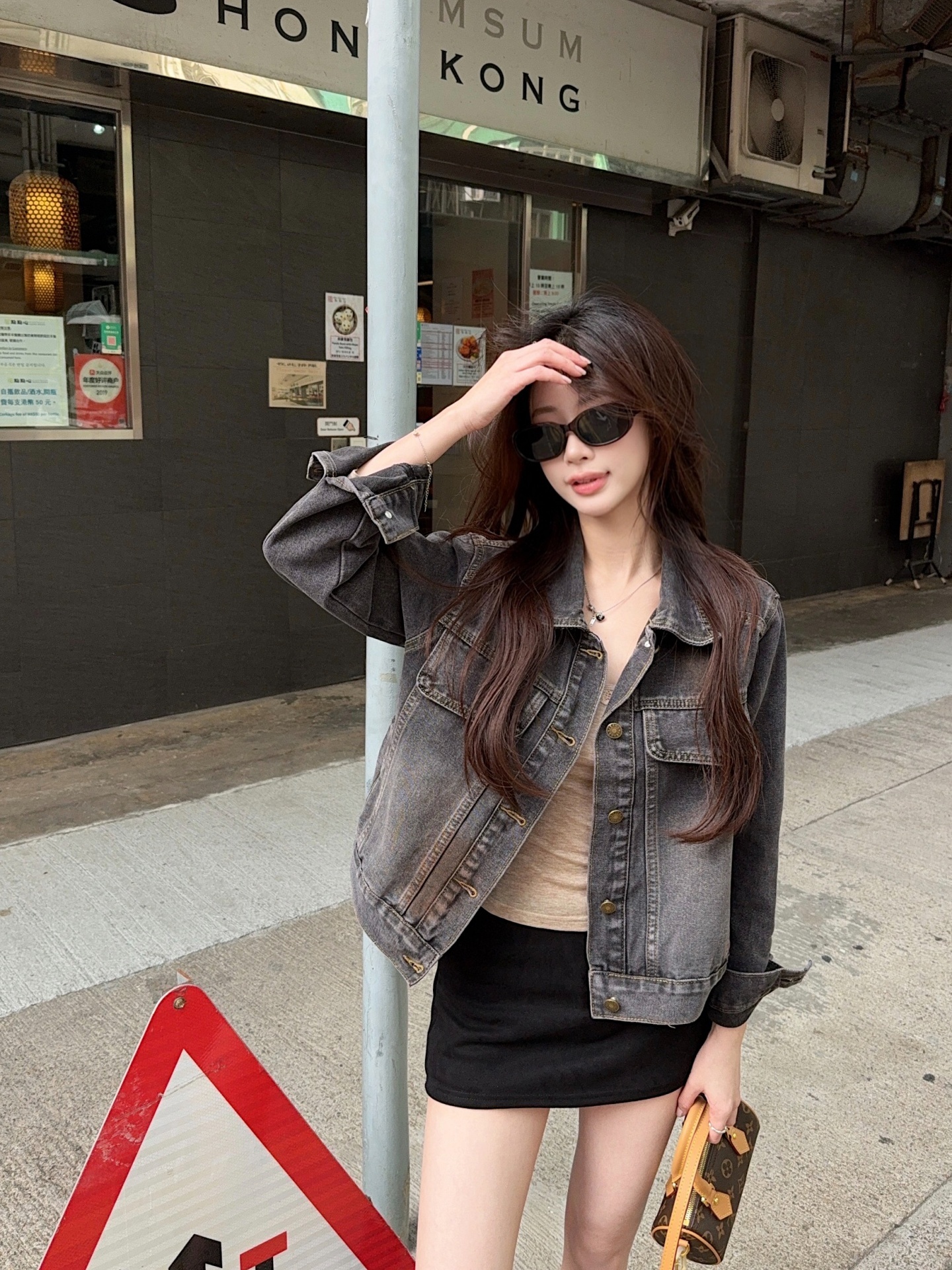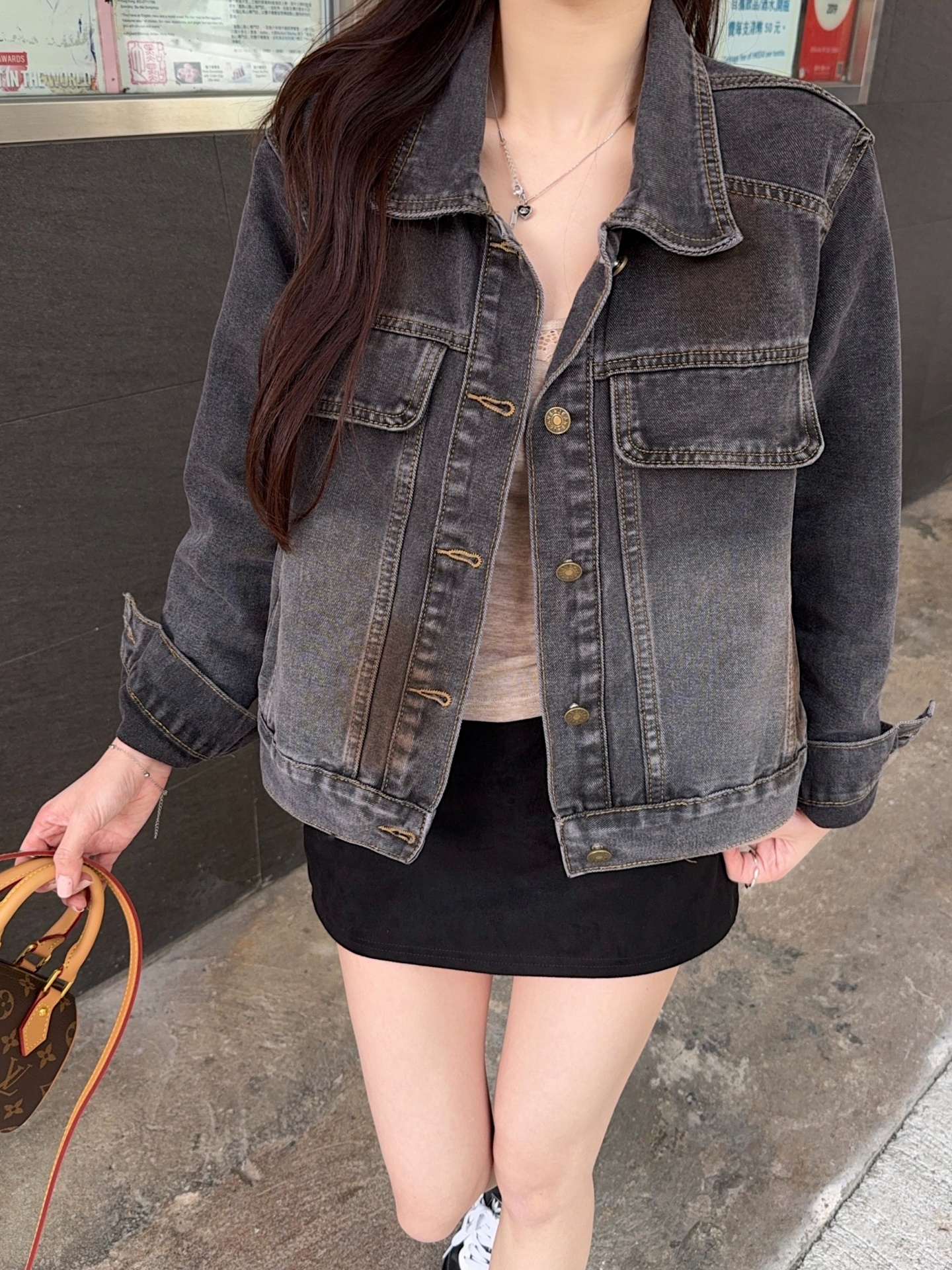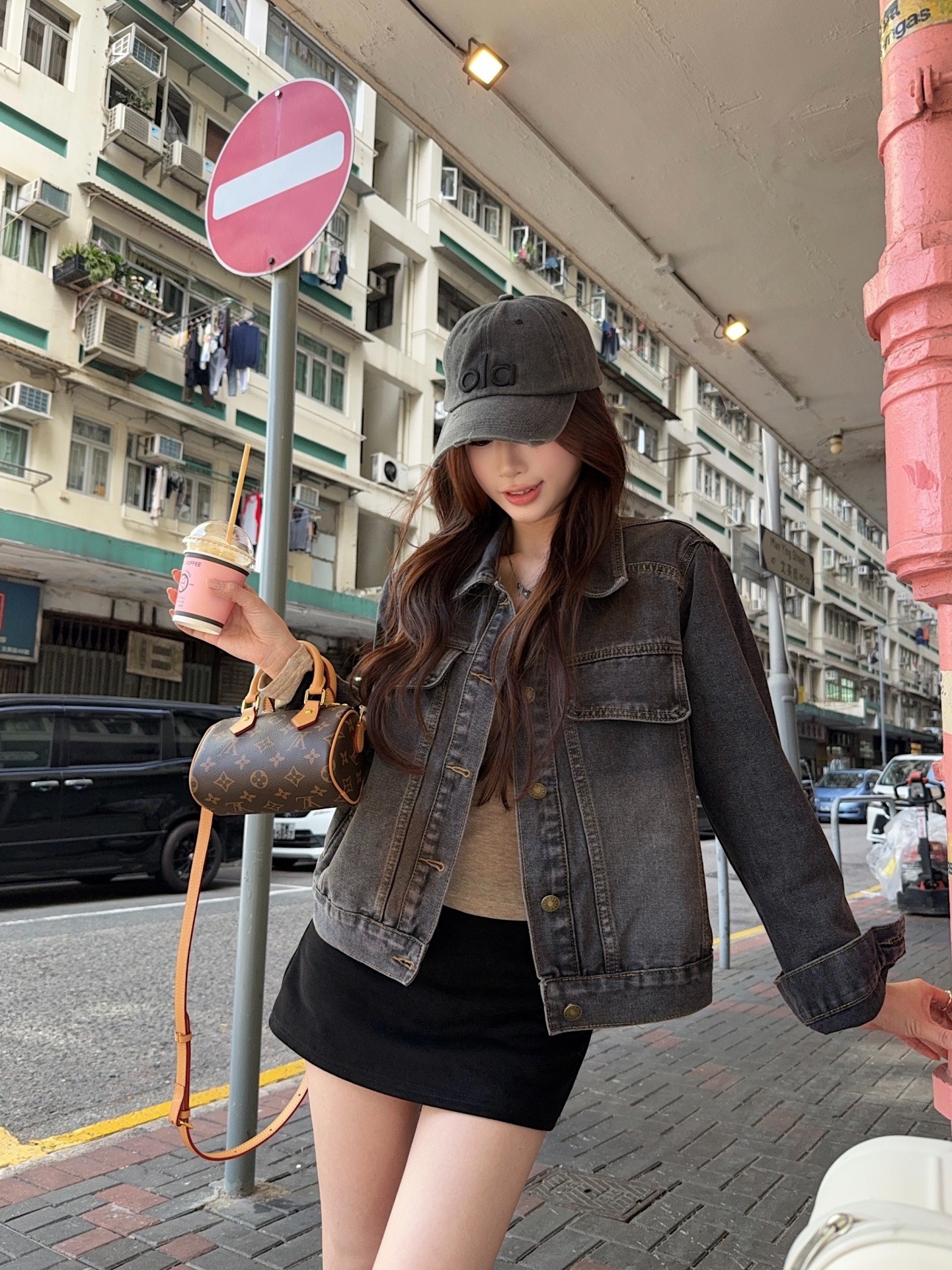 실사 검정색 데님 작은 대중 디자인 섹션 쇼트 스타일 루즈핏 데님 재킷