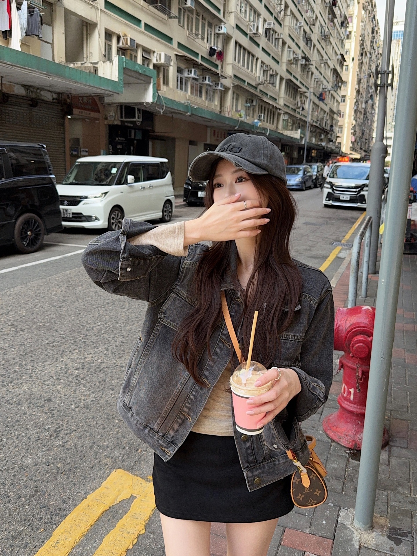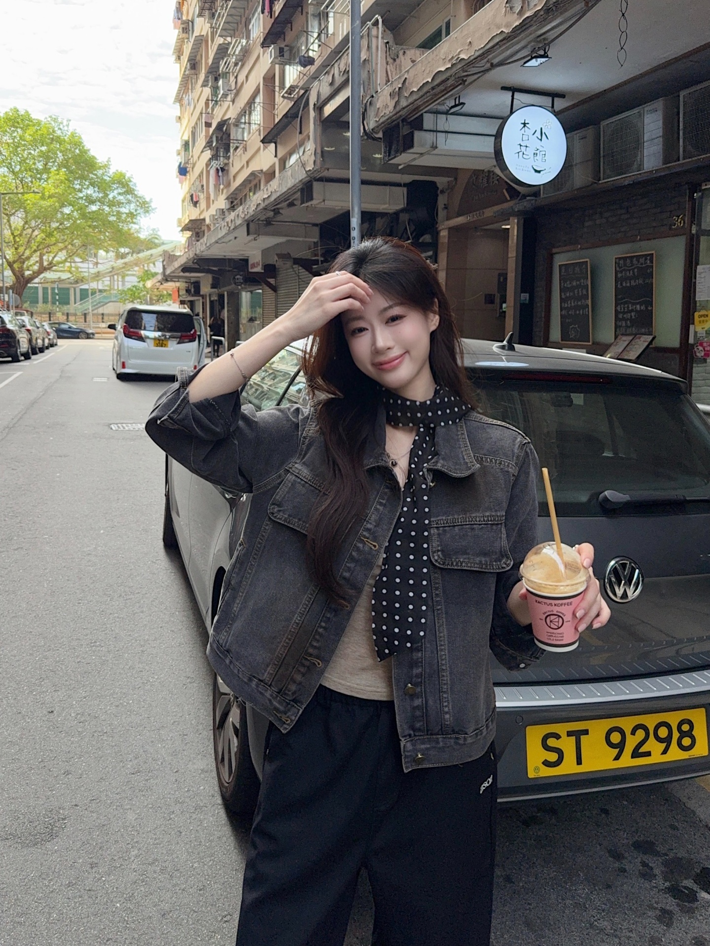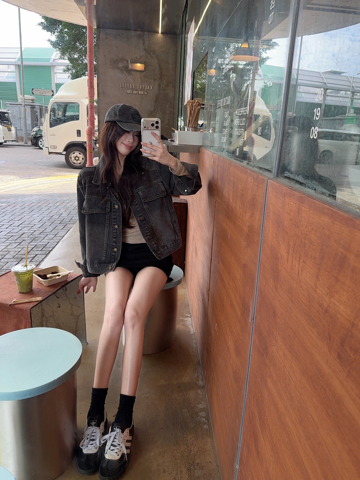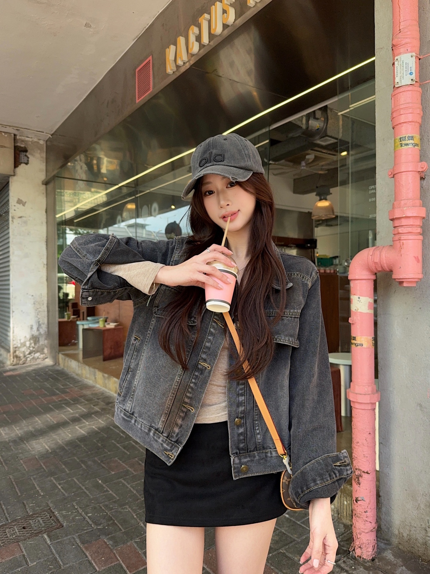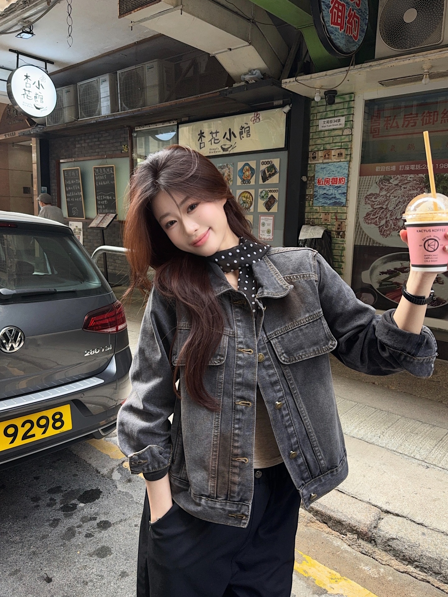 실사 검정색 데님 작은 대중 디자인 섹션 쇼트 스타일 루즈핏 데님 재킷