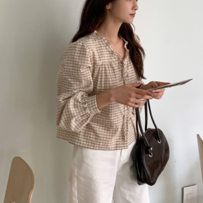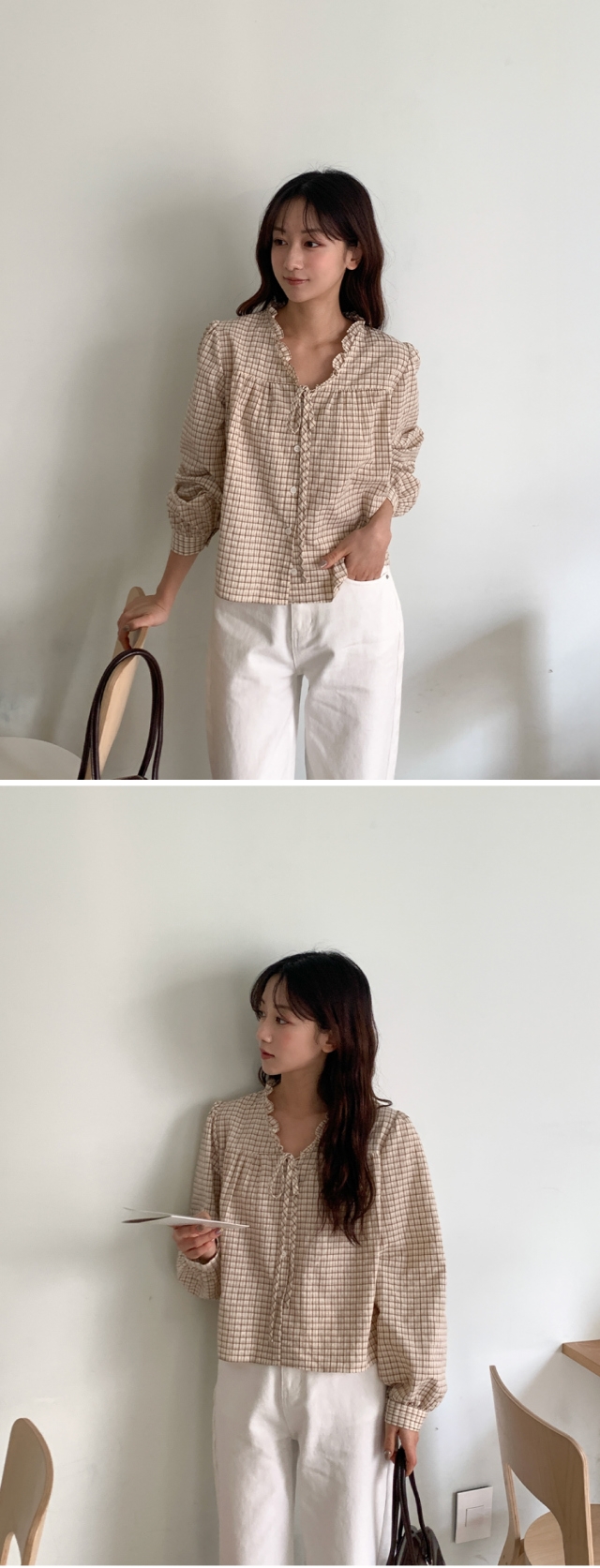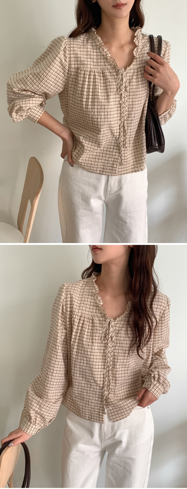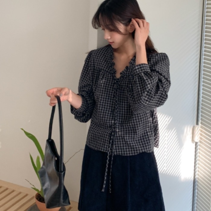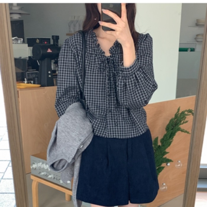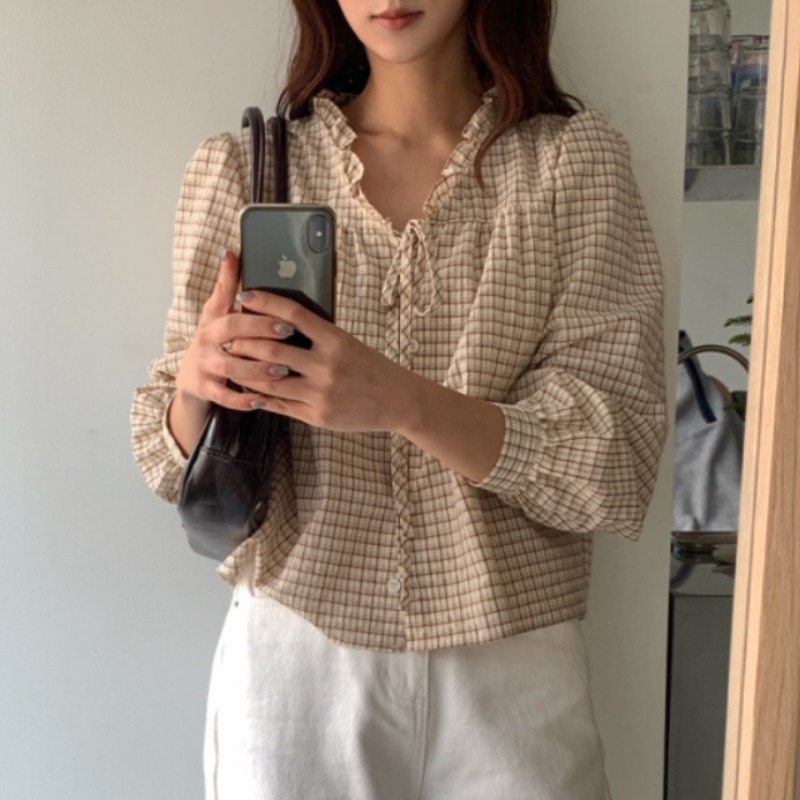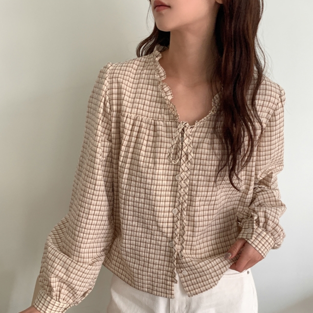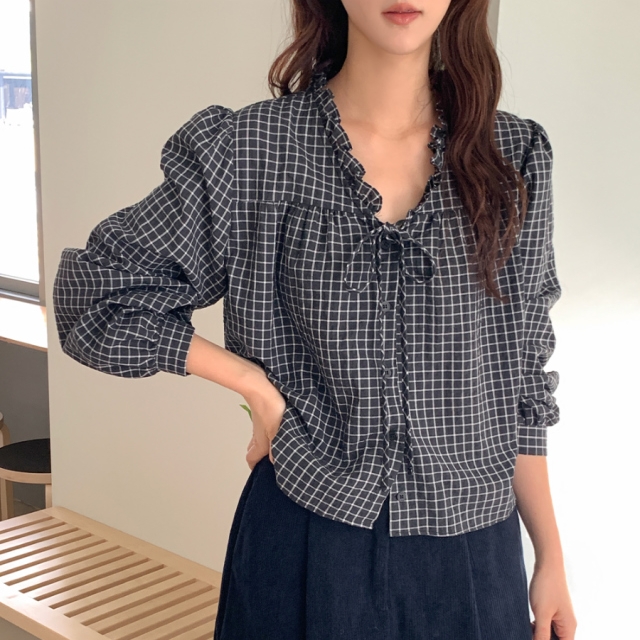 한국 스타일 레트로 체크무늬 연꽃 잎 레이스 루즈핏 V넥 레이스 업 셔츠 달콤함 외국 가스 긴팔 자외선 차단 셔츠 맨위