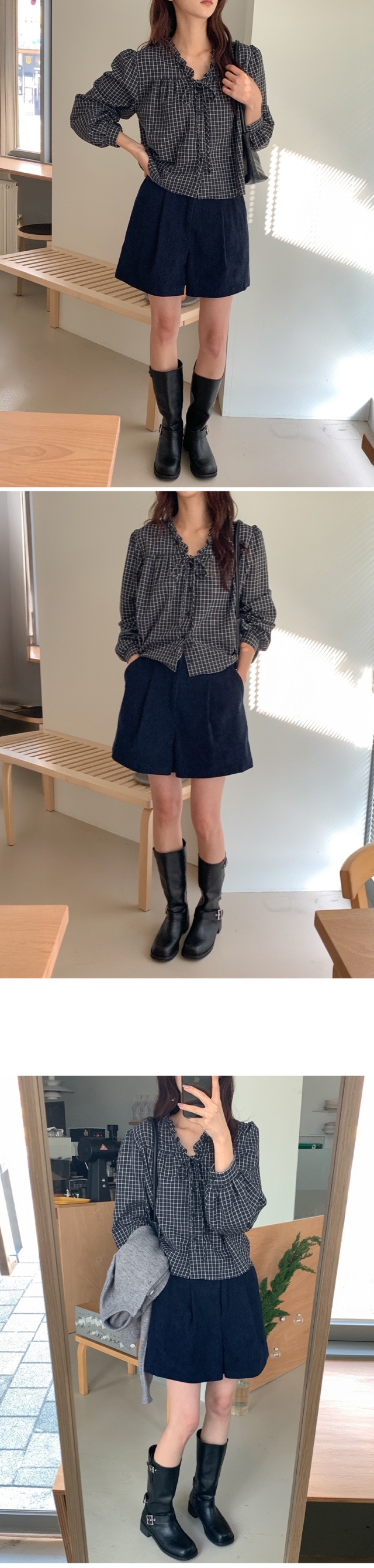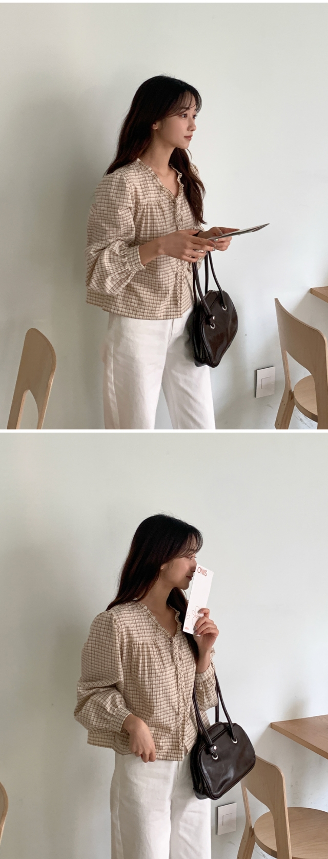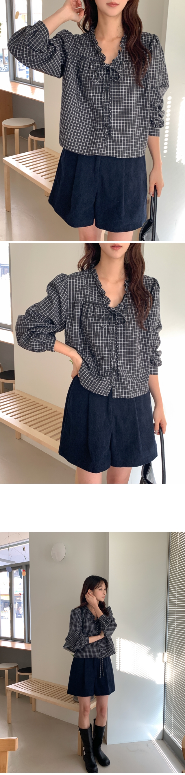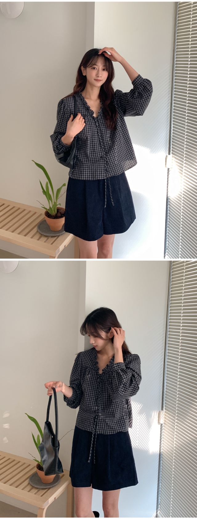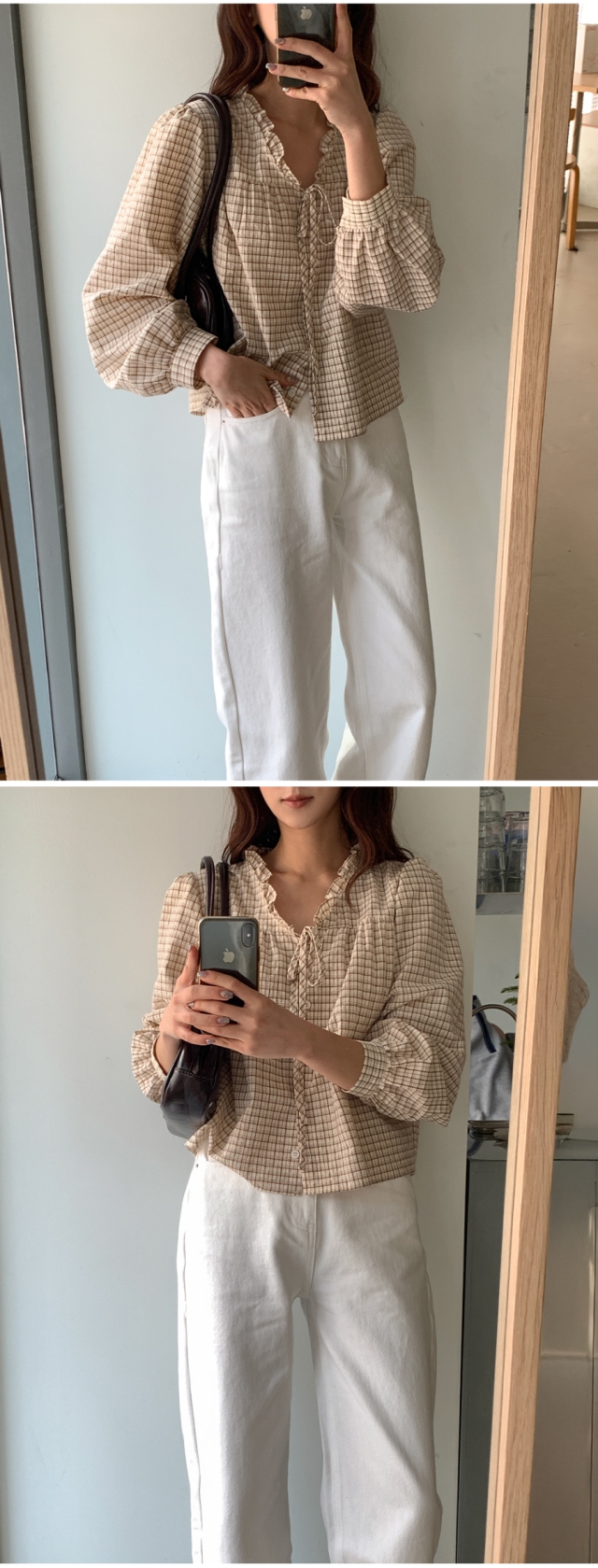 한국 스타일 레트로 체크무늬 연꽃 잎 레이스 루즈핏 V넥 레이스 업 셔츠 달콤함 외국 가스 긴팔 자외선 차단 셔츠 맨위