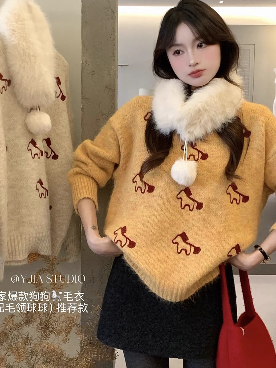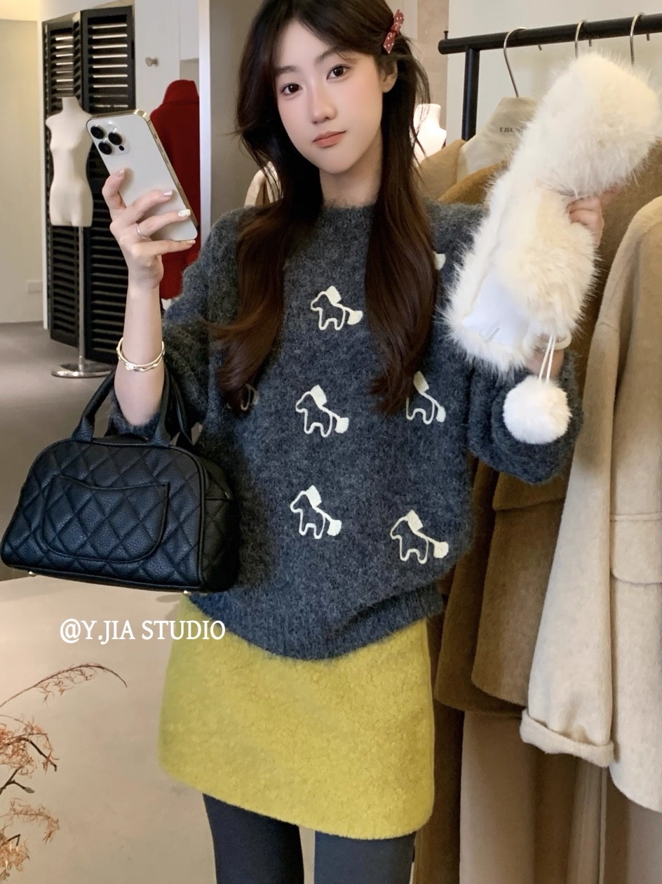 시끄러운 홈 얕은 살구 색상 두꺼운 자수 작은 말 스웨터 여자 2025 겨울 고급 루즈핏 캐주얼 니트 털실 맨위