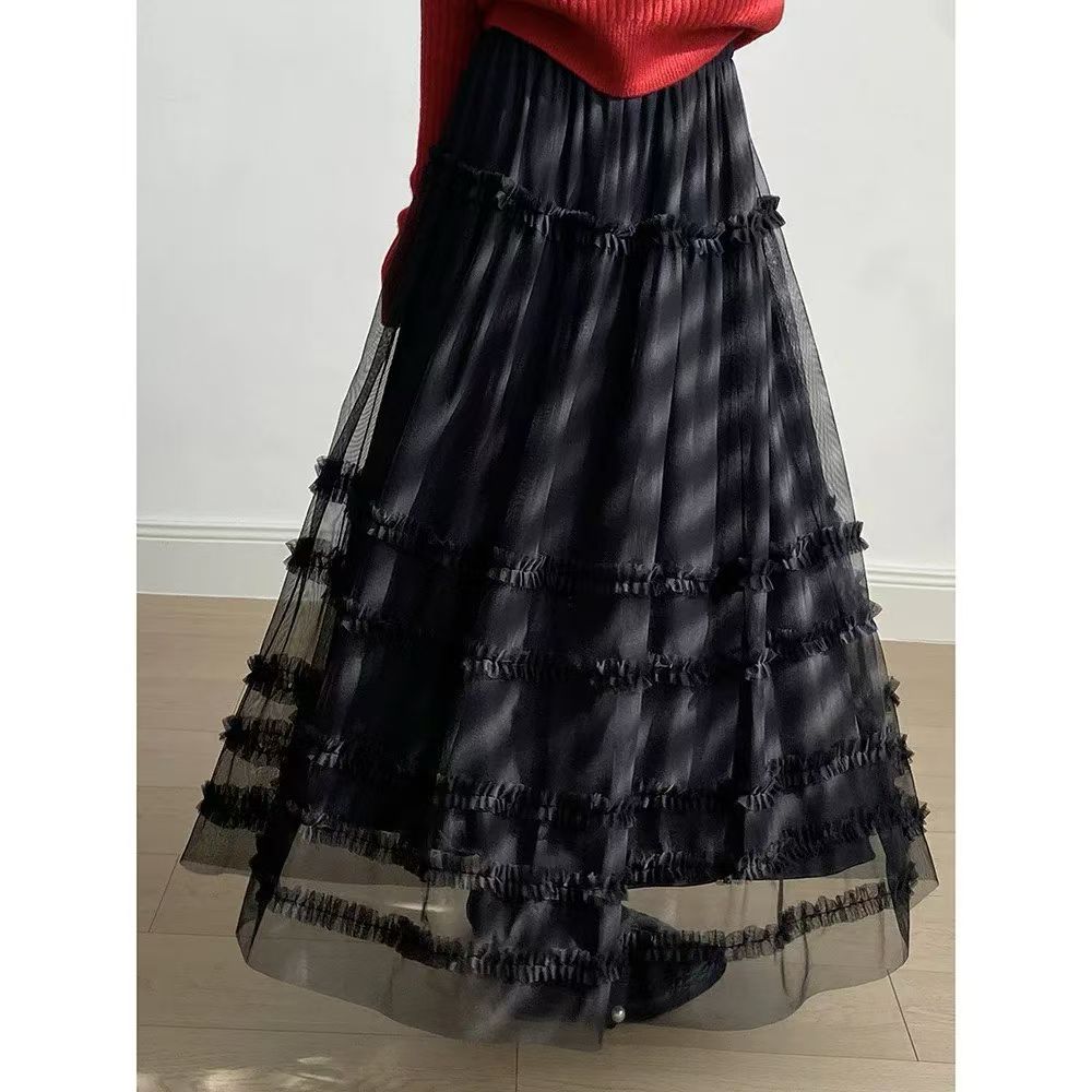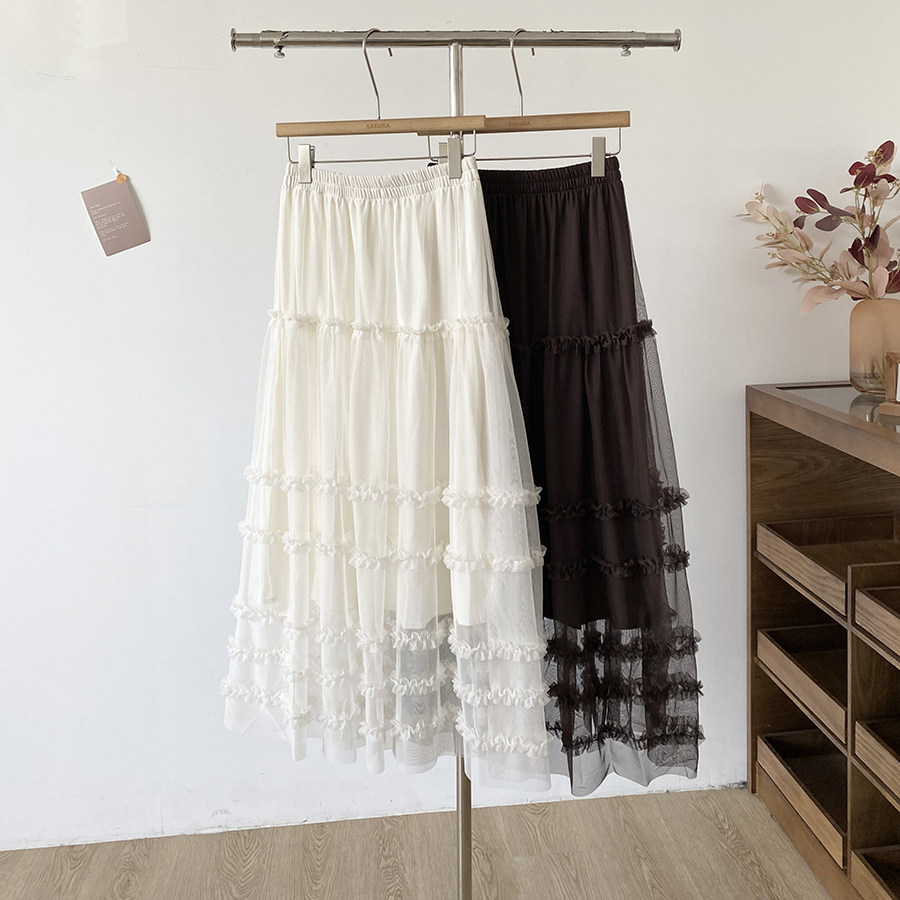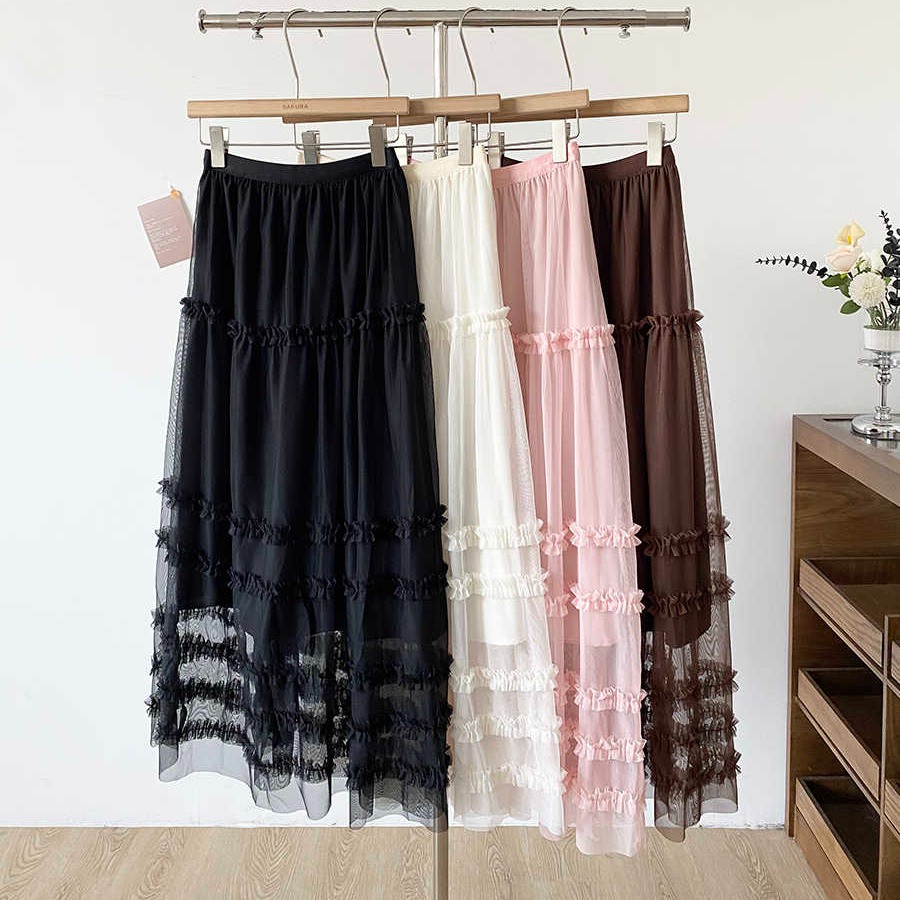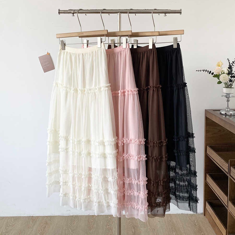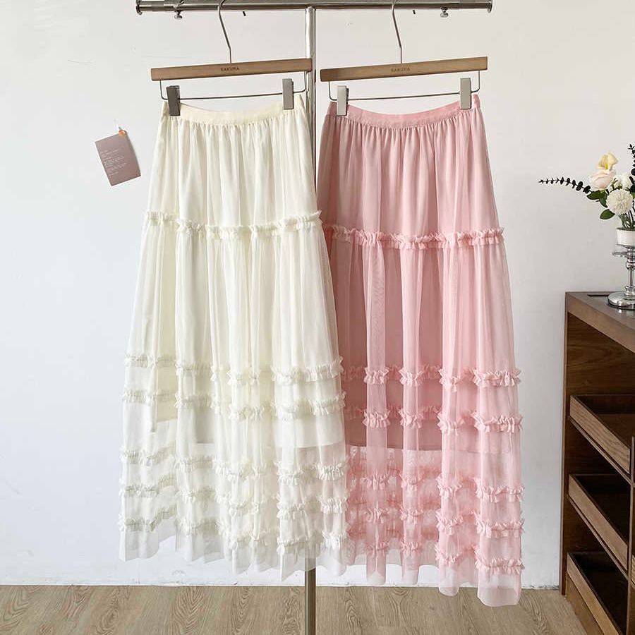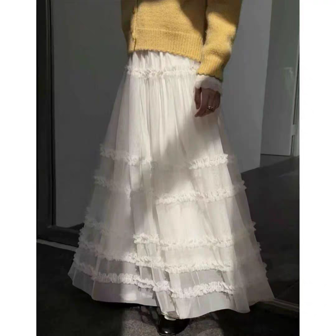 유럽 역 2026 봄 가을 하이웨이스트 망사 목이버섯 레이스 화이트 반신 스커트 여성 케이크 드레스 롱 코트 거즈 스커트