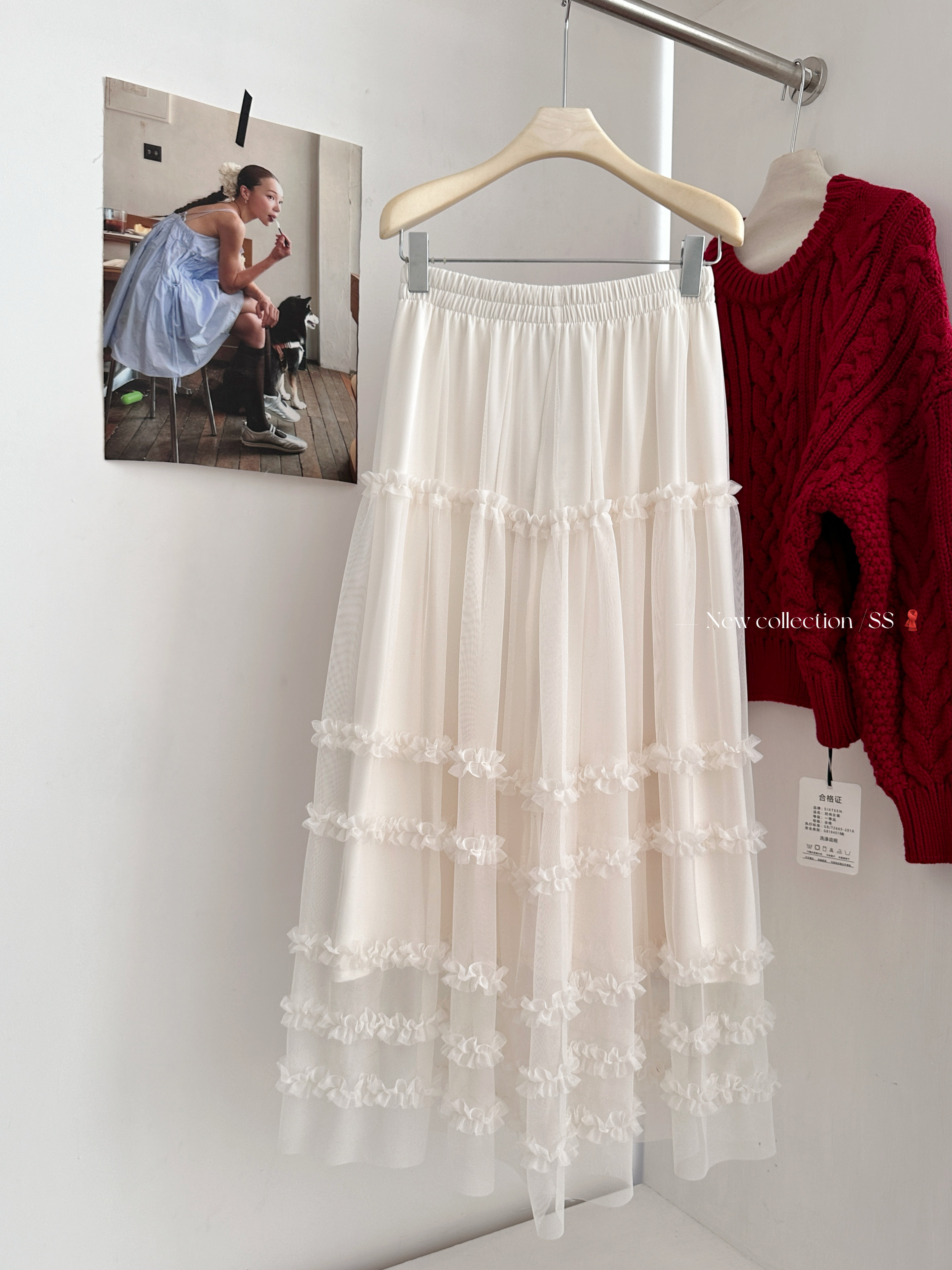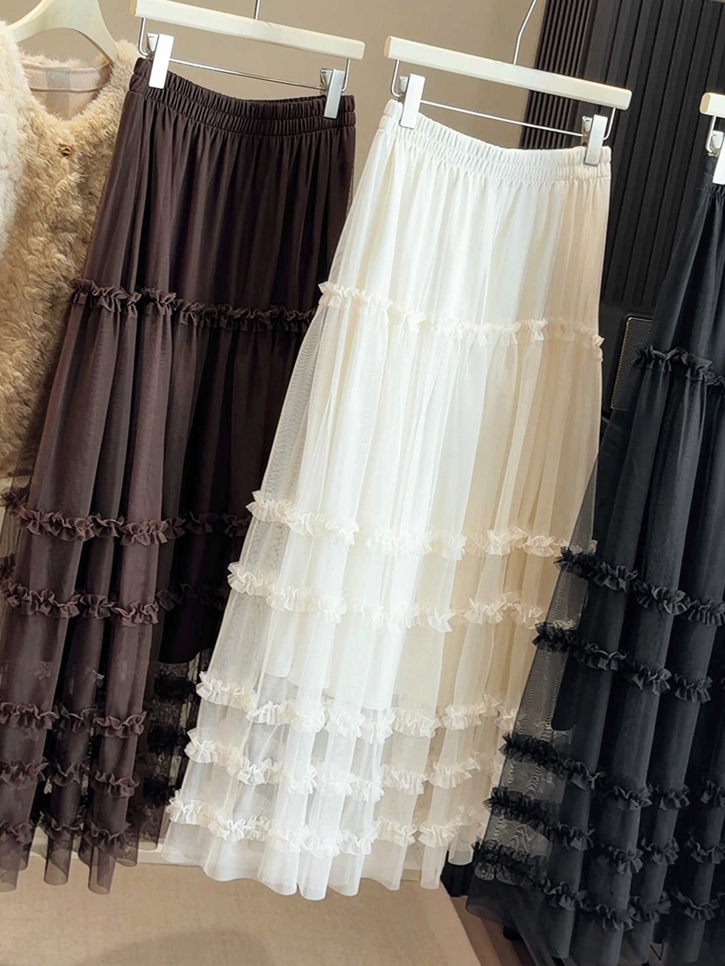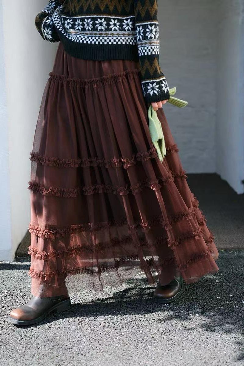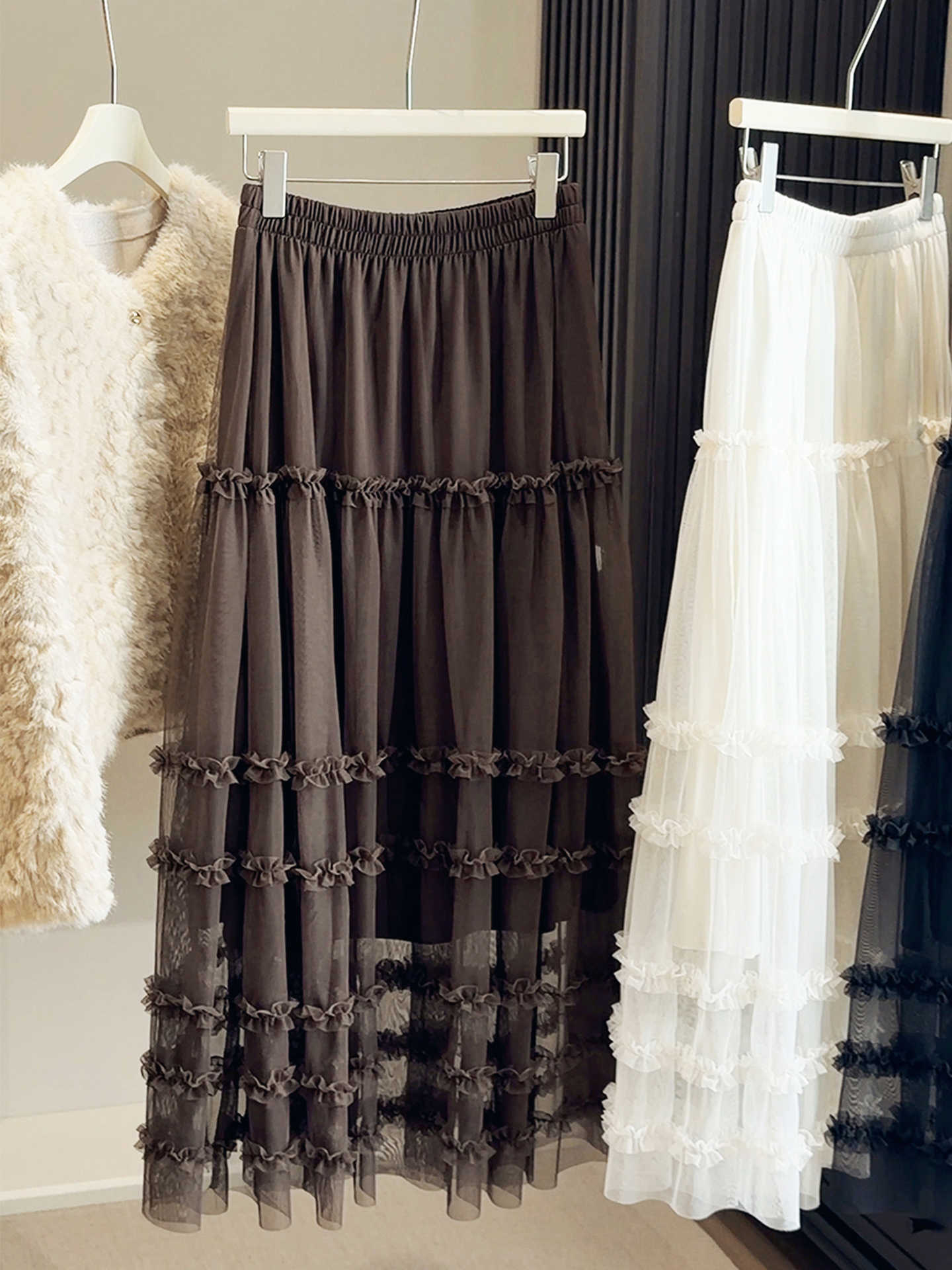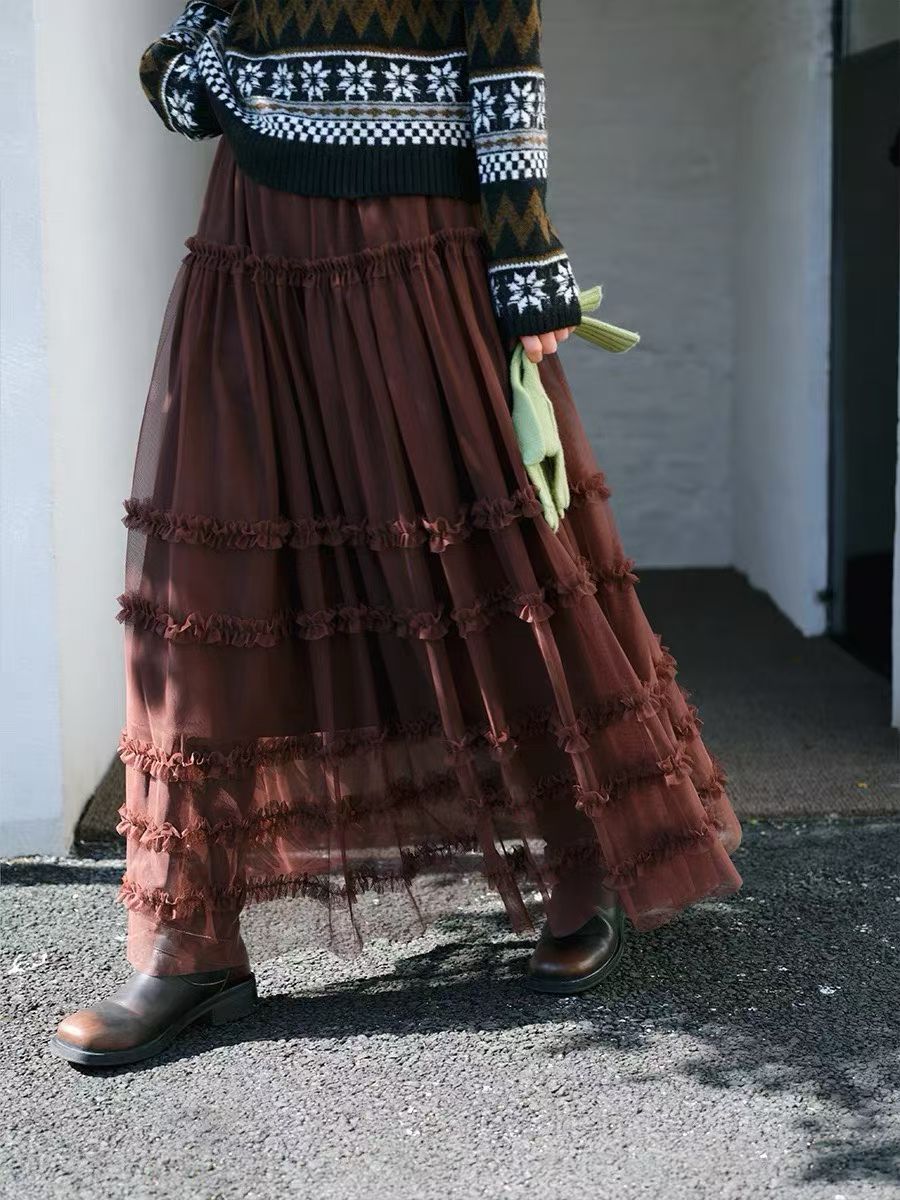 유럽 역 2026 봄 가을 하이웨이스트 망사 목이버섯 레이스 화이트 반신 스커트 여성 케이크 드레스 롱 코트 거즈 스커트