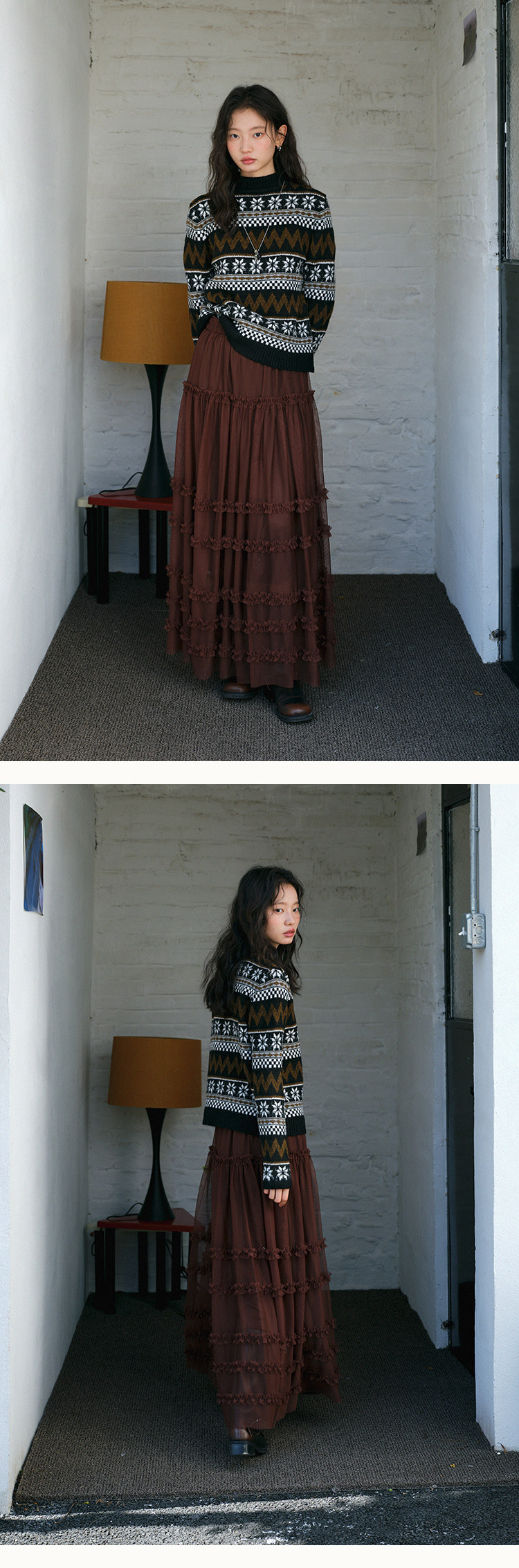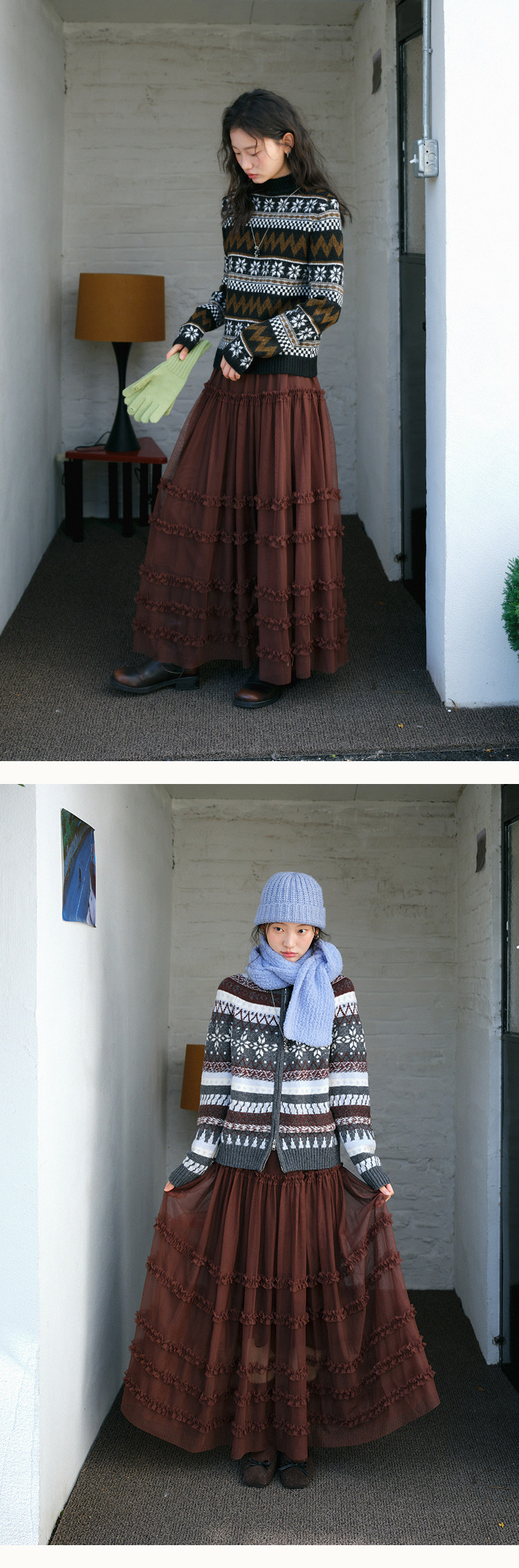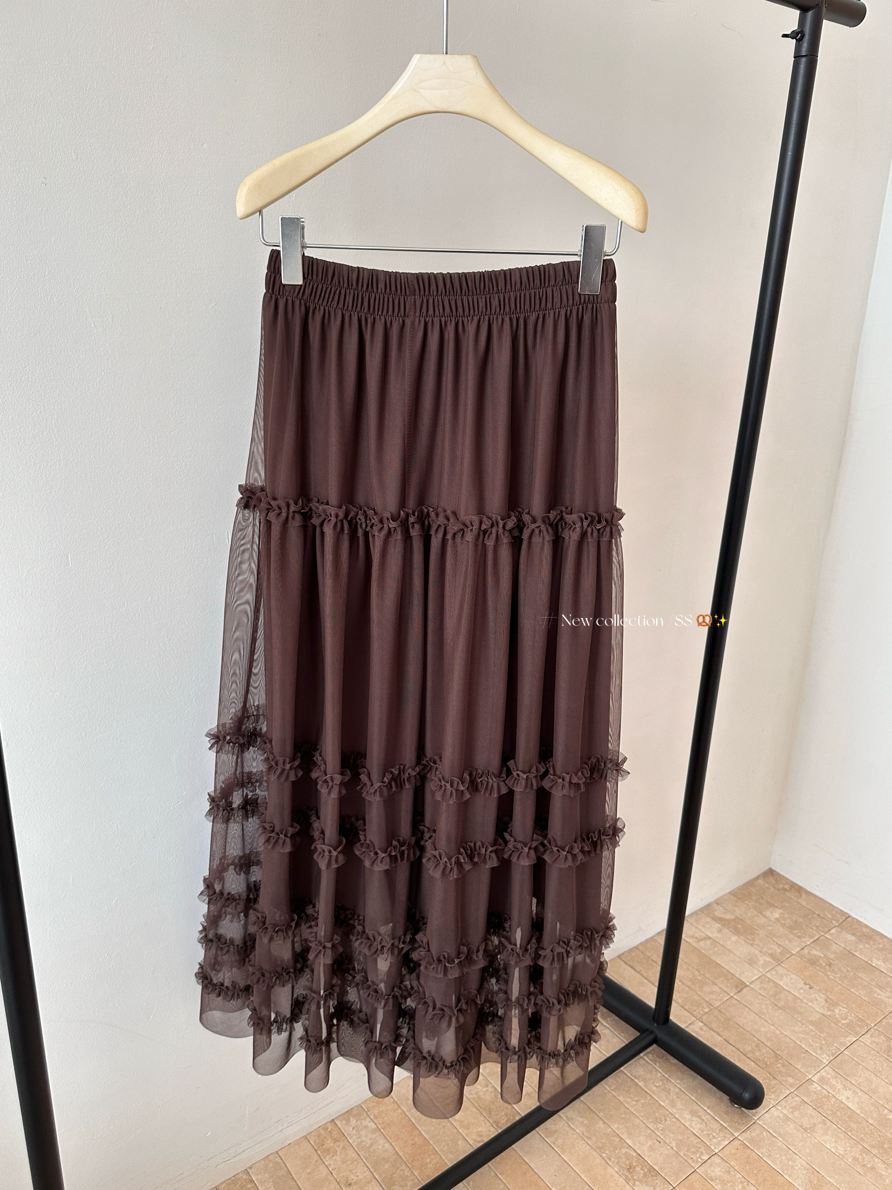 스와 수면 불규칙 체크무늬 반신 스커트 2026 가을 새로운 레트로 브라운 허리밴드 도루 센스 쉬폰 롱 스커트