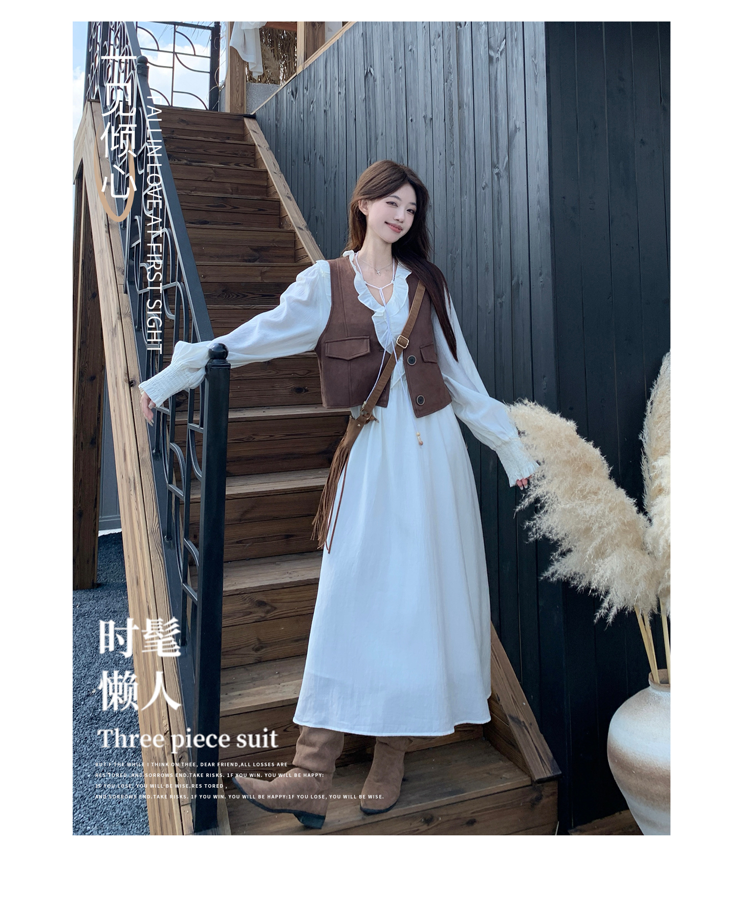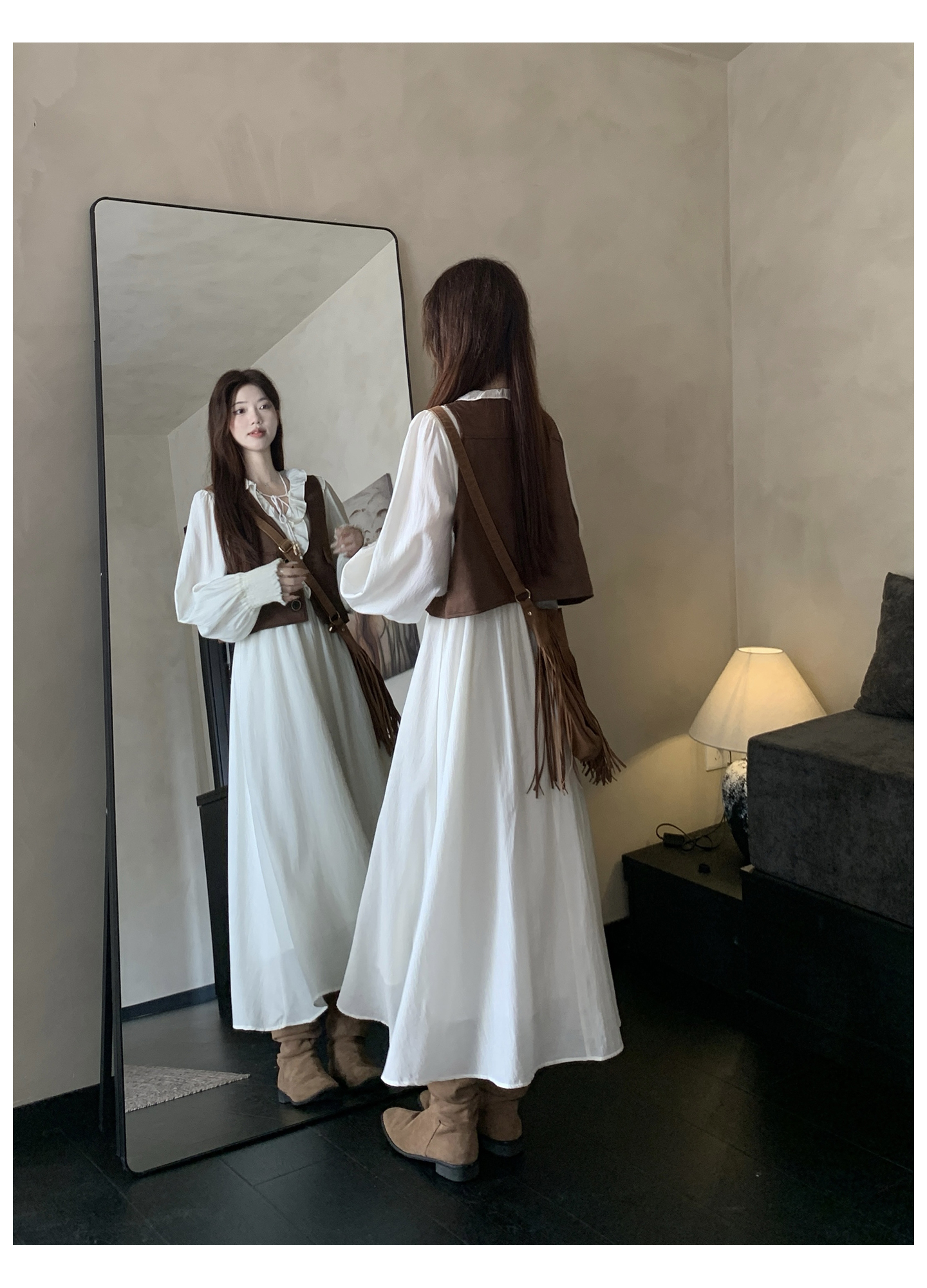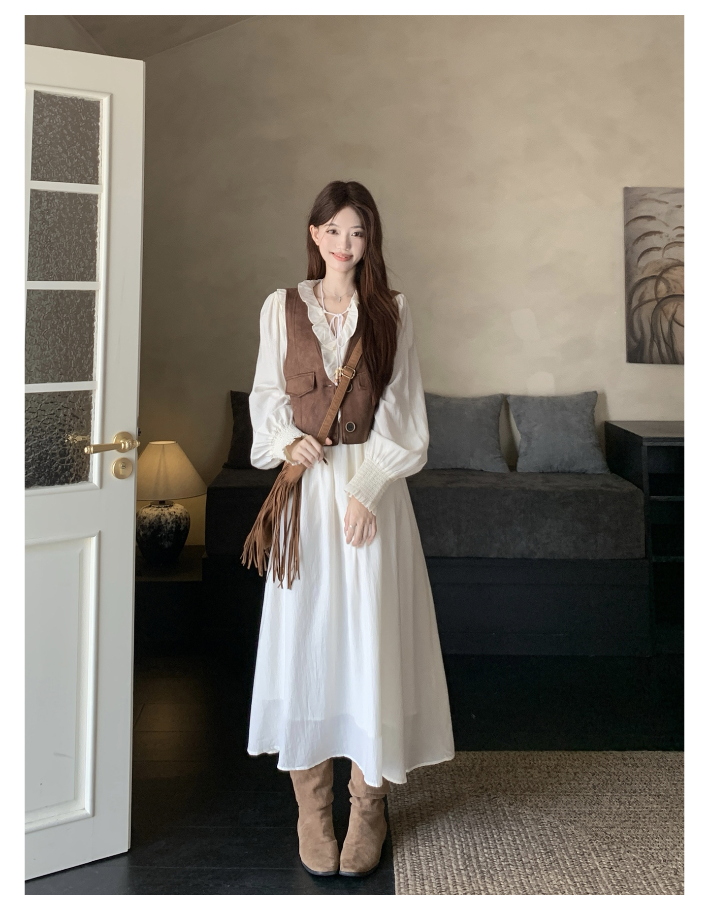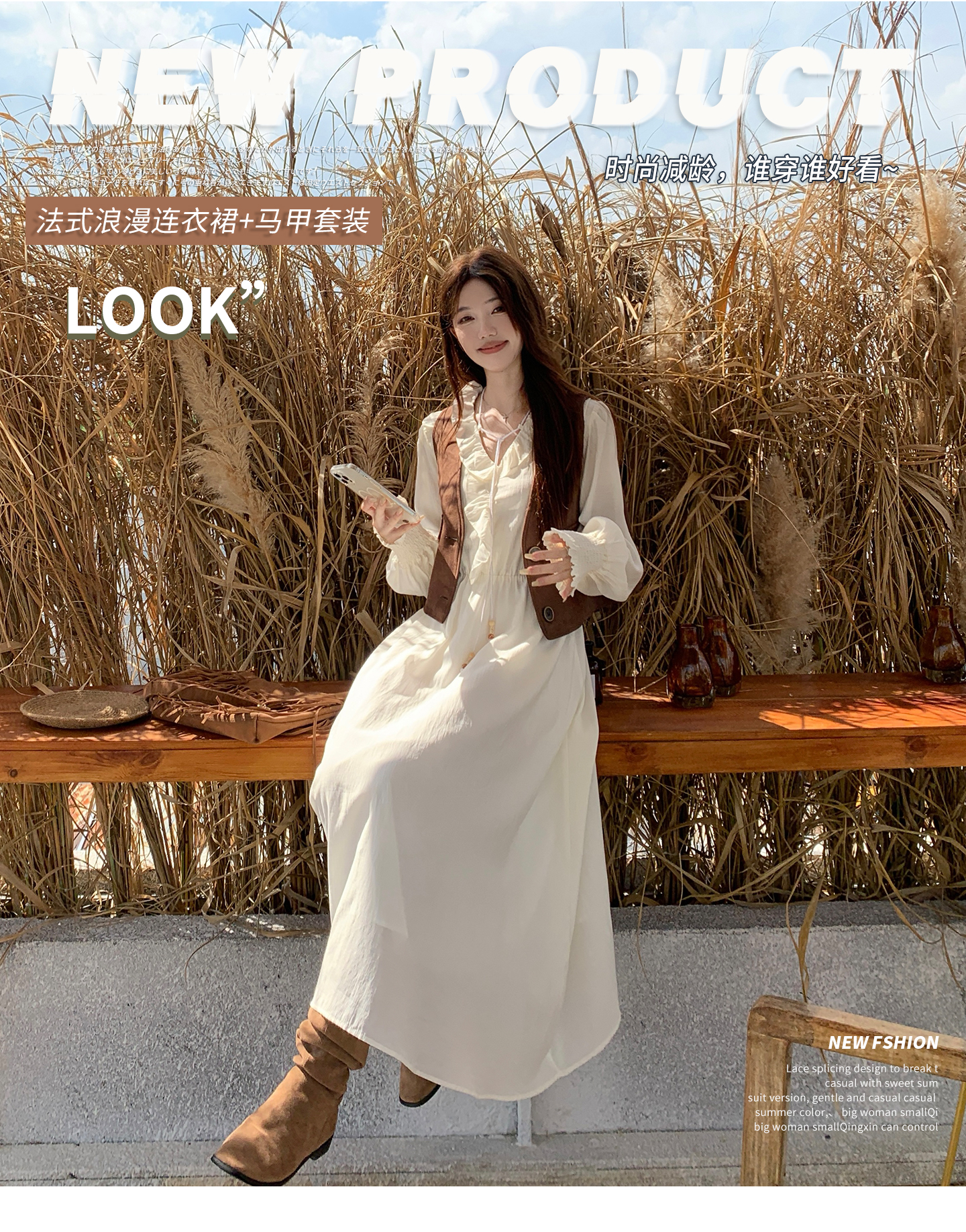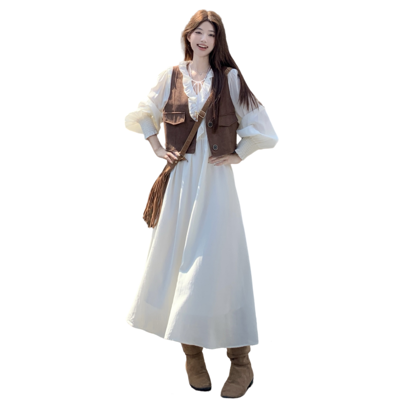 실사 스웨이드 원단 베스트 세트 여성 드레스 봄 한 부서 느긋한 바람 휴가 전원 빅 사이즈 투피스 세트