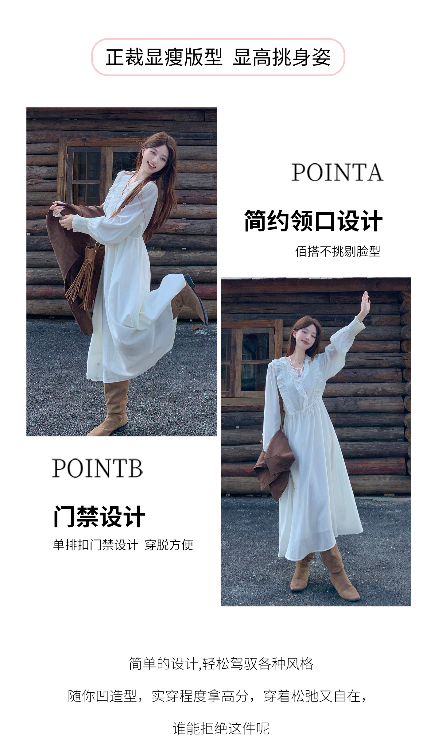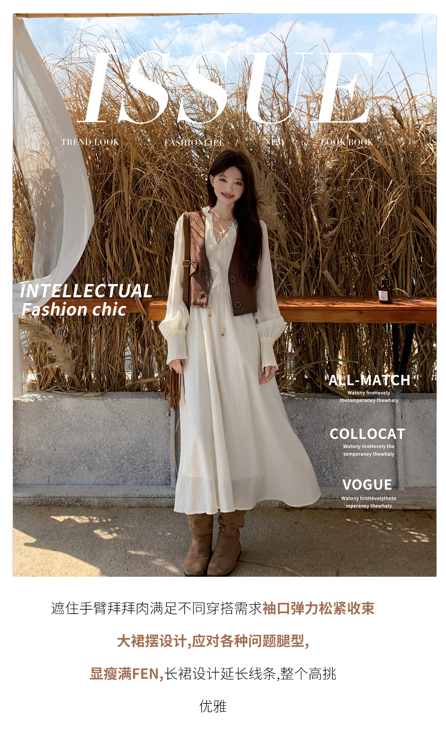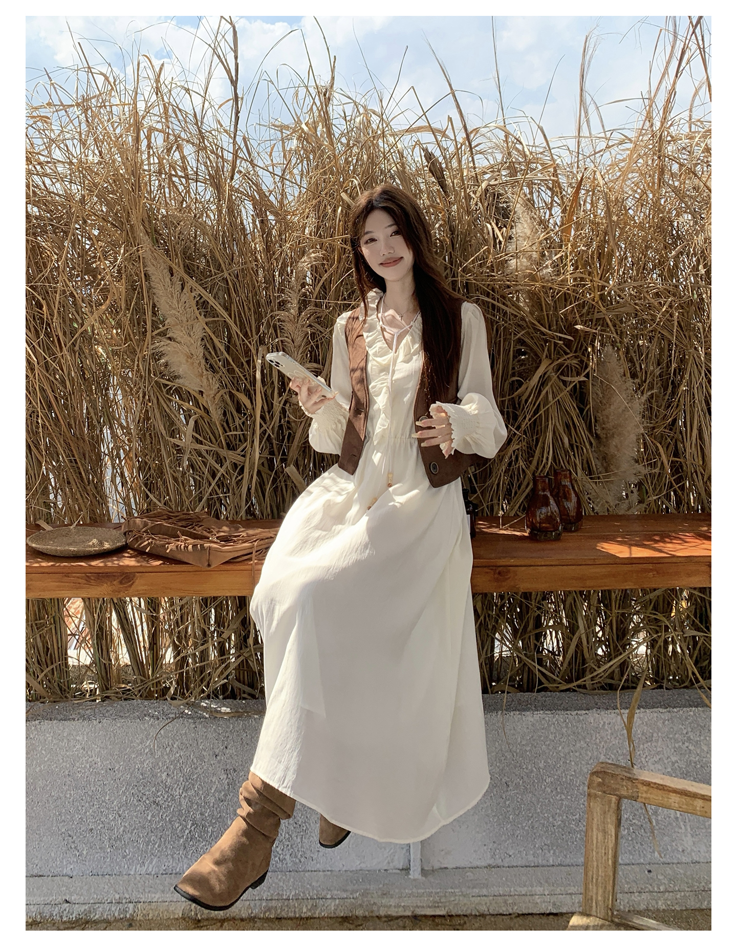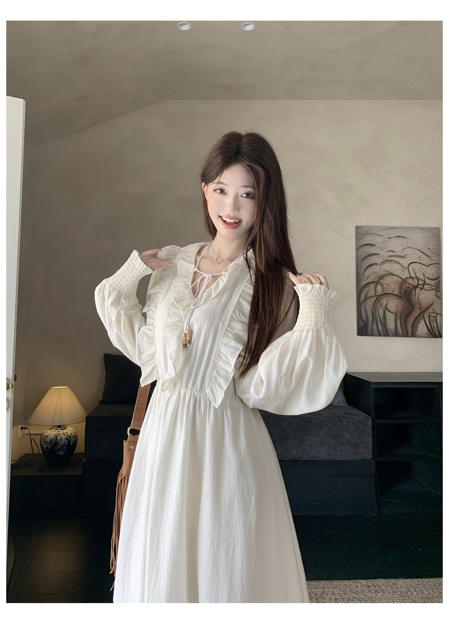 실사 가을 프랑스식 고급 센스 V넥 긴팔 드레스 2026 이른 봄 새로운 아름다운 치마 허리 수축 롱 스커트