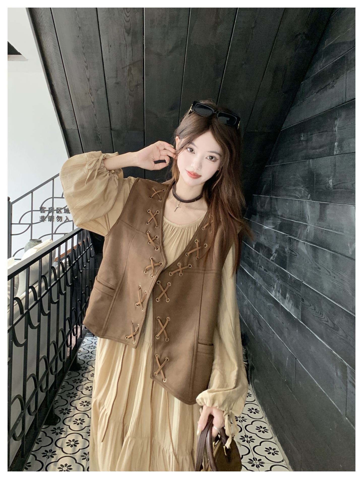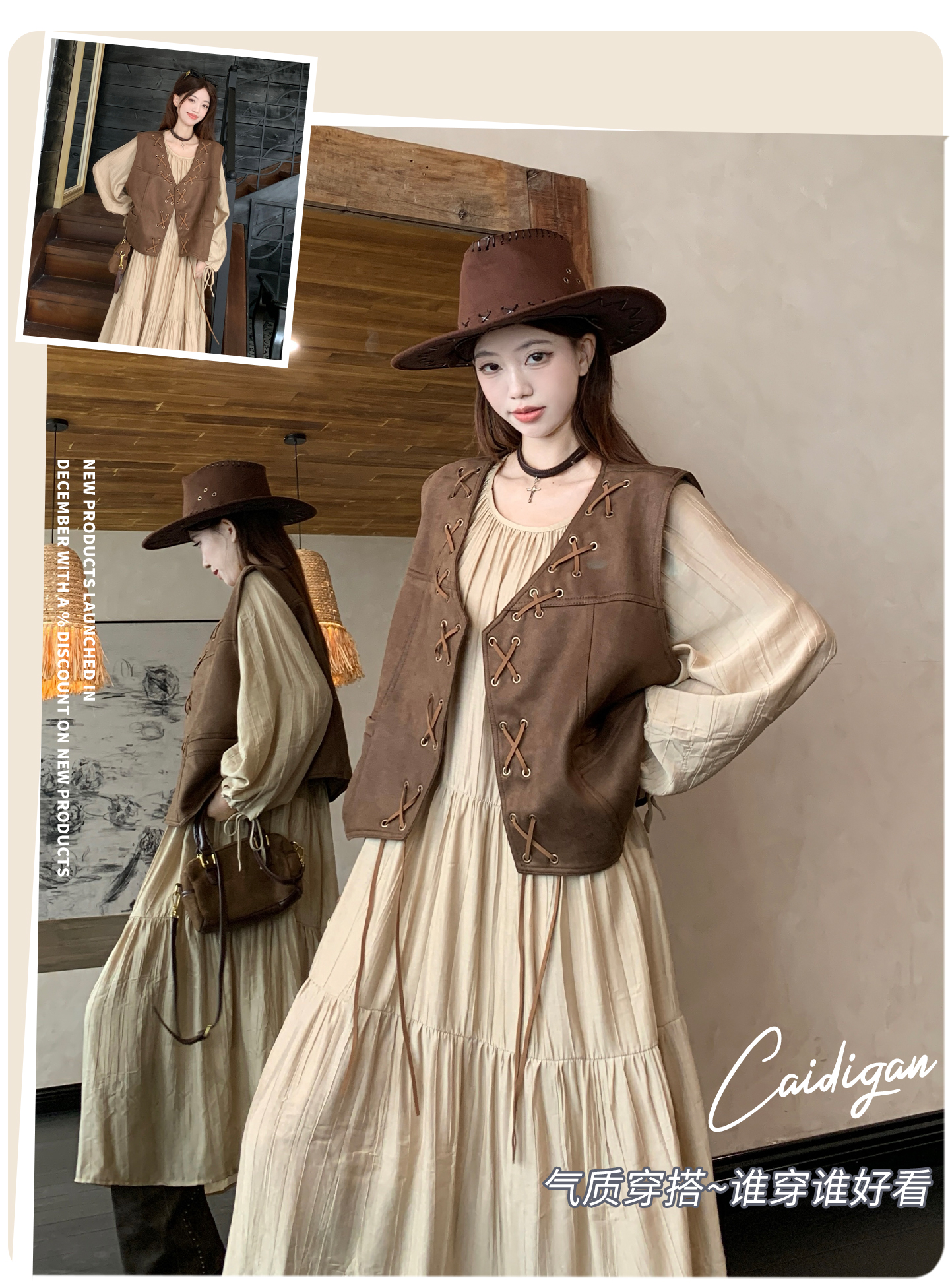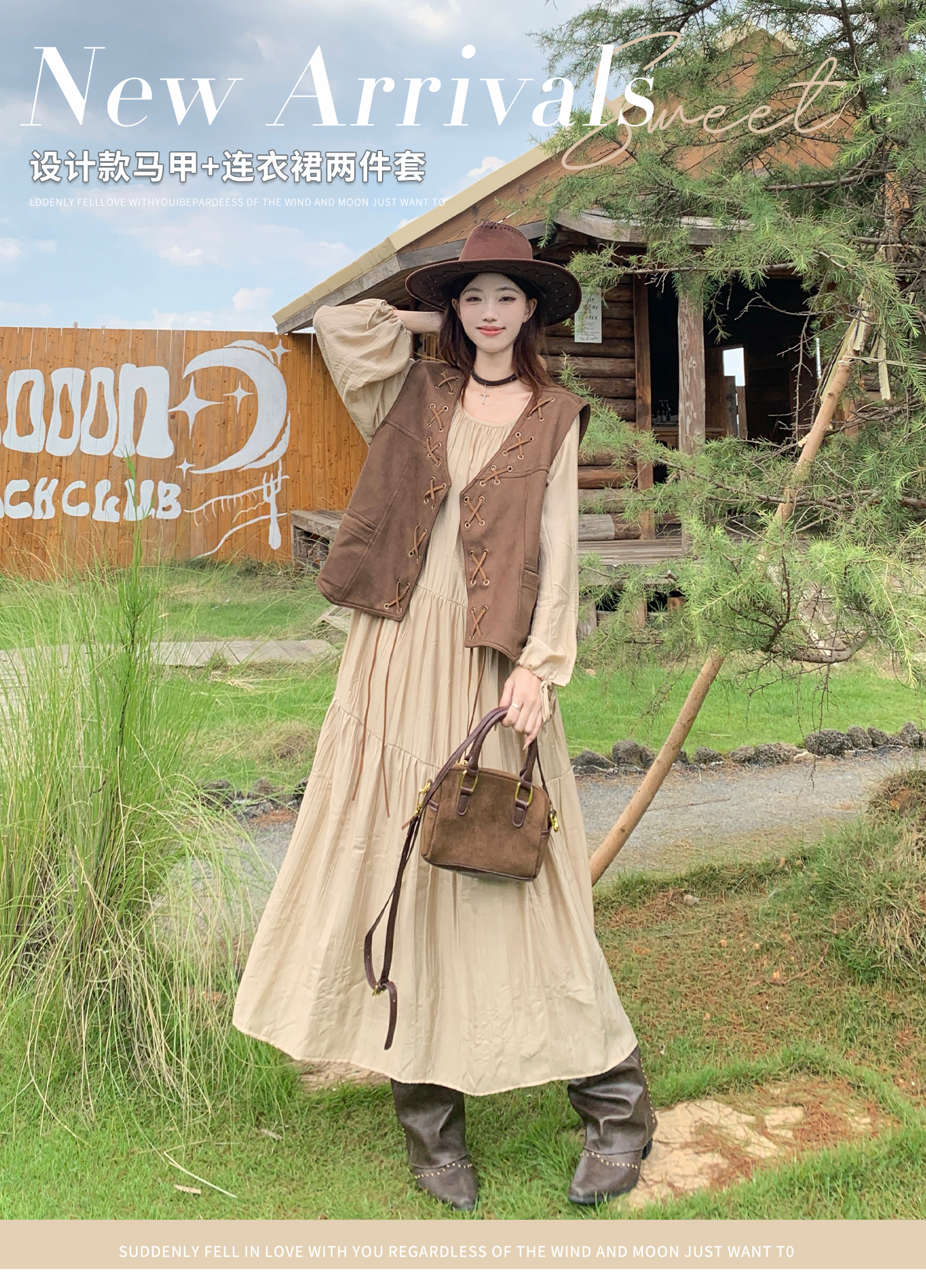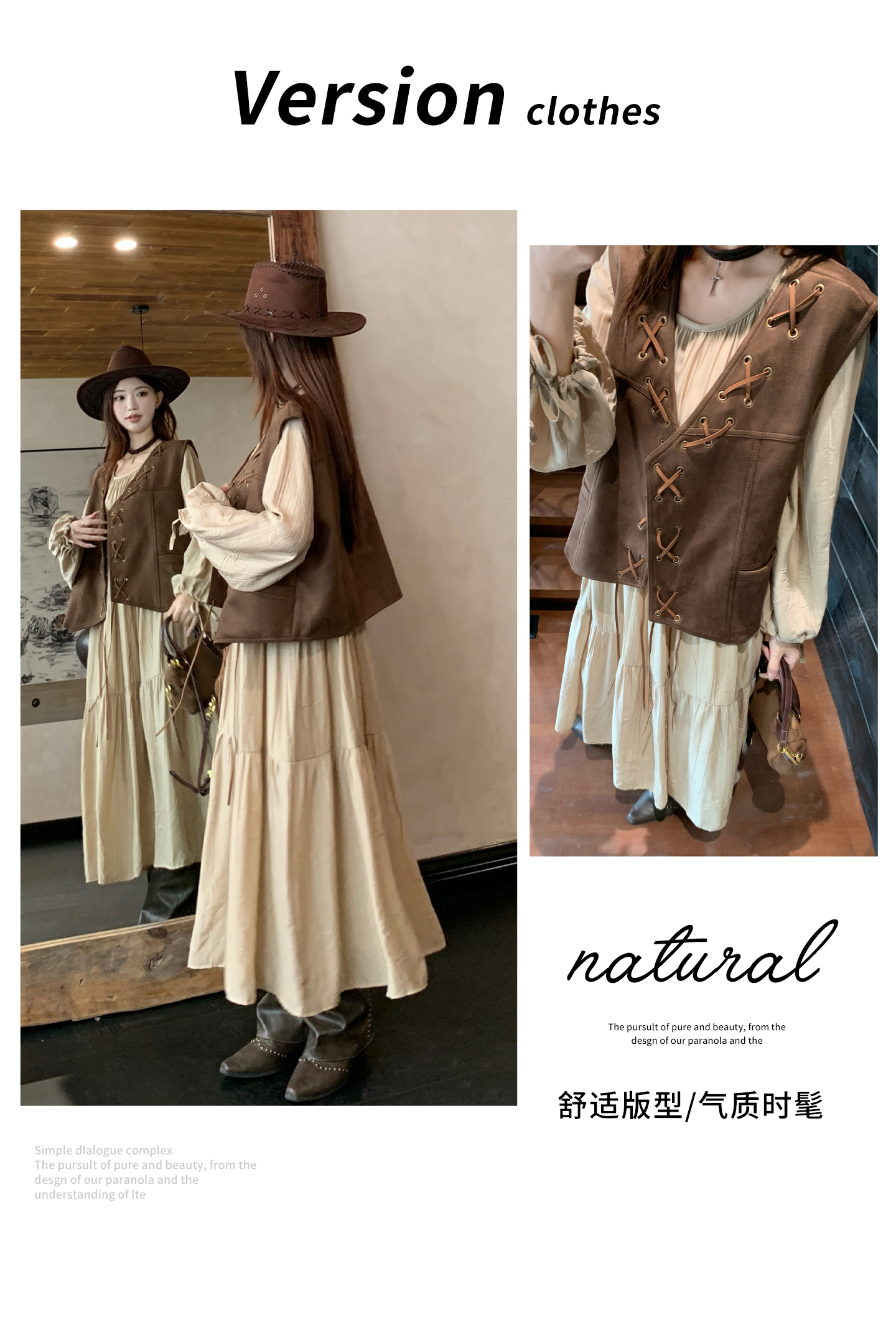 실사 스웨이드 원단 베스트 세트 여성 드레스 봄 한 부서 느긋한 바람 휴가 전원 빅 사이즈 투피스 세트