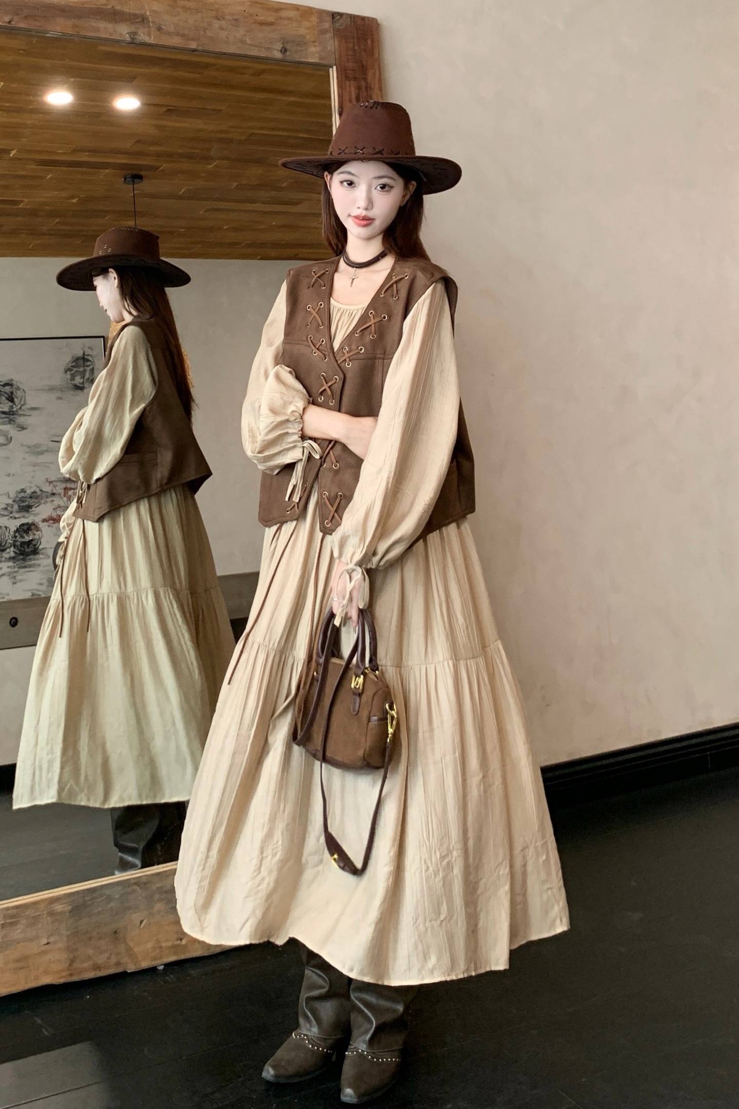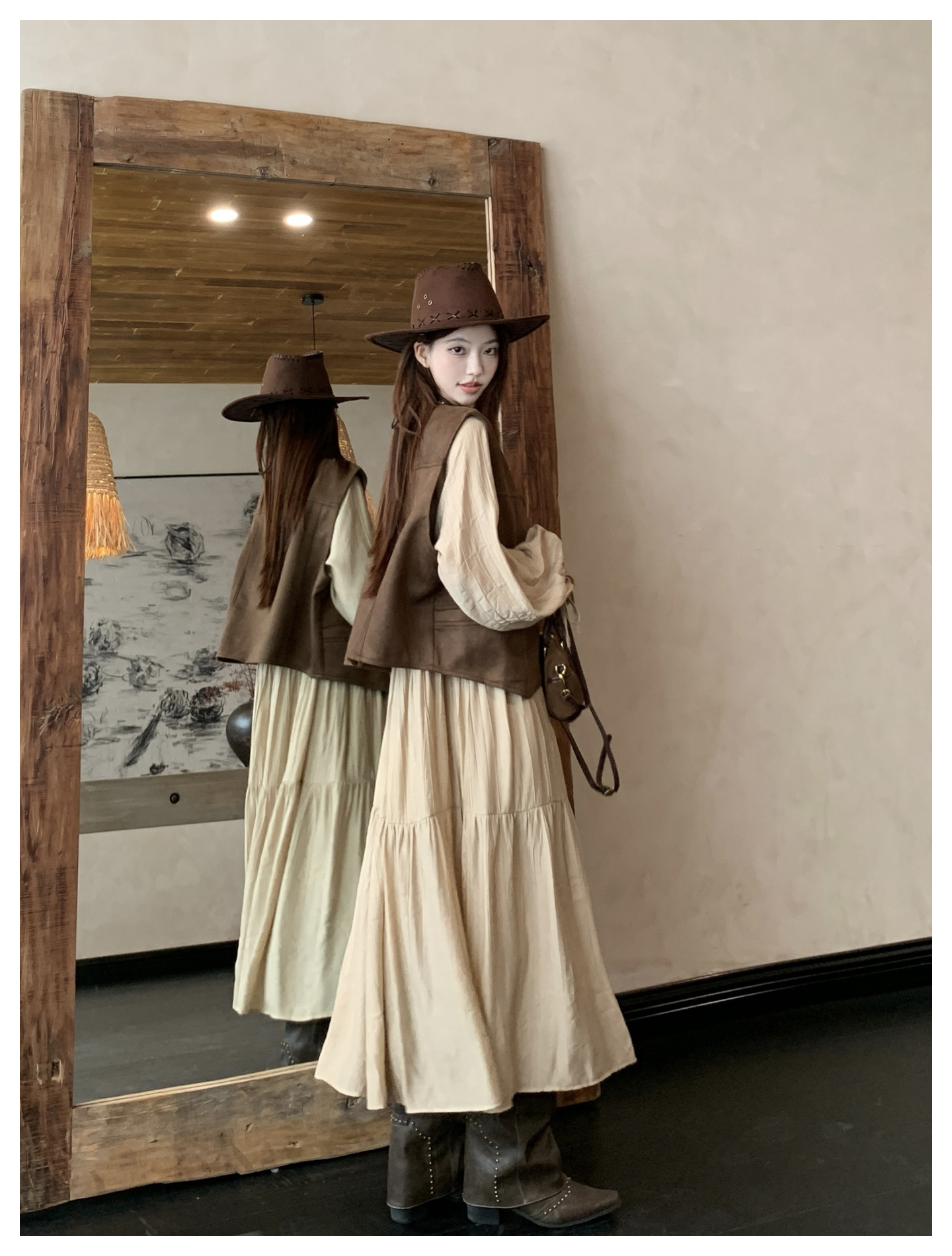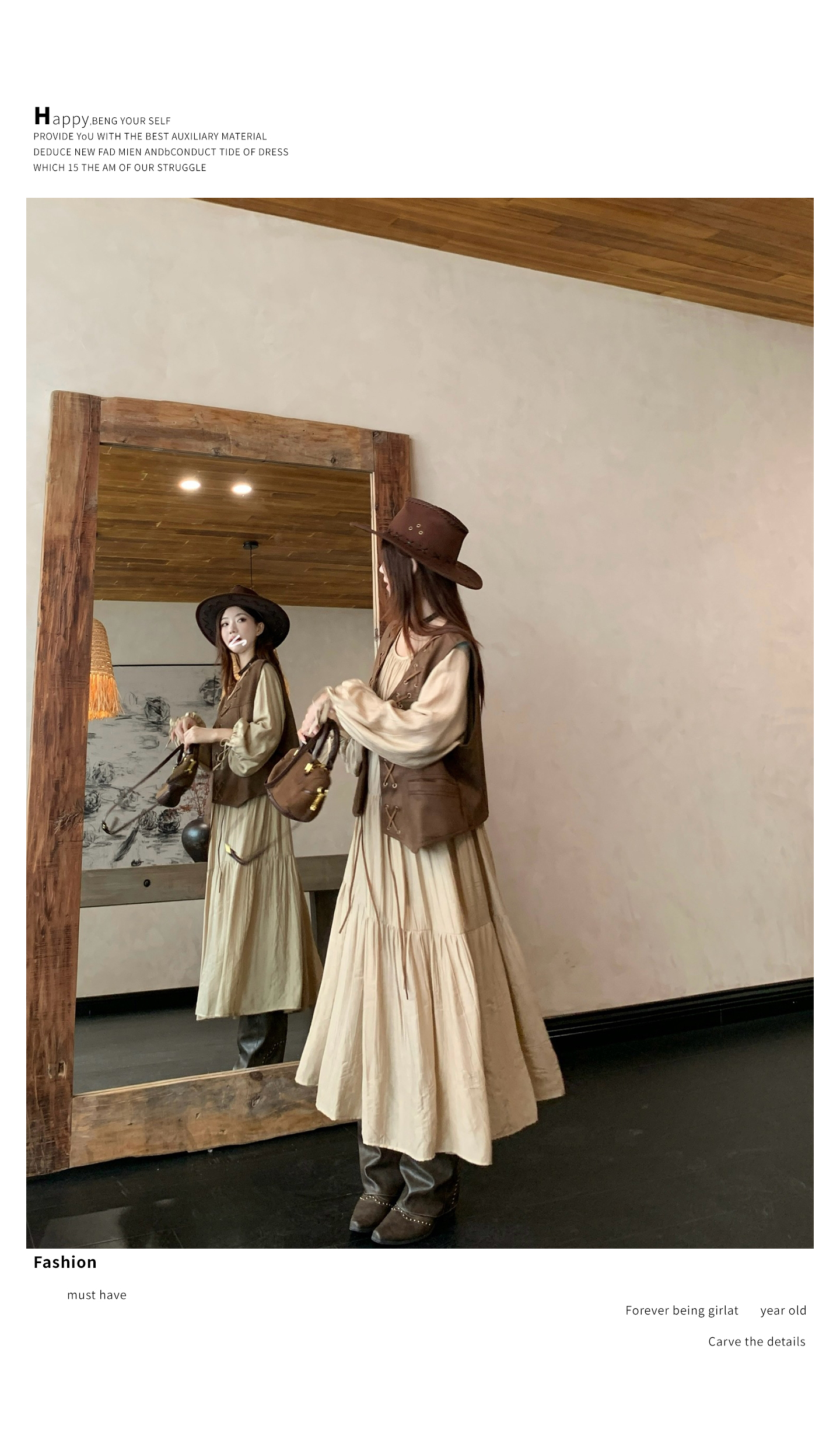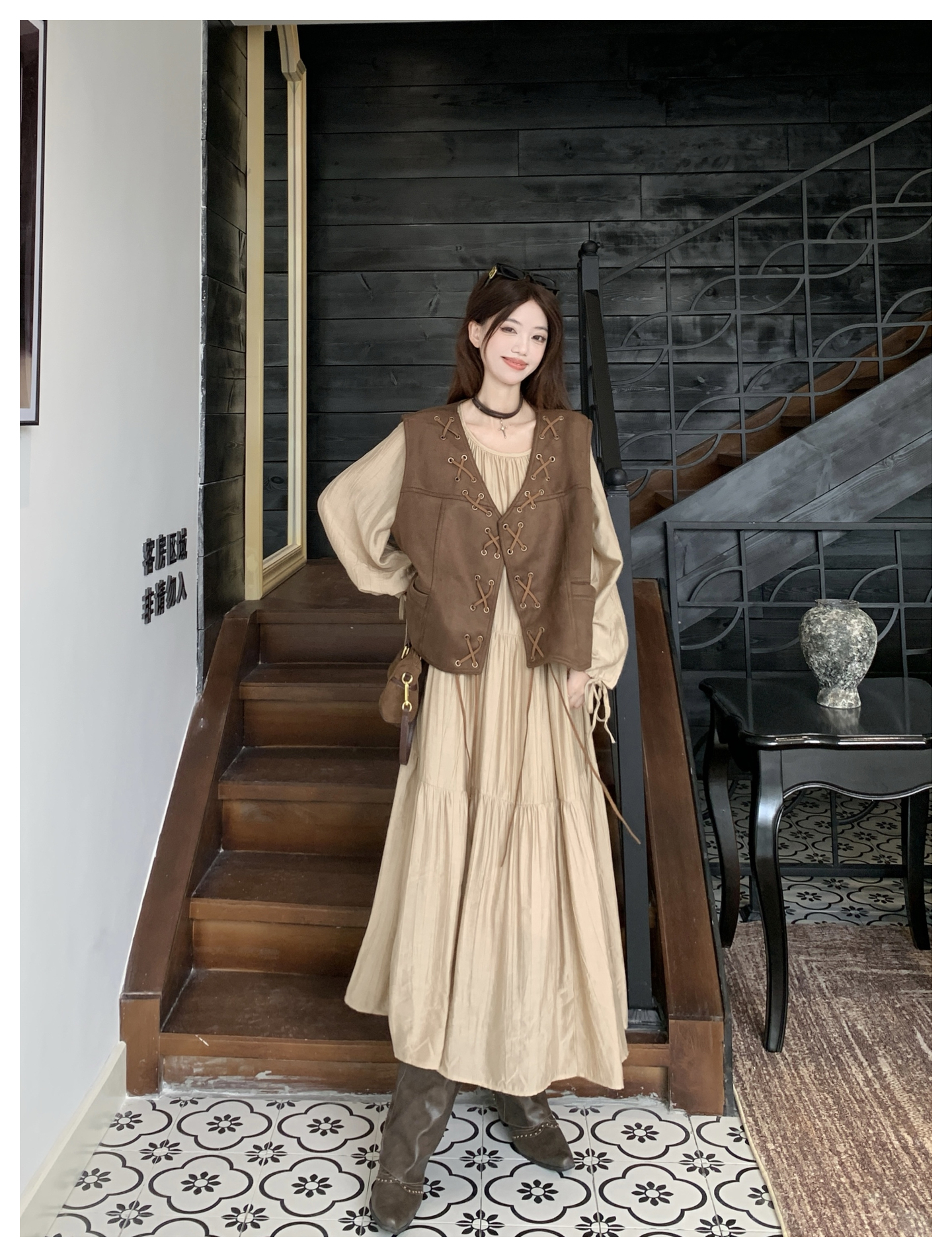 실사 스웨이드 원단 베스트 세트 여성 드레스 봄 한 부서 느긋한 바람 휴가 전원 빅 사이즈 투피스 세트